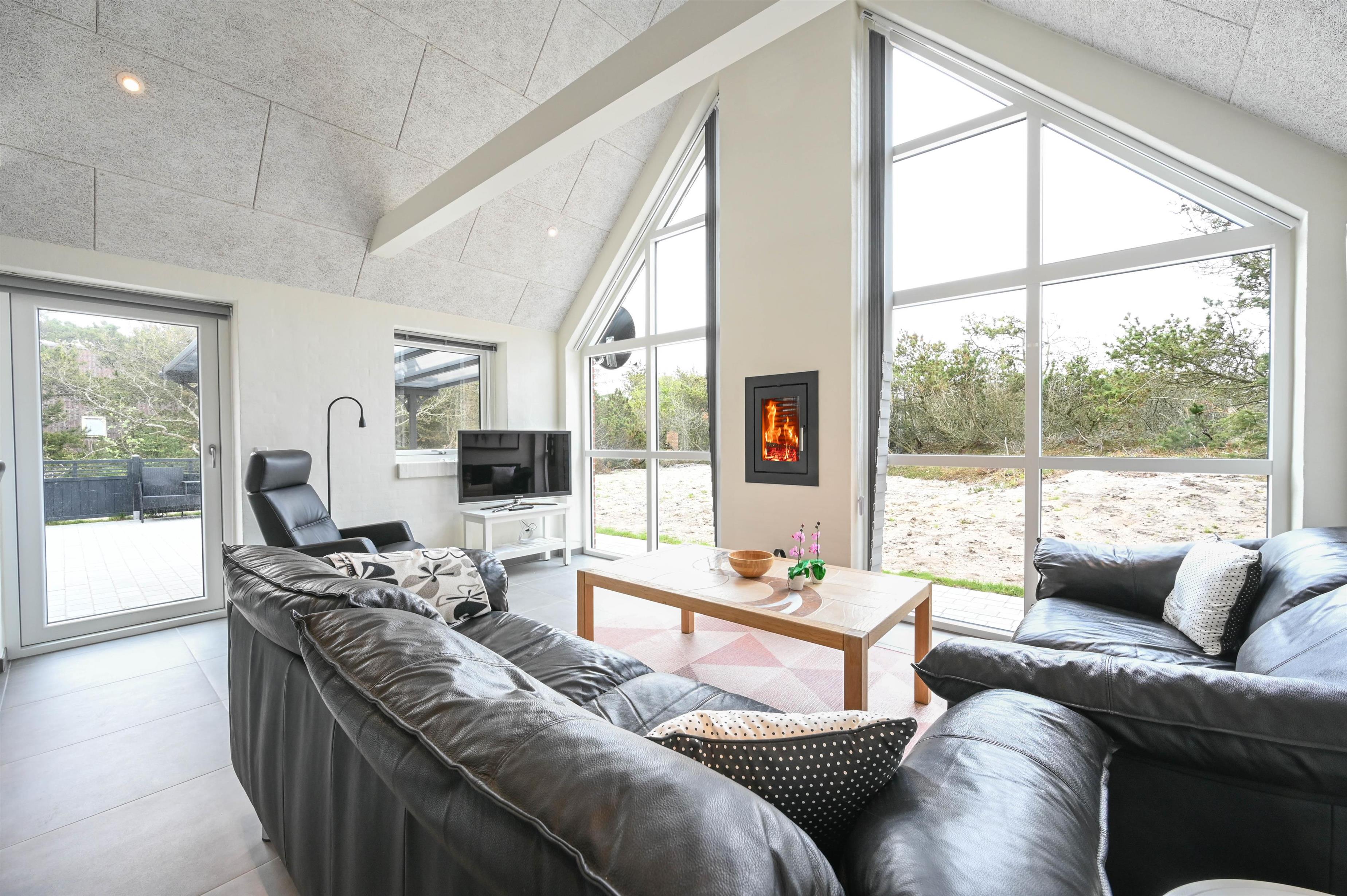 Stue med TV, brændeovn og udgang til sydøstvendt terrasse