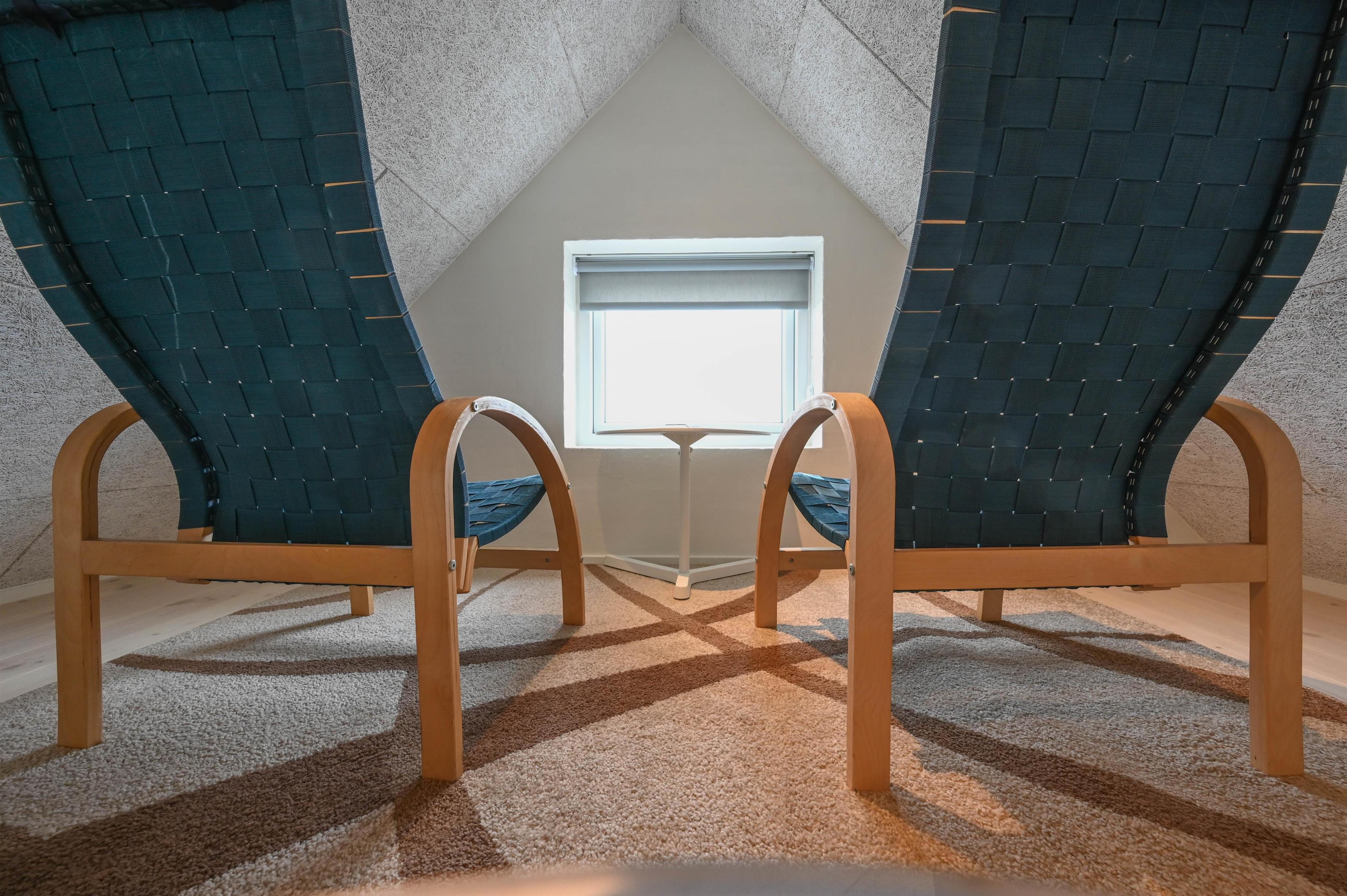 Fra køkken-alrummet fører en stige op til husets hyggelige hems – et skønt lille opholdssted med udsigt over engene og Nissum Fjord.