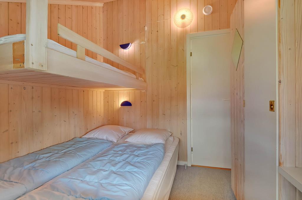 Huset har desuden tre soveværelser – to mindre værelser med hver to sovepladser samt et større soveværelse med skabe.