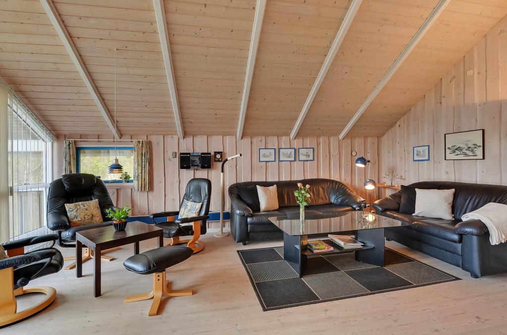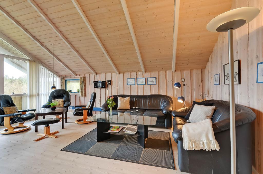 I stuen skaber de lyse trægulve, loft til kip og lædermøbler en behagelig atmosfære, og herfra er der udgang til den delvist overdækkede terrasse – et skønt sted at nyde solen og den friske vestjyske luft.