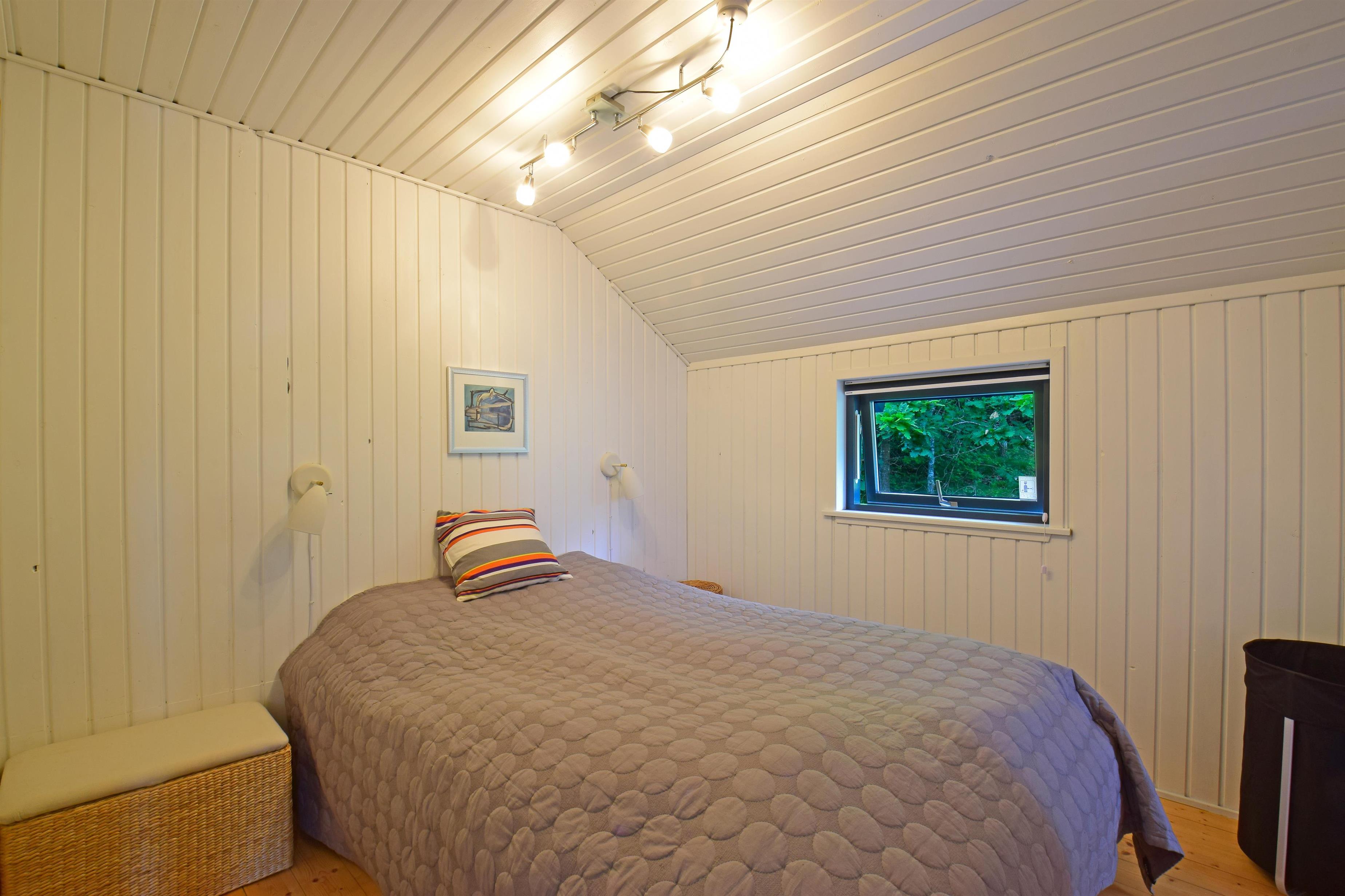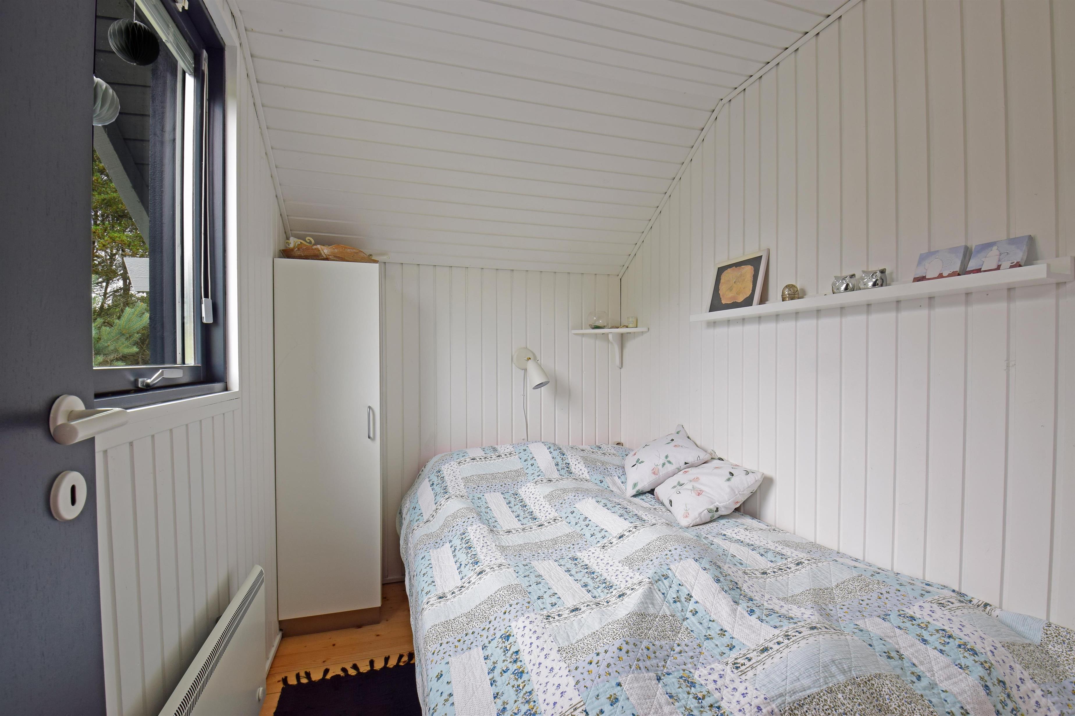 Huset er indrettet med entré, to soveværelser med dobbeltsenge og et lyst badeværelse med bruseniche.