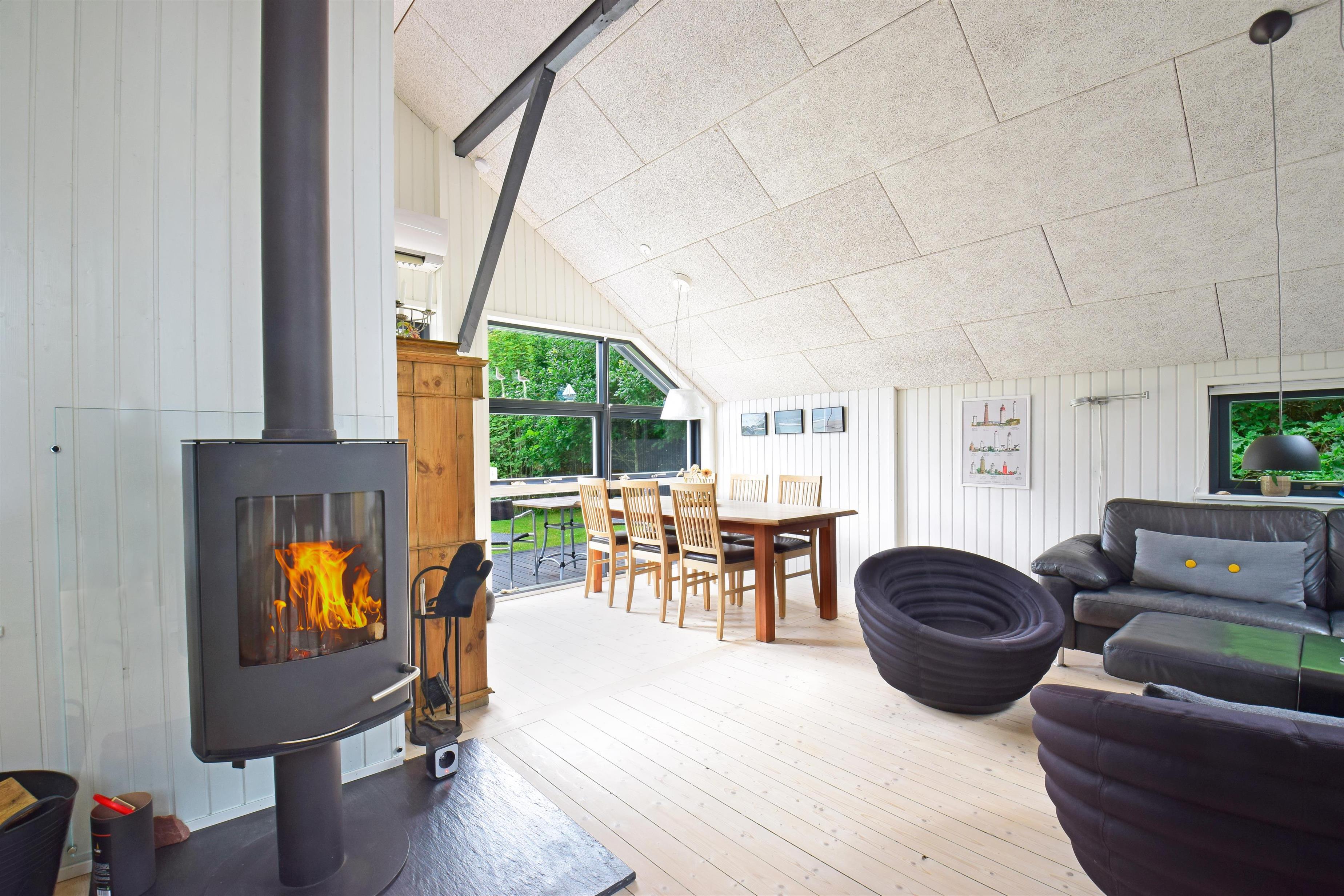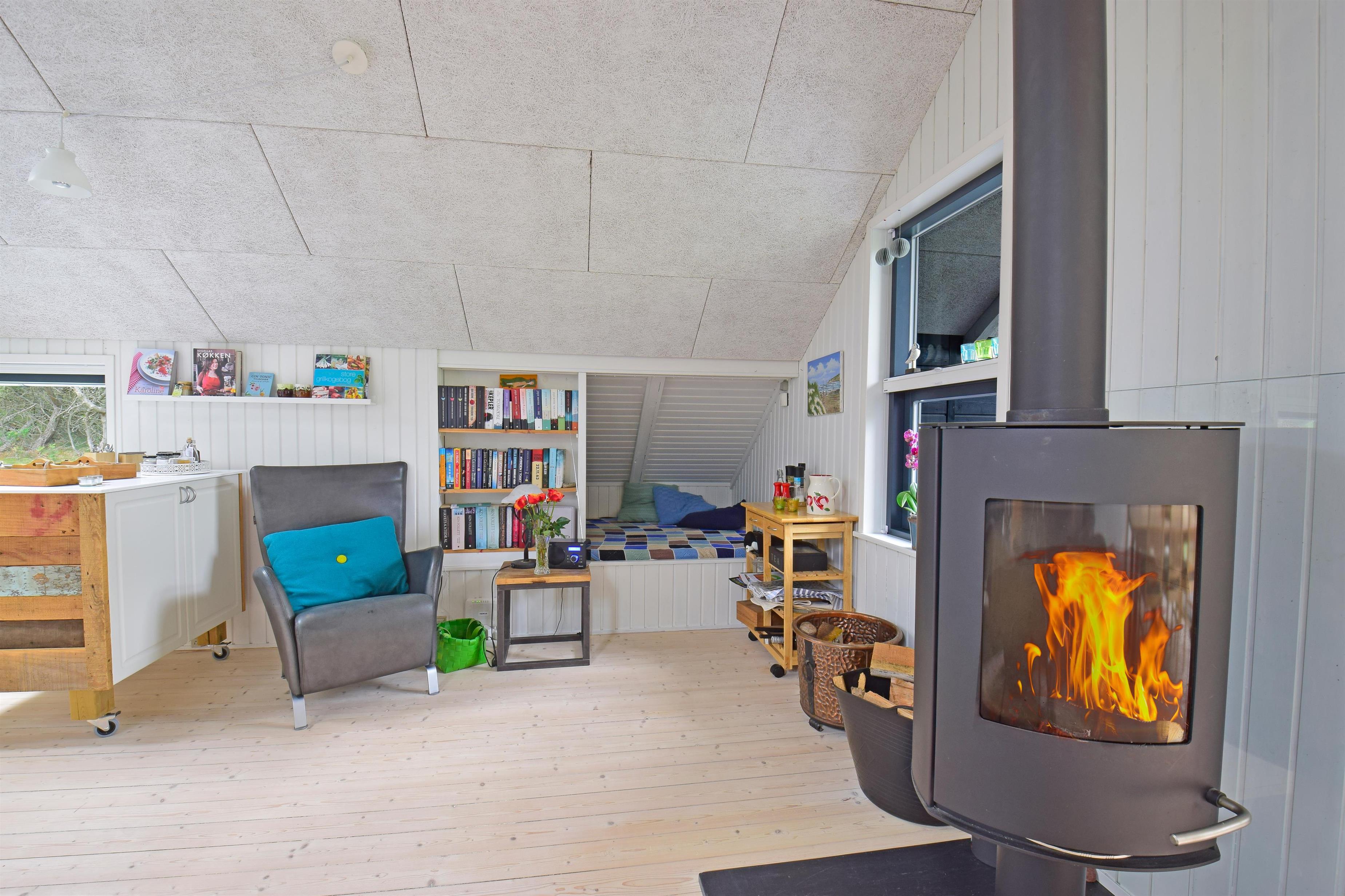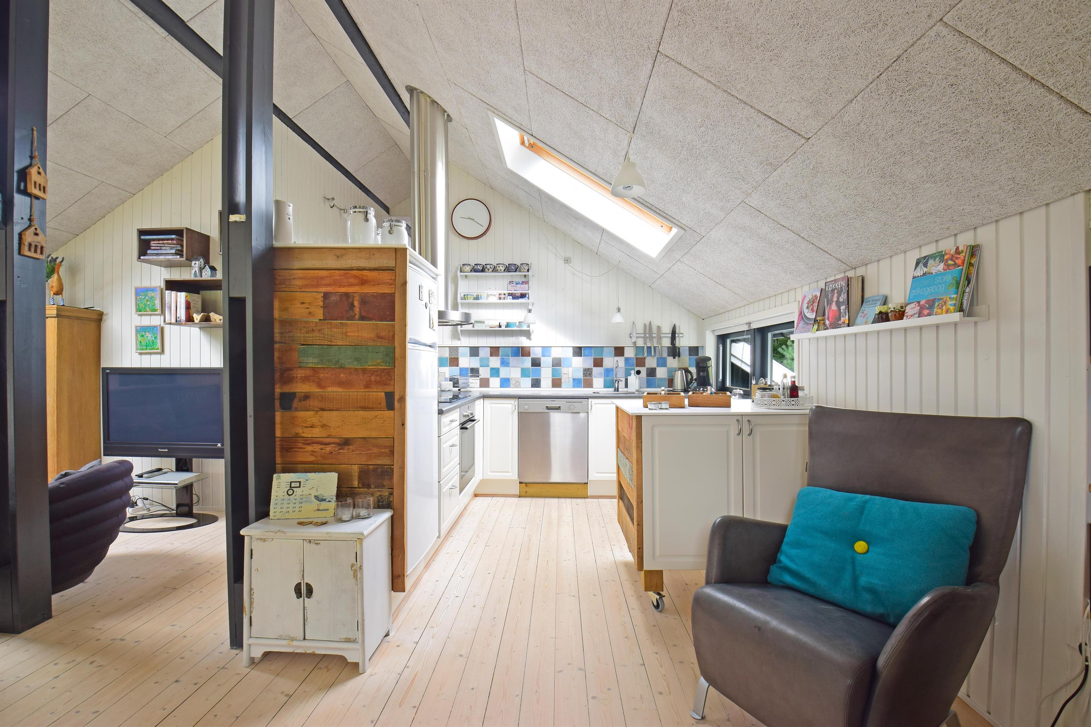 Køkkenet ligger i åben forbindelse med stuen, hvor brændeovnen spreder varme og hygge på kølige dage. Her er også TV, et godt sofaarrangement og en rummelig spiseplads, der indbyder til samvær og hyggelige feriemiddage.