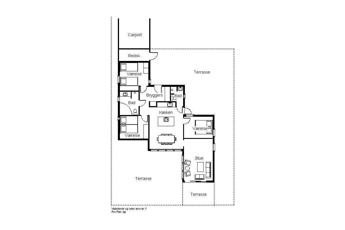 Huset ligger på en 1.200 m² delvis plejet naturgrund med god plads omkring, og der er anlagt store terrasser mod syd, øst og vest – så I altid kan finde sol og læ. På grunden findes desuden et rummeligt redskabsrum og en praktisk carport.