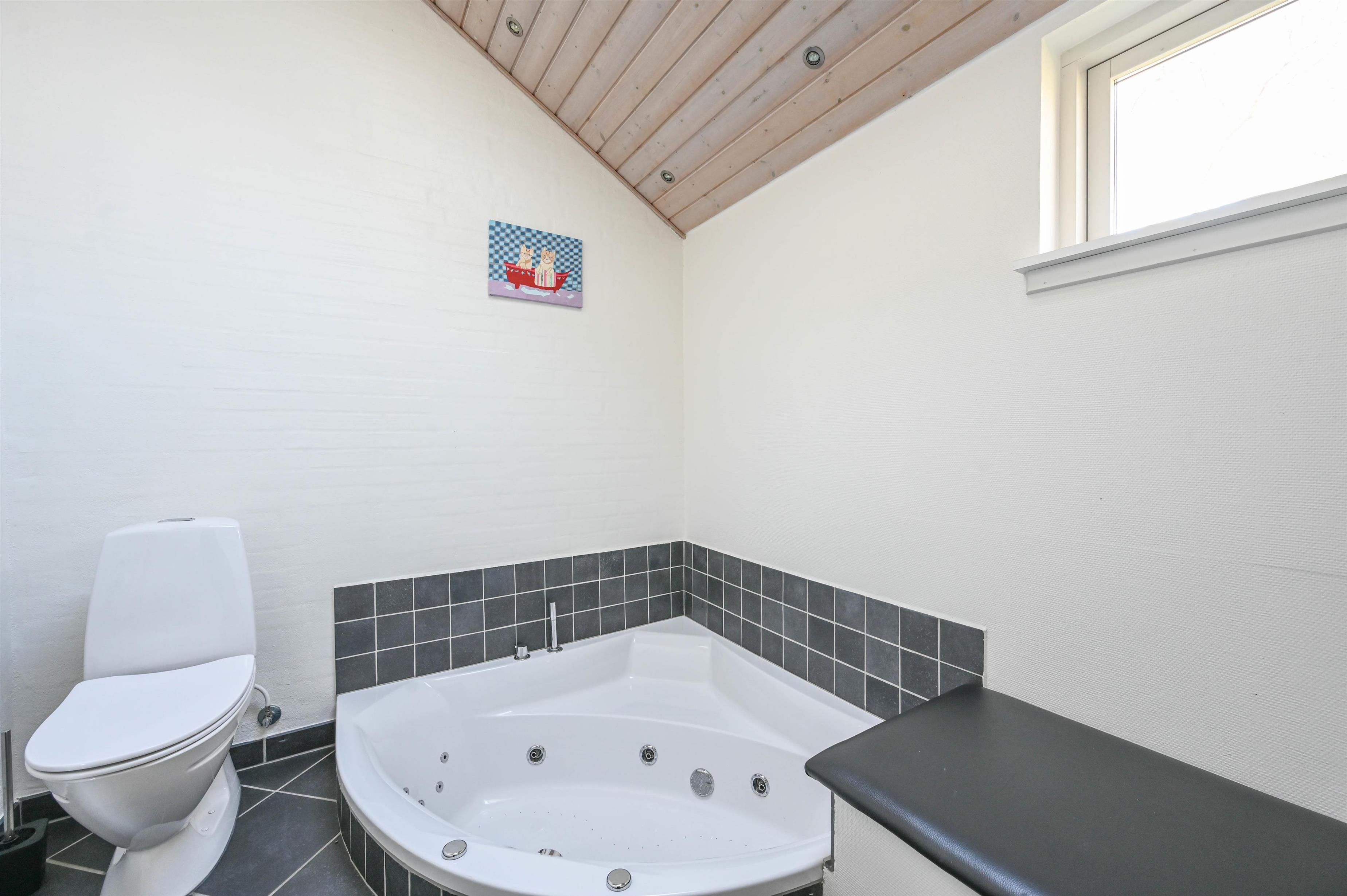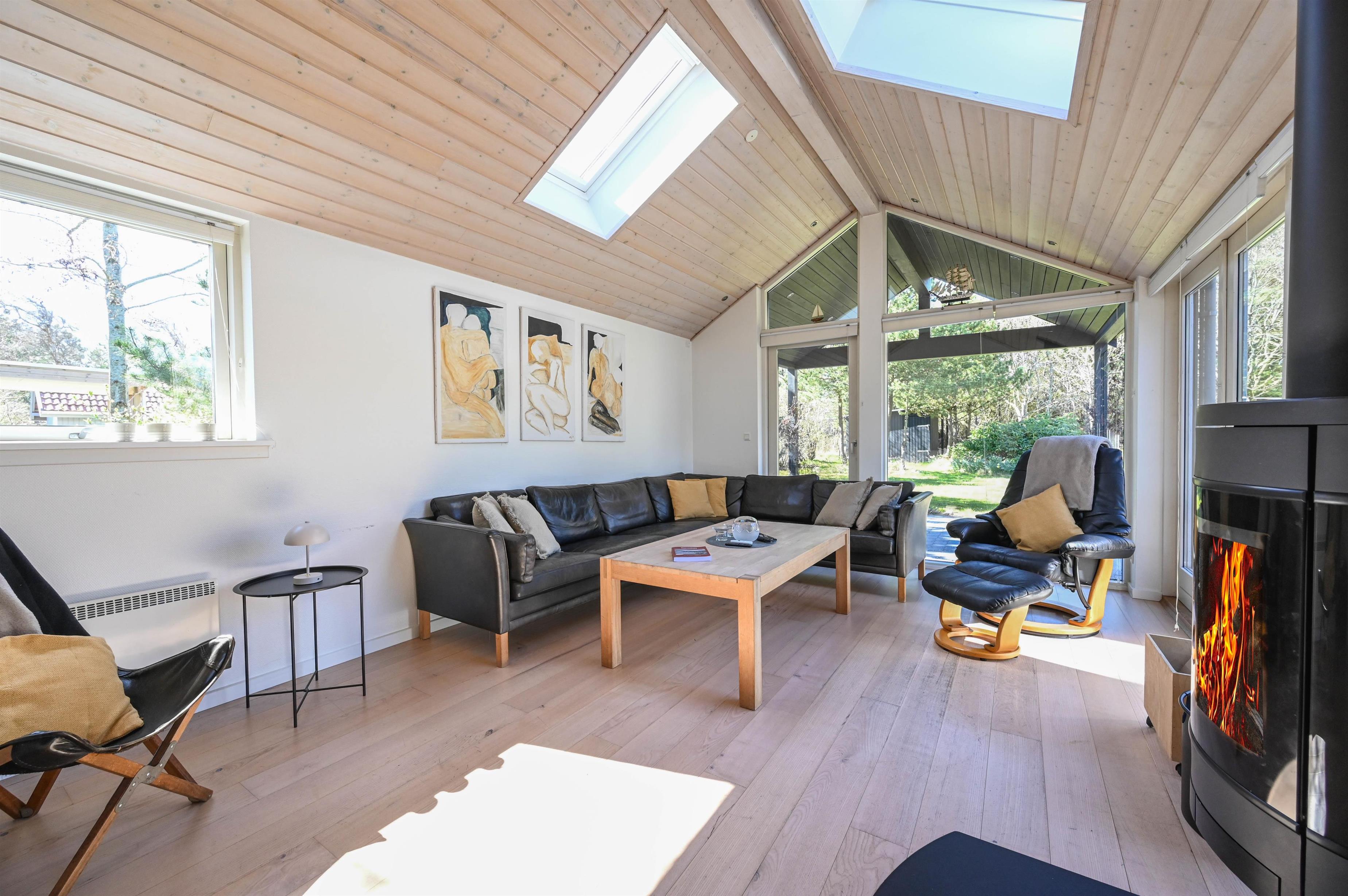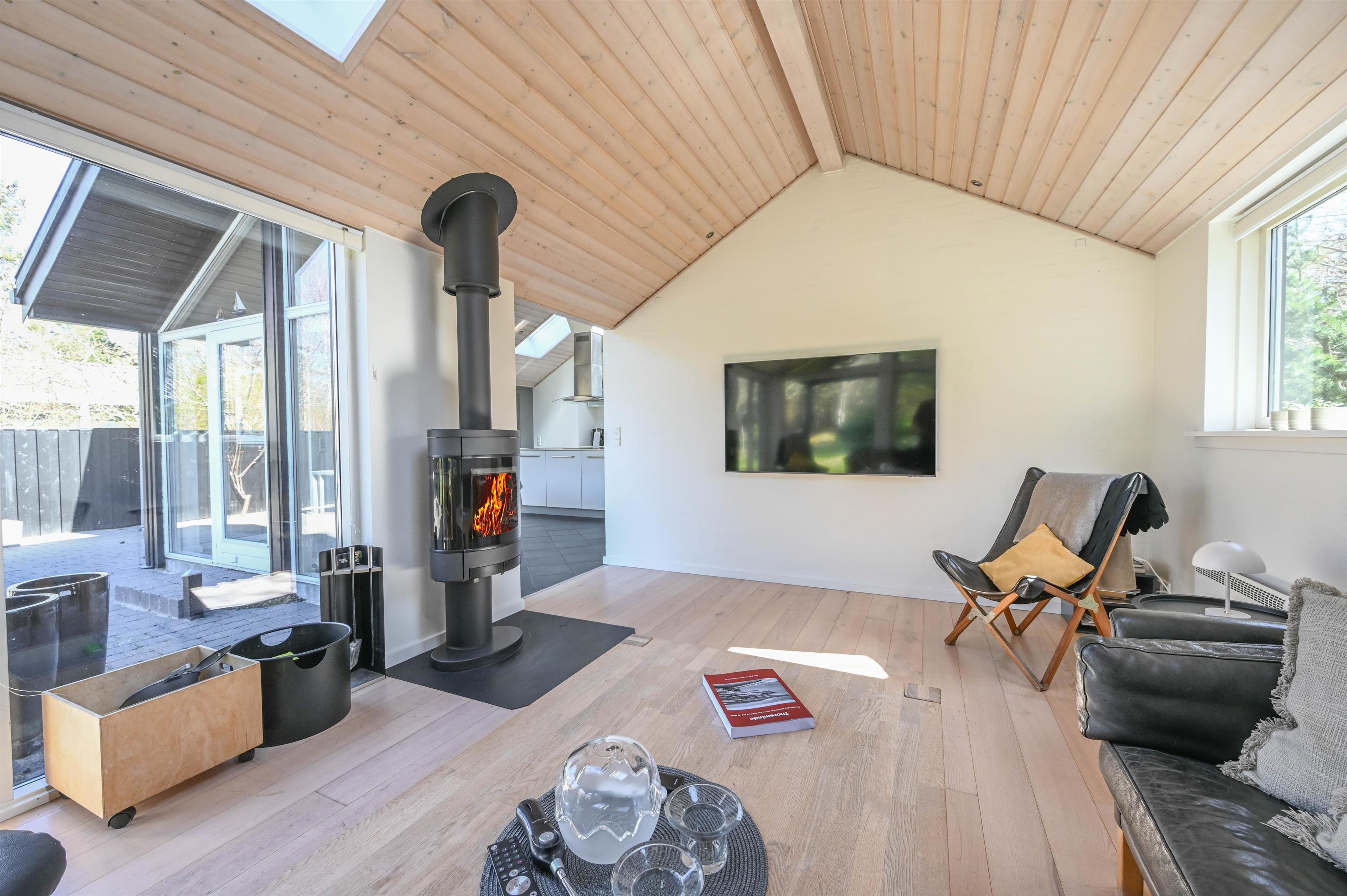 I stuen skaber brændeovnen hygge på kølige aftener, og møblerne indbyder til afslapning og samvær. Badeværelset byder på lidt ekstra luksus med nedsænket spa, og derudover findes et gæstebadeværelse med bruser.