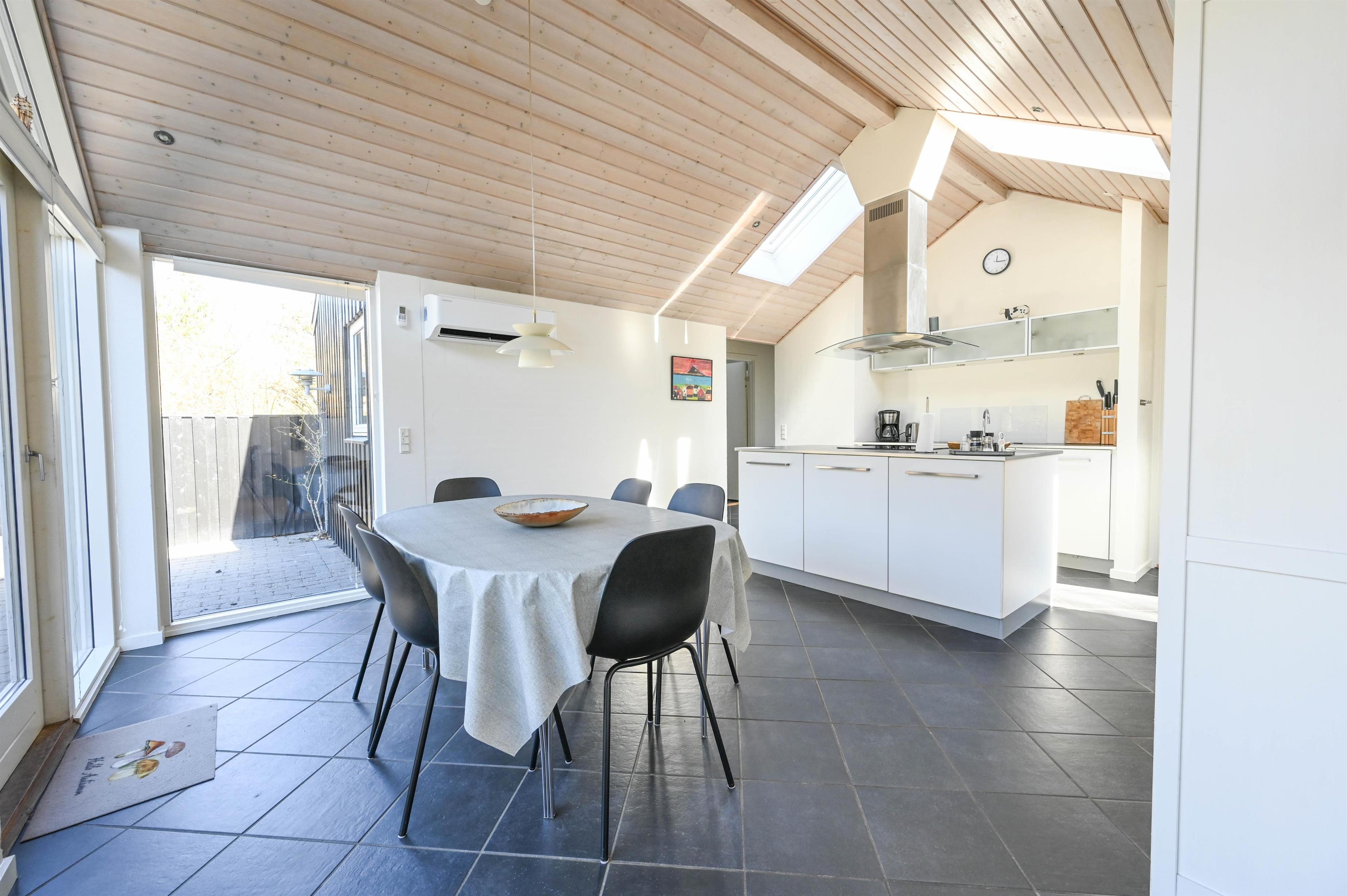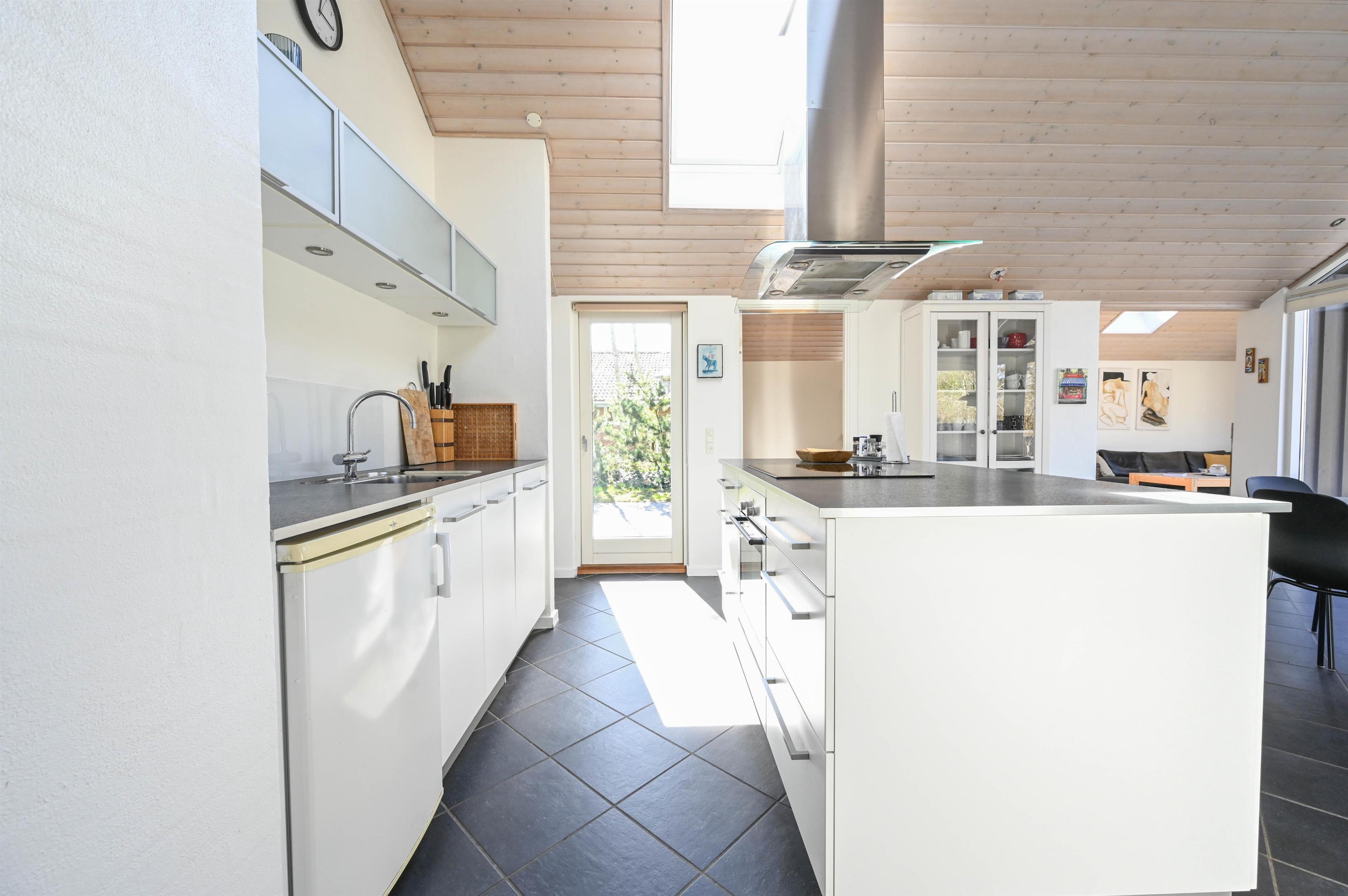 Fra den lyse entré træder I ind i et flot køkken med kogeø og god spiseplads – perfekt til hyggelige feriemiddage. Gulvene i køkken og spiseområde er belagt med klinker, mens stue og værelser har smukke trægulve, som giver varme og atmosfære.