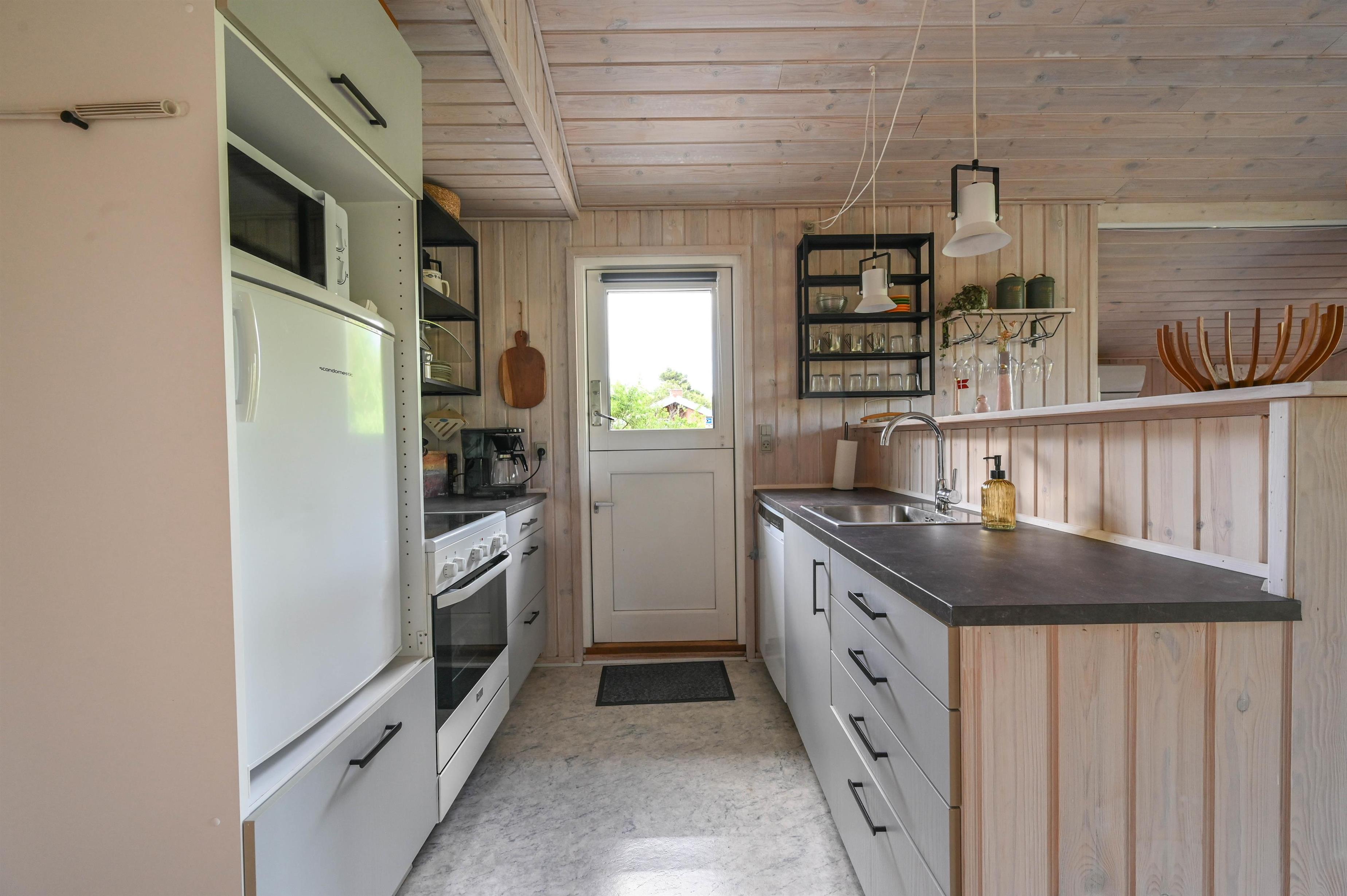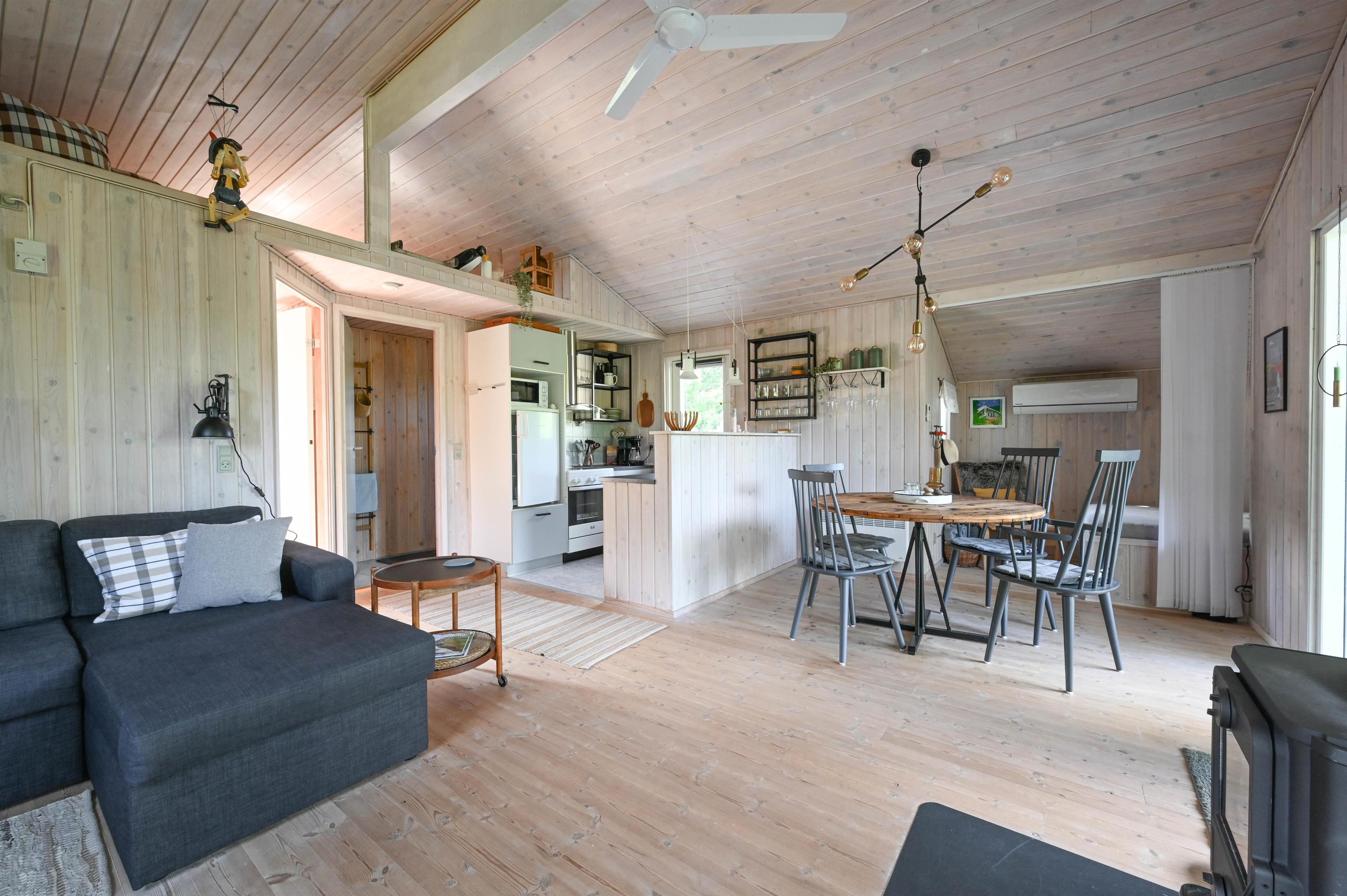 Køkkenet ligger i åben forbindelse med stuen, hvor brændeovnen og varmepumpen sørger for behagelig varme året rundt. I forbindelse med stuen er der opført en hyggelig alkove – et perfekt sted til afslapning eller en god bog.