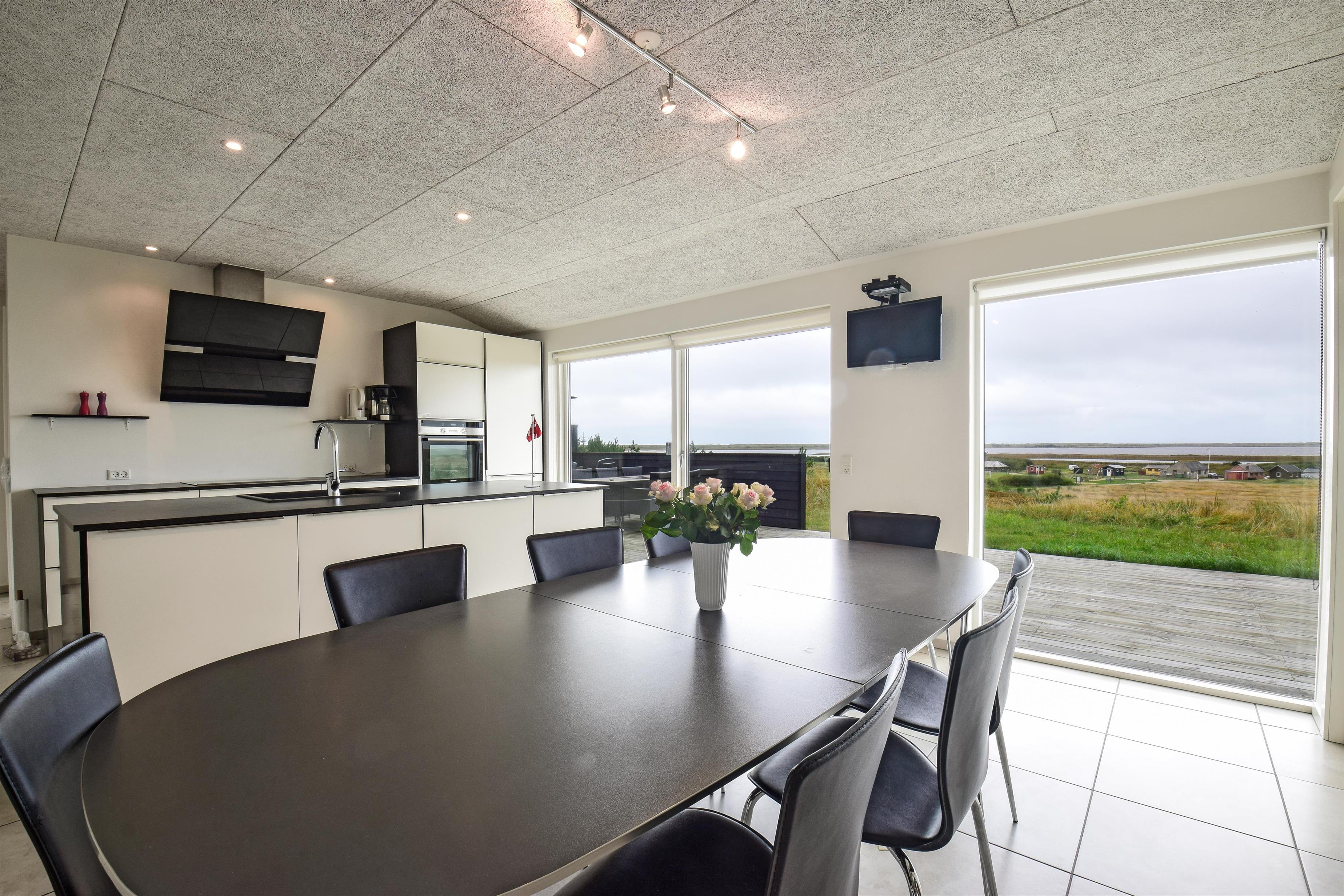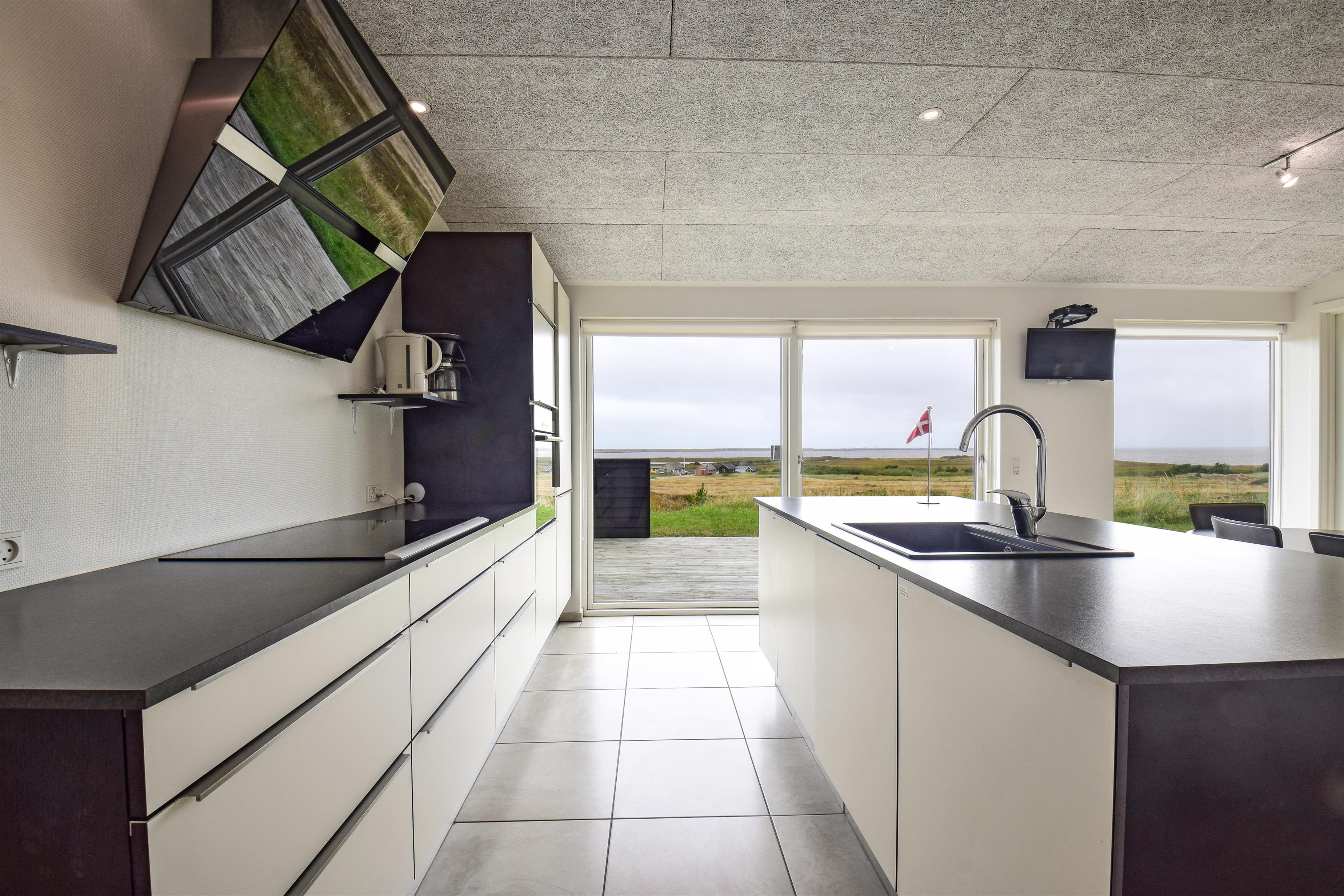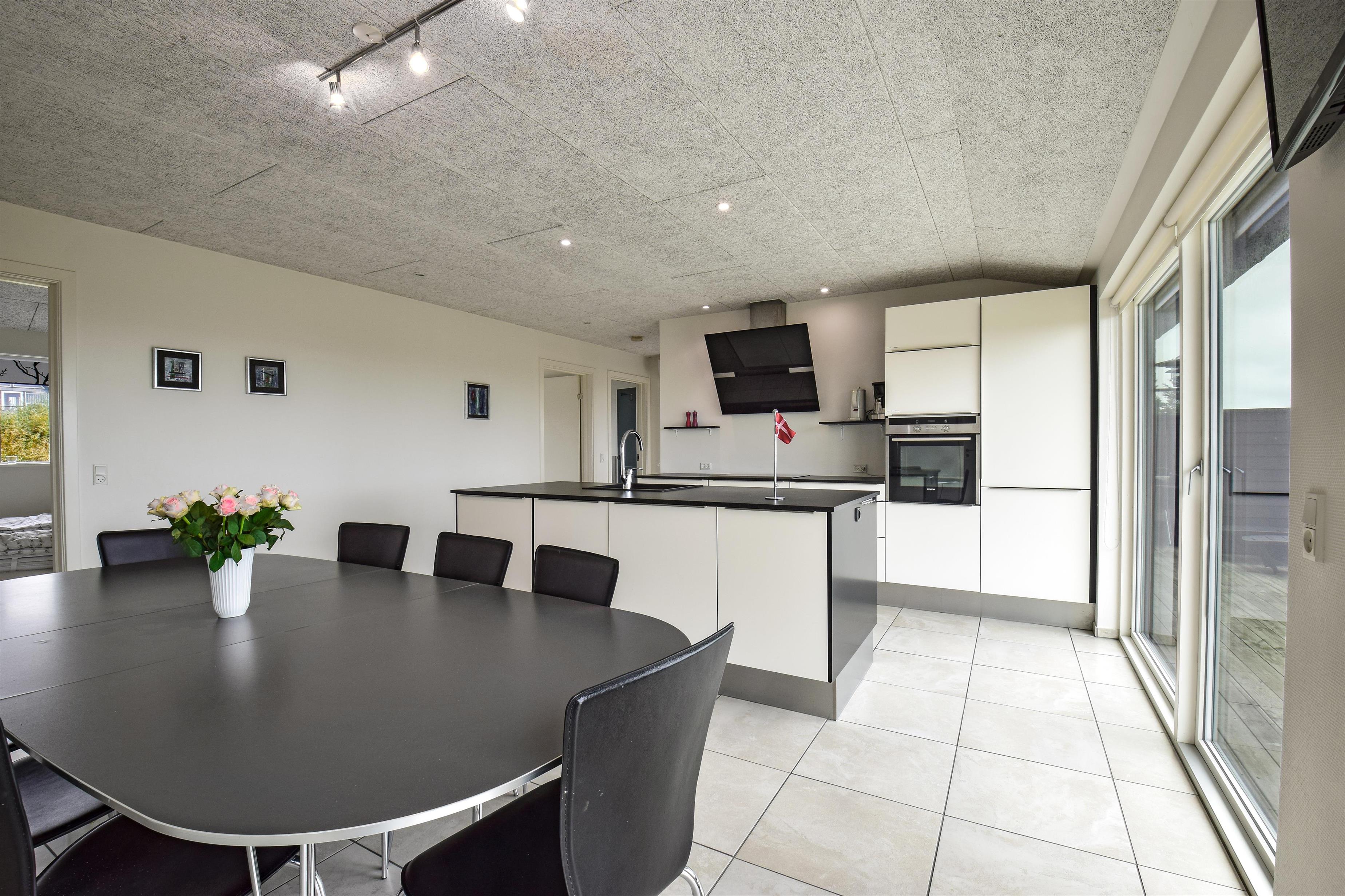 Husets store køkken-alrum er samlingspunktet, hvor I kan lave mad, hygge jer og nyde udsigten gennem de store vinduespartier.