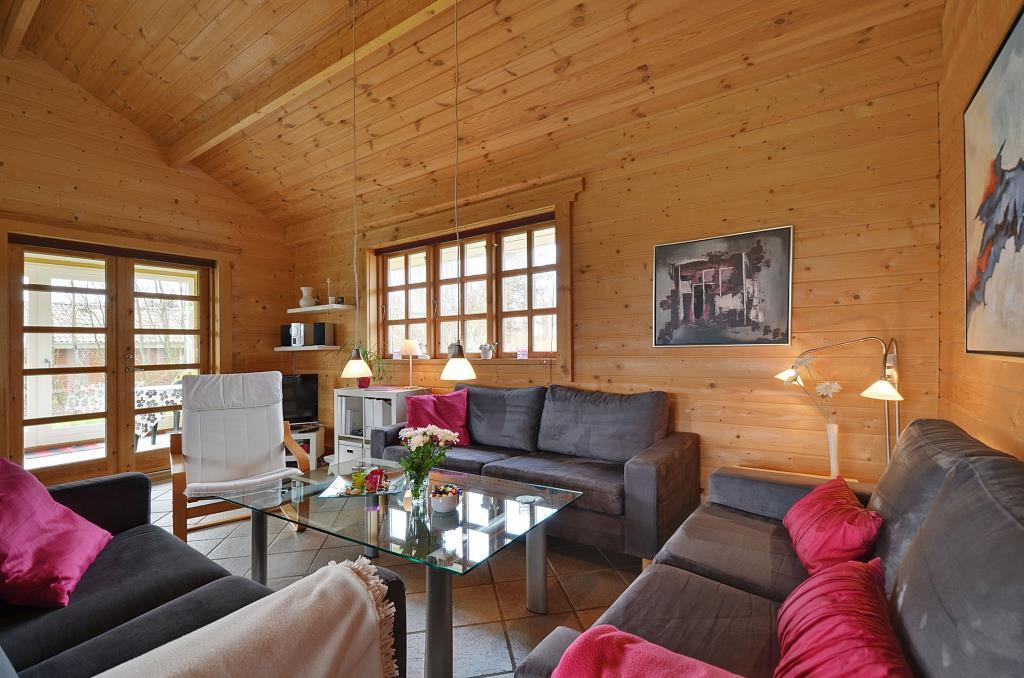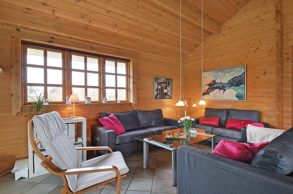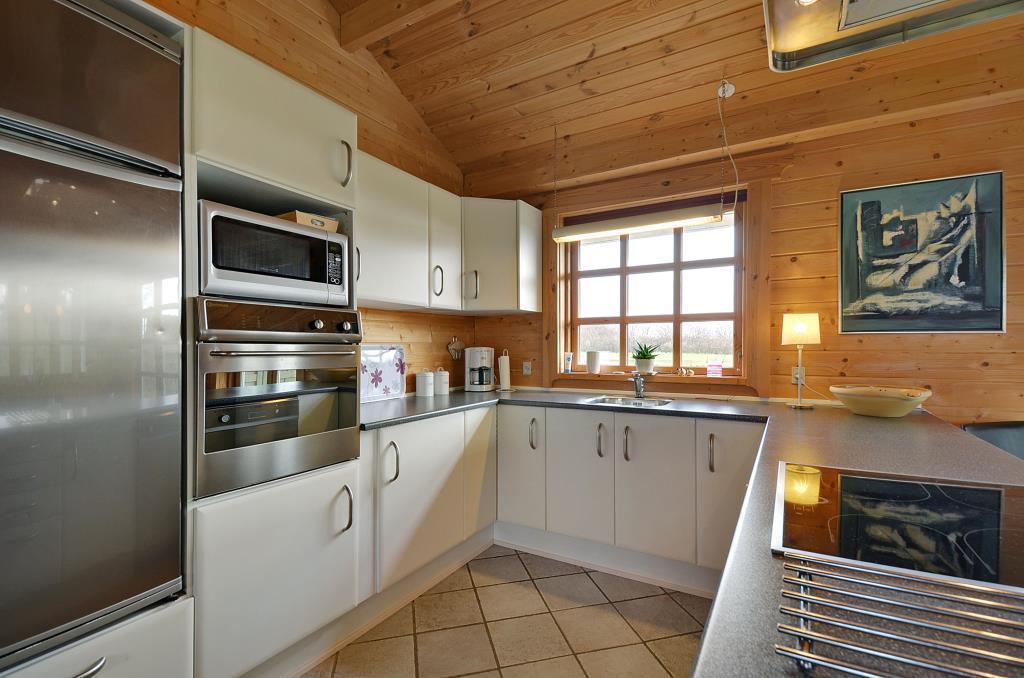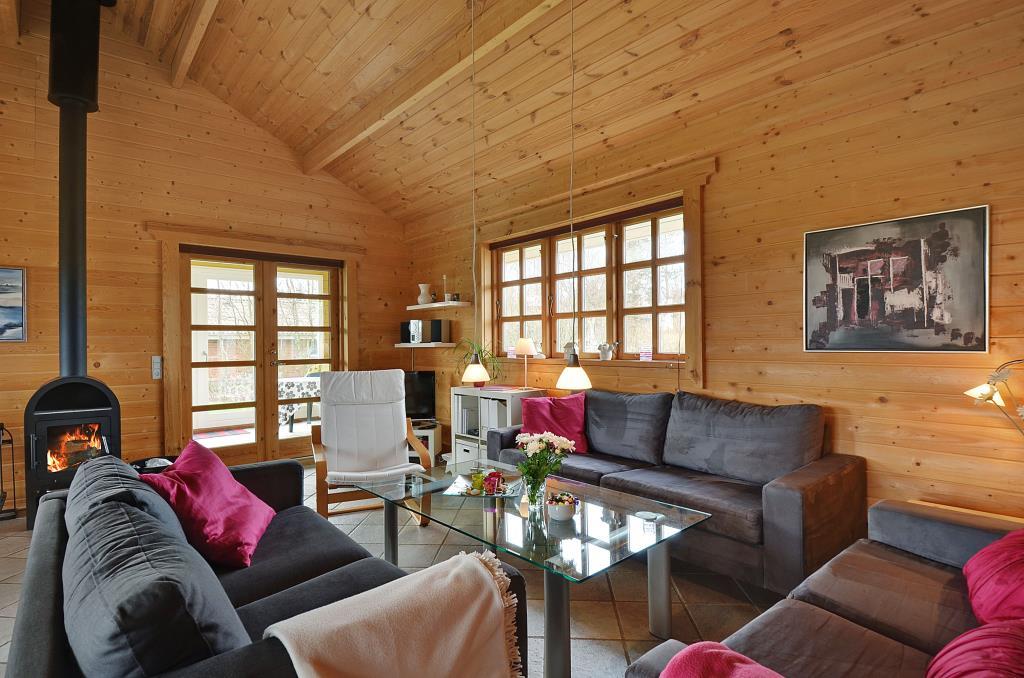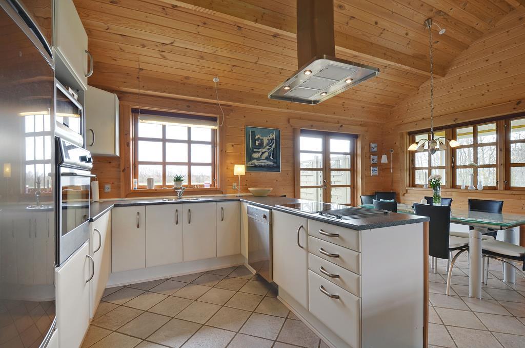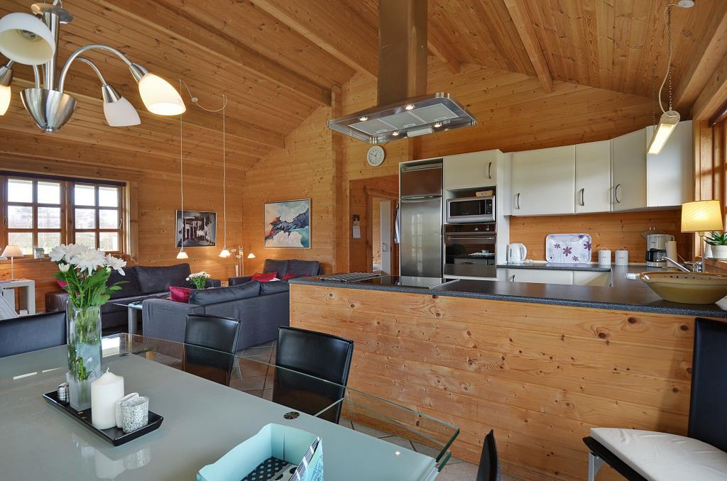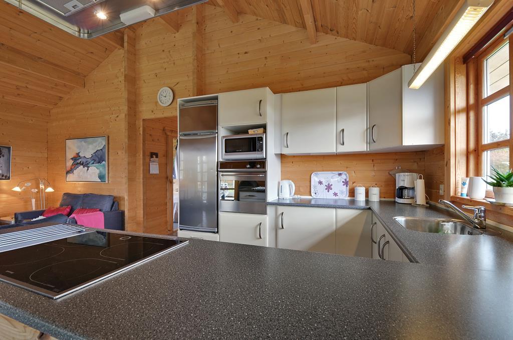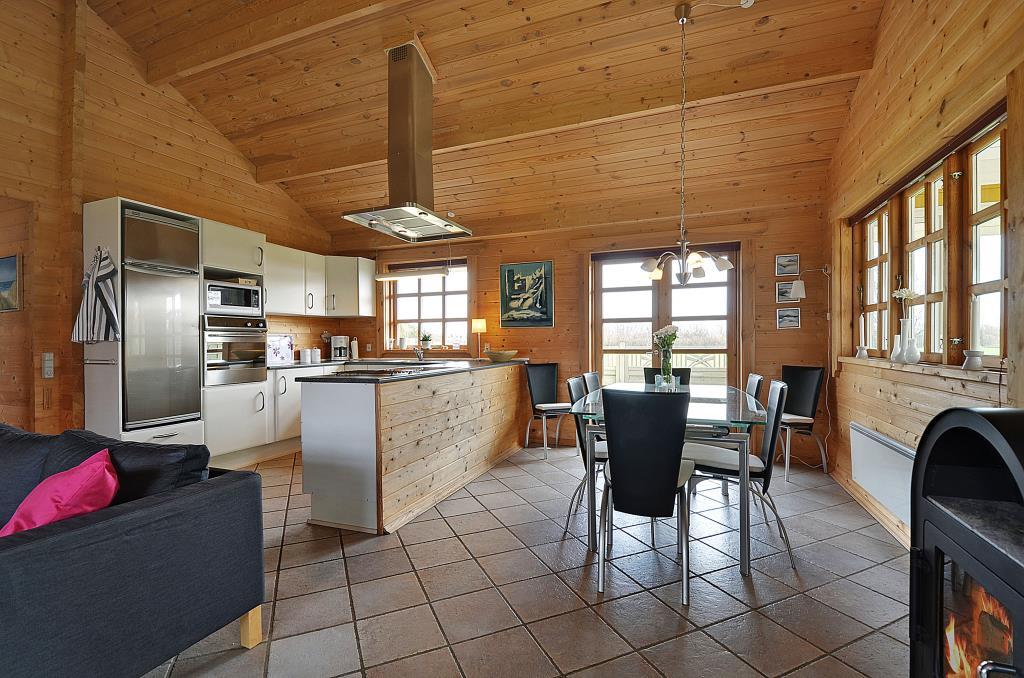 I den hyggelige opholdsstue med brændeovn kan I slappe af efter en dag i naturen, mens det åbne køkken gør det let at lave mad og hygge sig sammen.