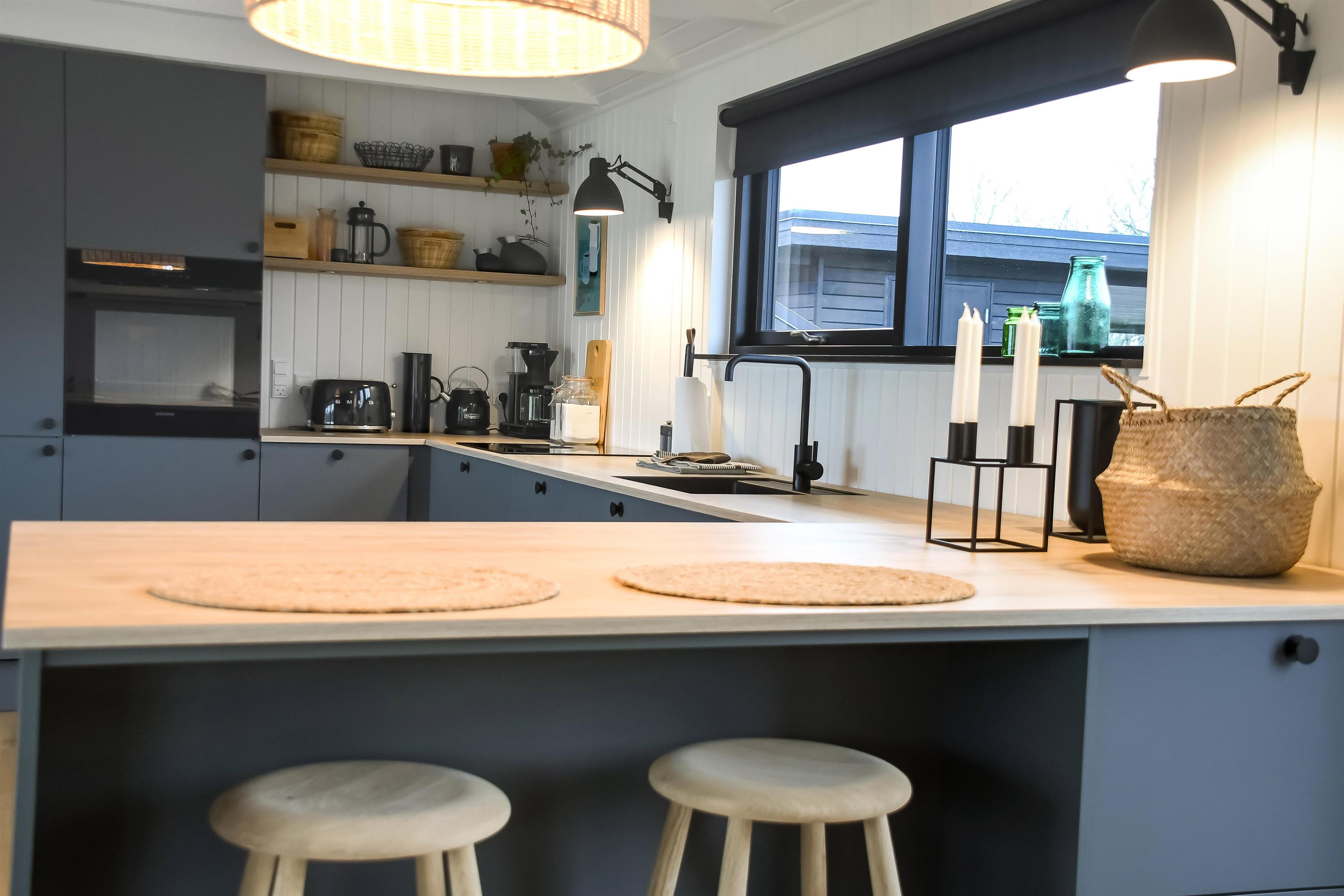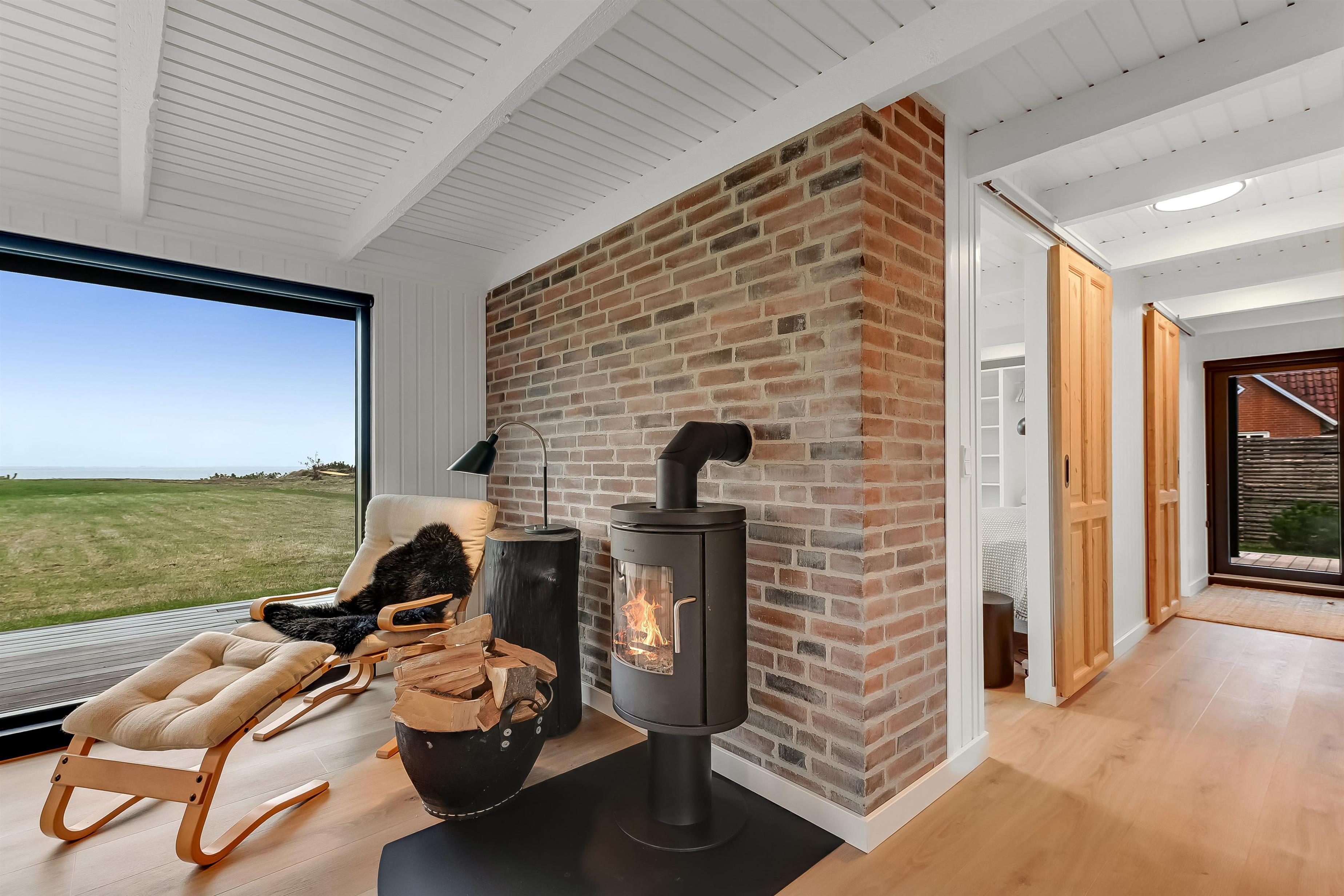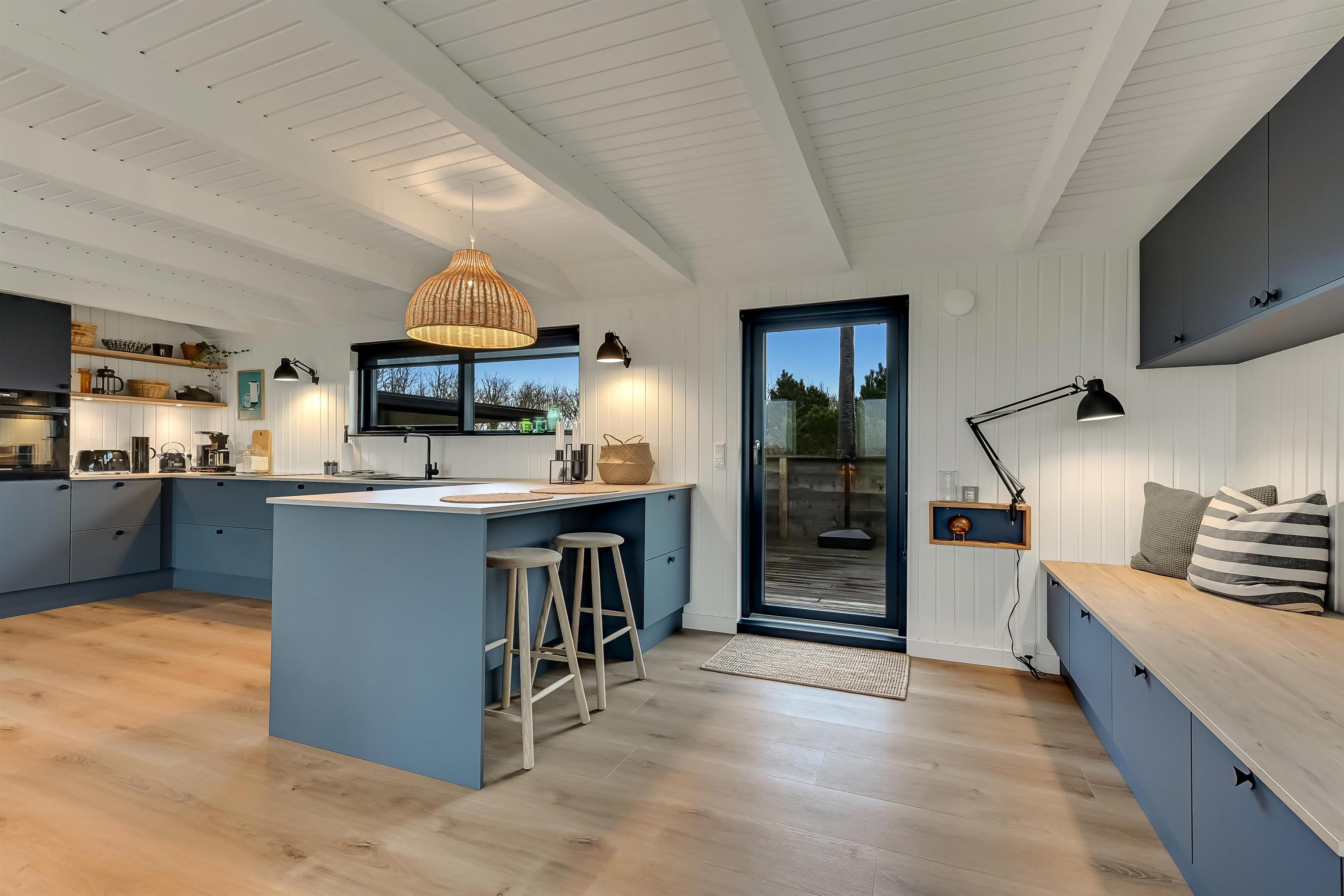 Køkkenet ligger i åben forbindelse med stuen og byder på god bordplads og en funktionel indretning. I stuen skaber brændeovnen hygge, og her er både spisebord, sofagruppe og store vinduespartier mod fjorden, så udsigten kan nydes fuldt ud – både dag og aften.