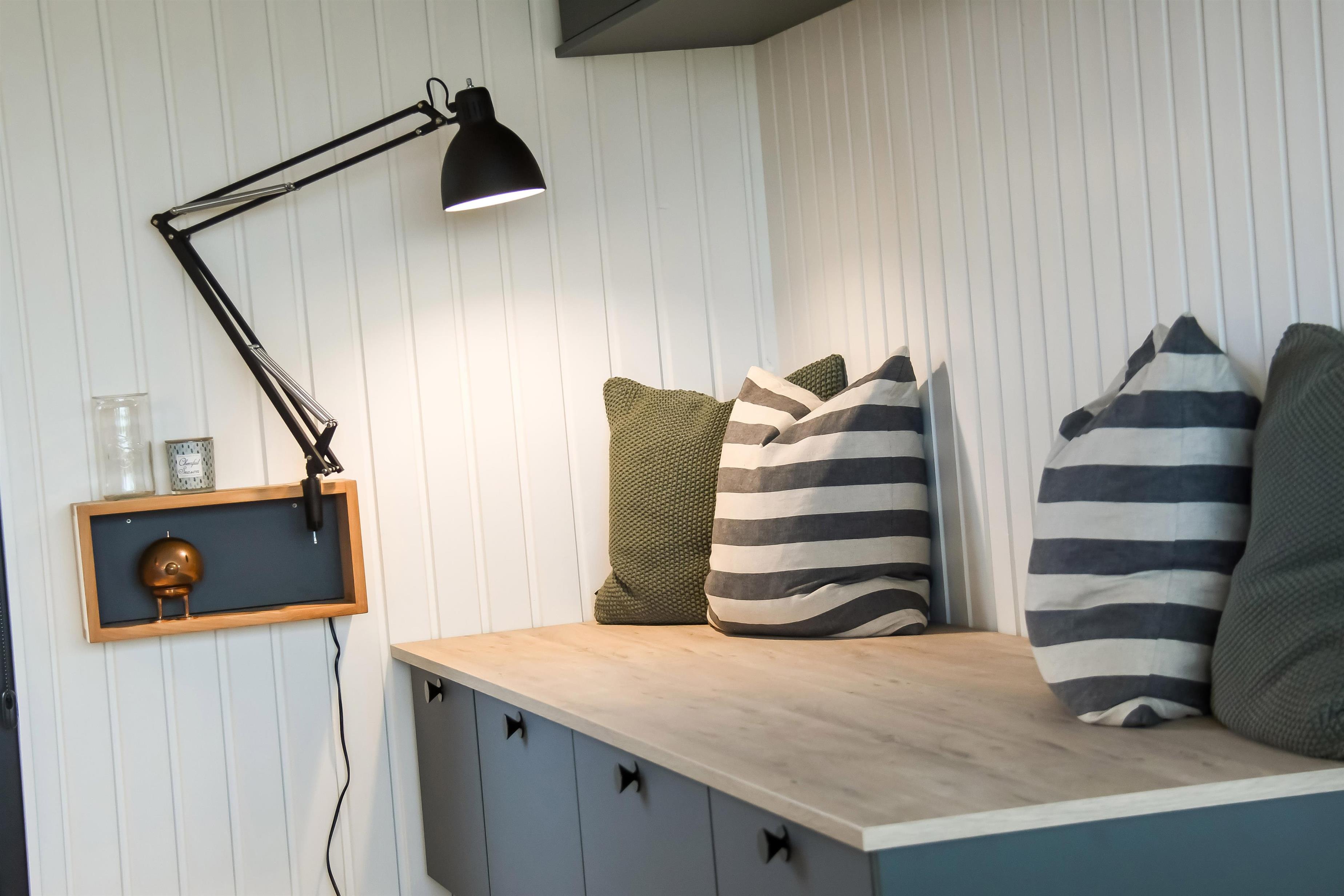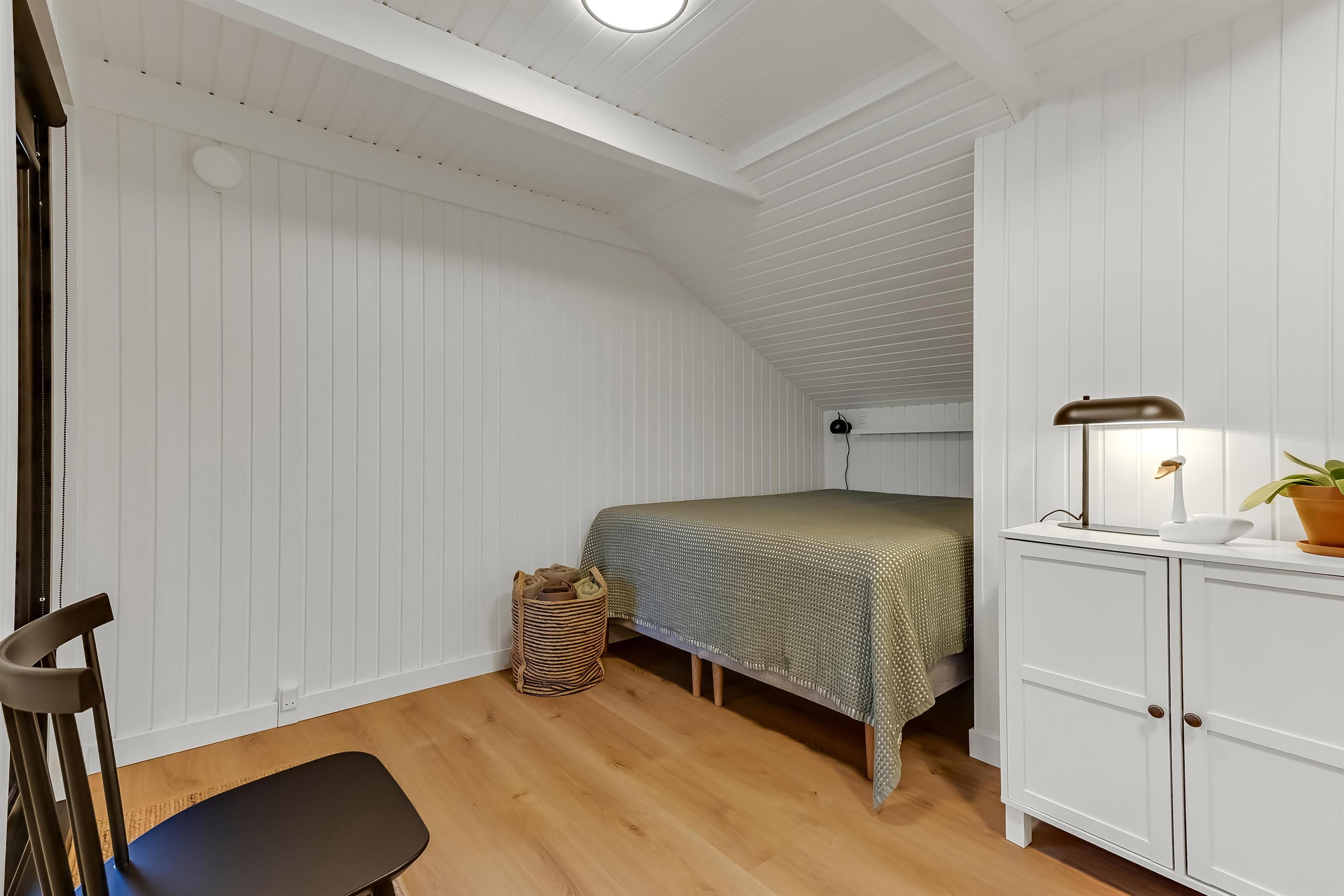 Det 86 m² store feriehus er indrettet med en dejlig entré, et hyggeligt værelse med en mindre dobbeltseng samt et stort soveværelse med elevationsseng og en imponerende panoramaudsigt over fjorden – et rum, der i sig selv indbyder til afslapning og ro.