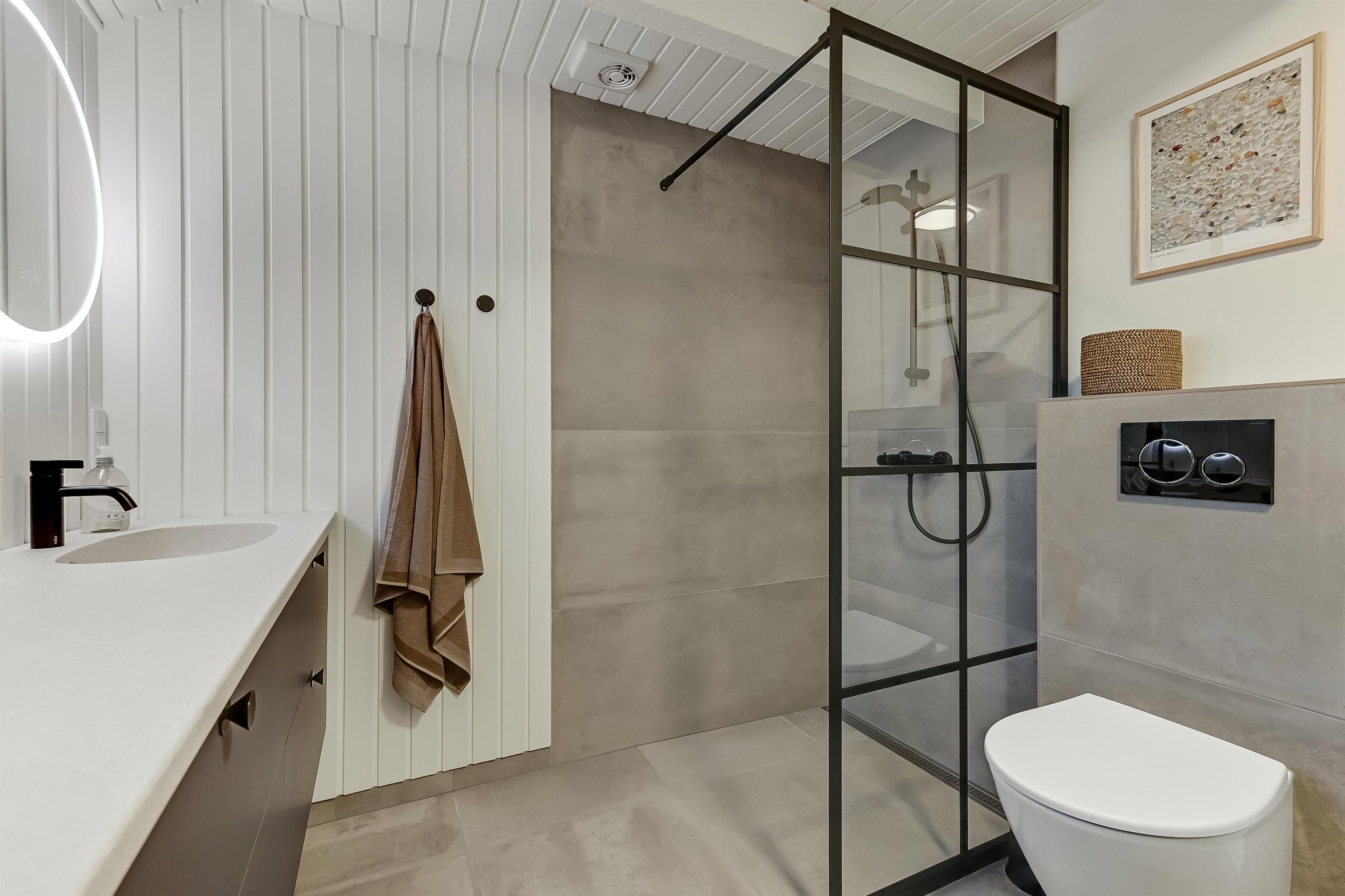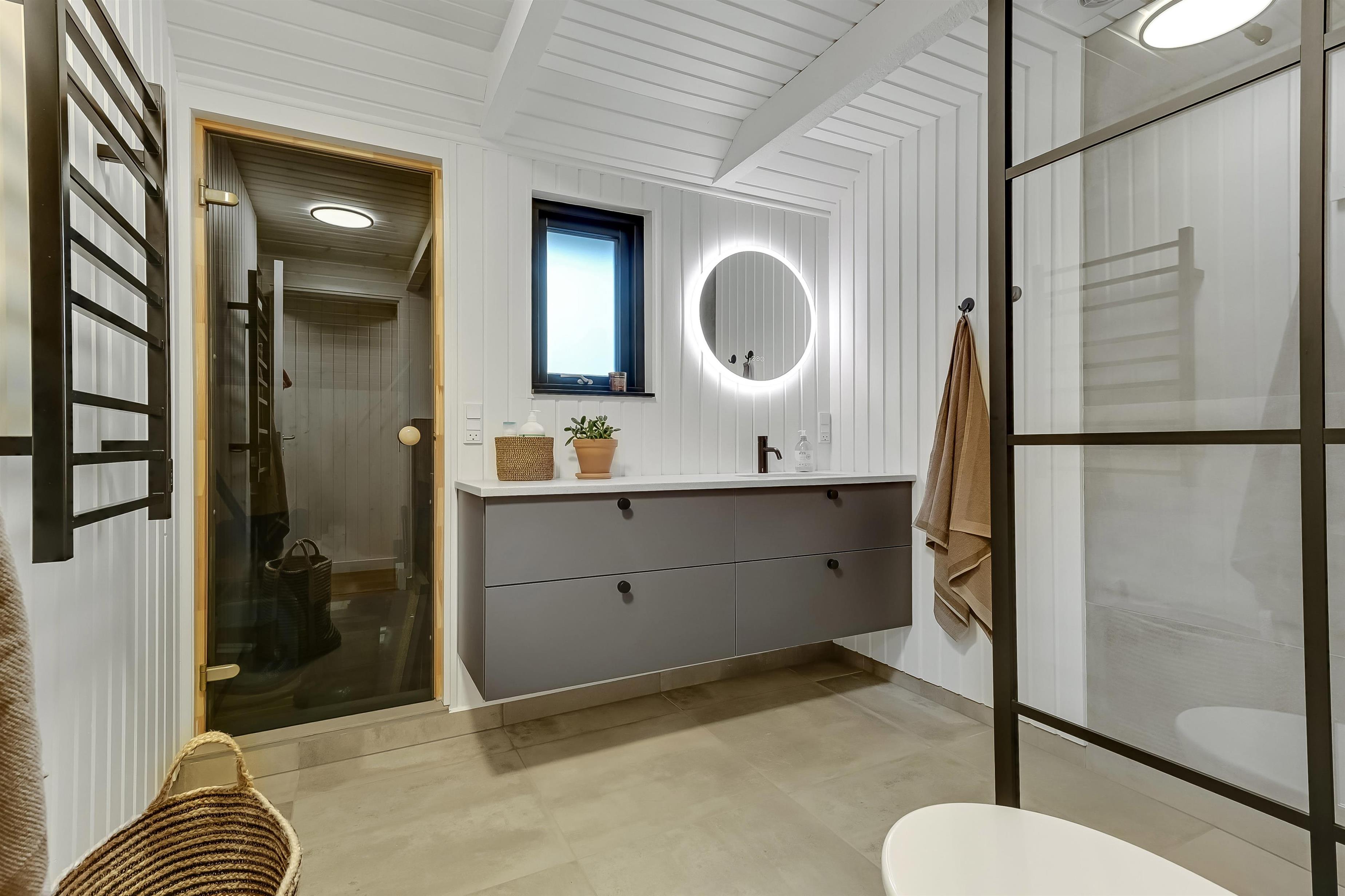 Det flotte badeværelse byder på bruseniche, vaskemaskine, tørretumbler og direkte adgang til saunaen, hvor du kan nyde velvære efter en dag i den friske vestjyske luft.