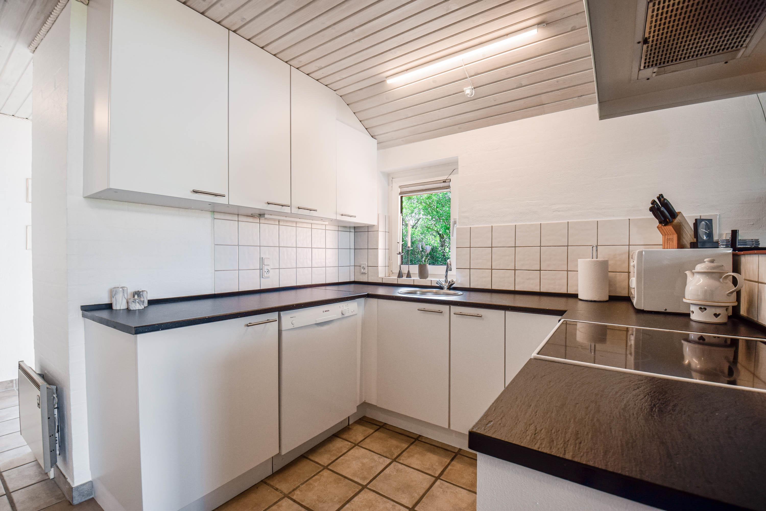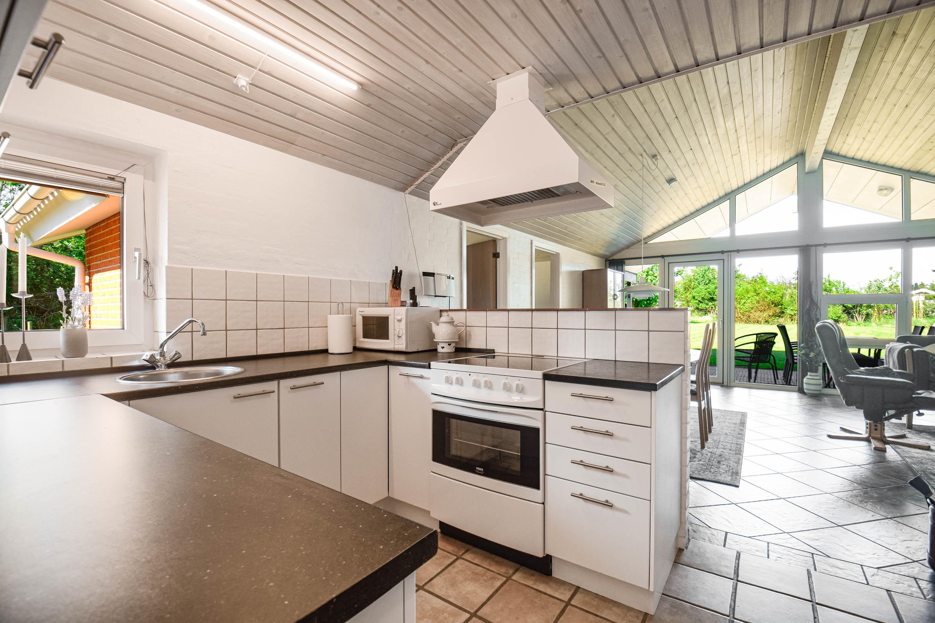 Køkkenet ligger i åben forbindelse med stuen og er veludstyret med alt, hvad I har brug for til feriens måltider.