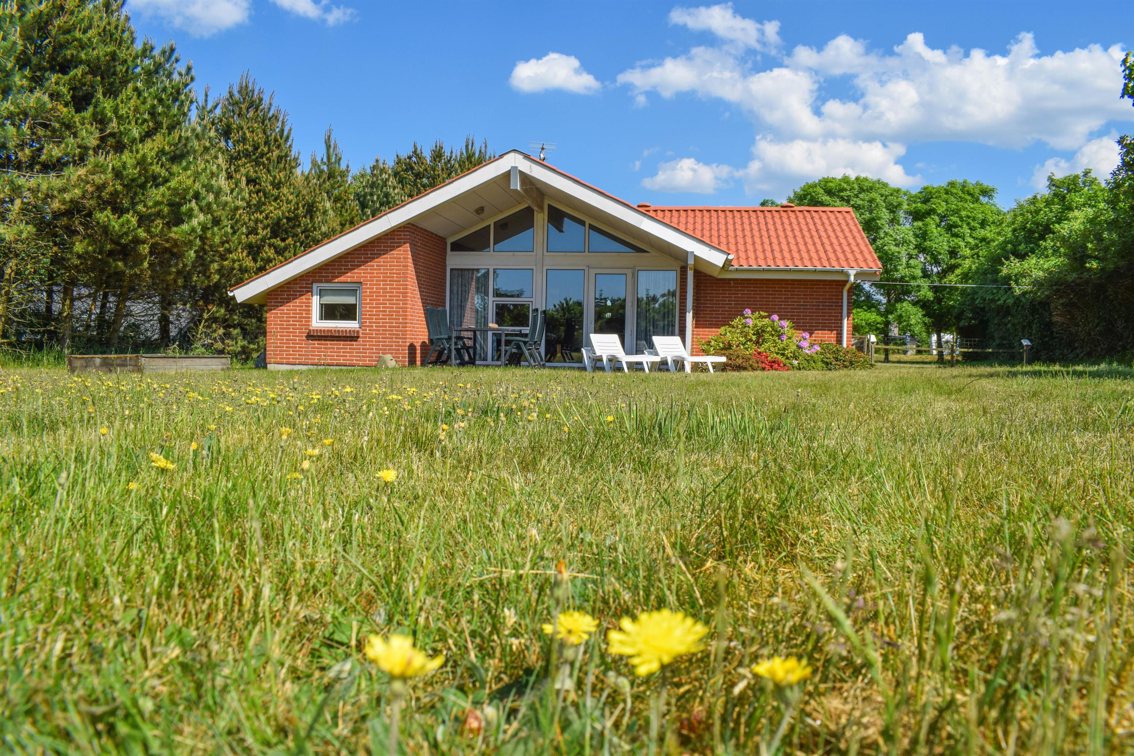 Huset ligger på en stille sidevej, omgivet af træer og buske, som giver fred og privatliv. Her kan I virkelig slappe af og nyde ferien i rolige omgivelser – enten på den delvist overdækkede terrasse eller på den store græsplæne, hvor der er god plads til leg og ophold.