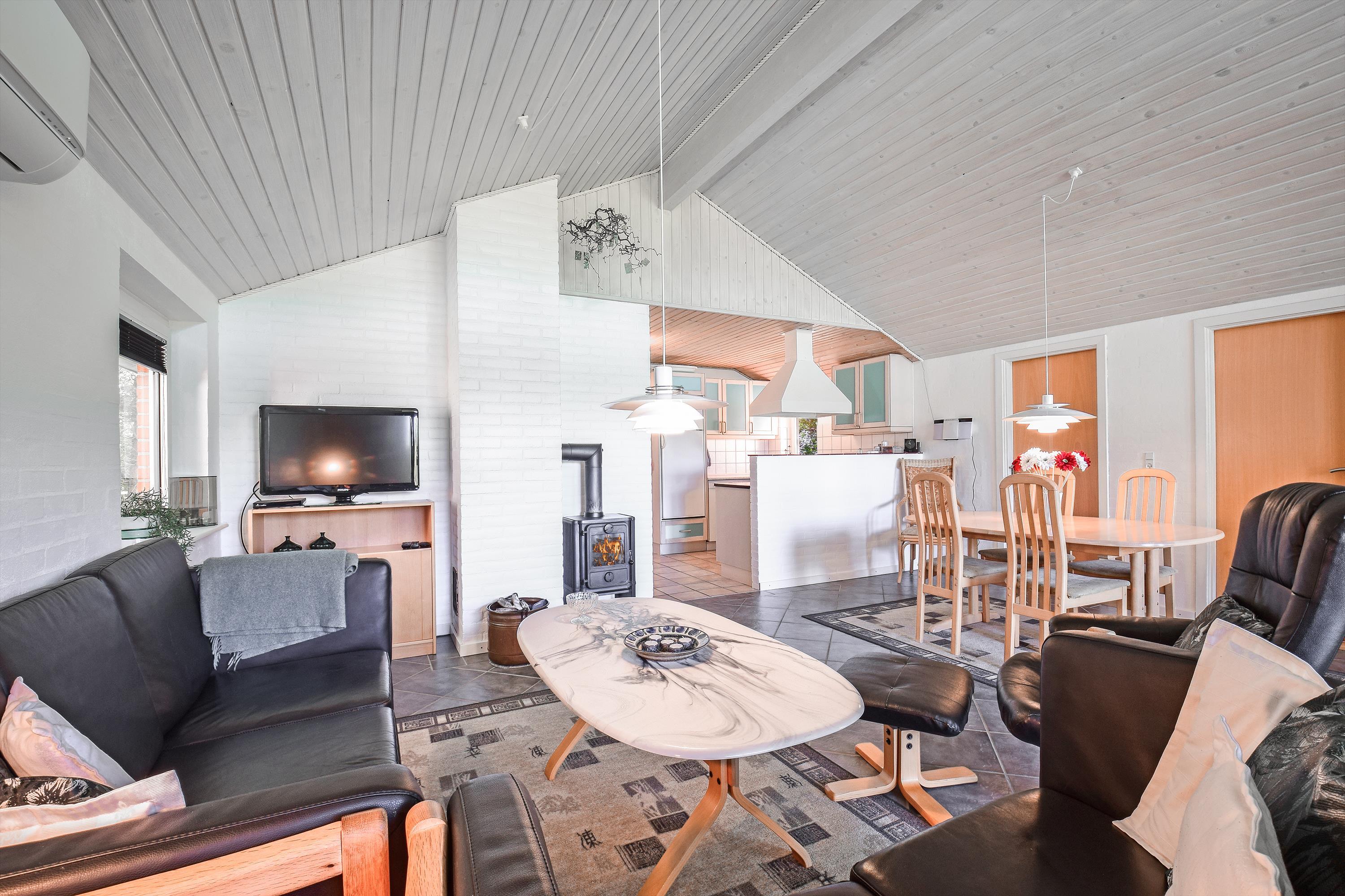 I den hyggelige stue er der gode lædermøbler, brændeovn, fladskærms-TV og klinkegulve – det perfekte sted at samles efter en dag ved fjorden eller stranden.