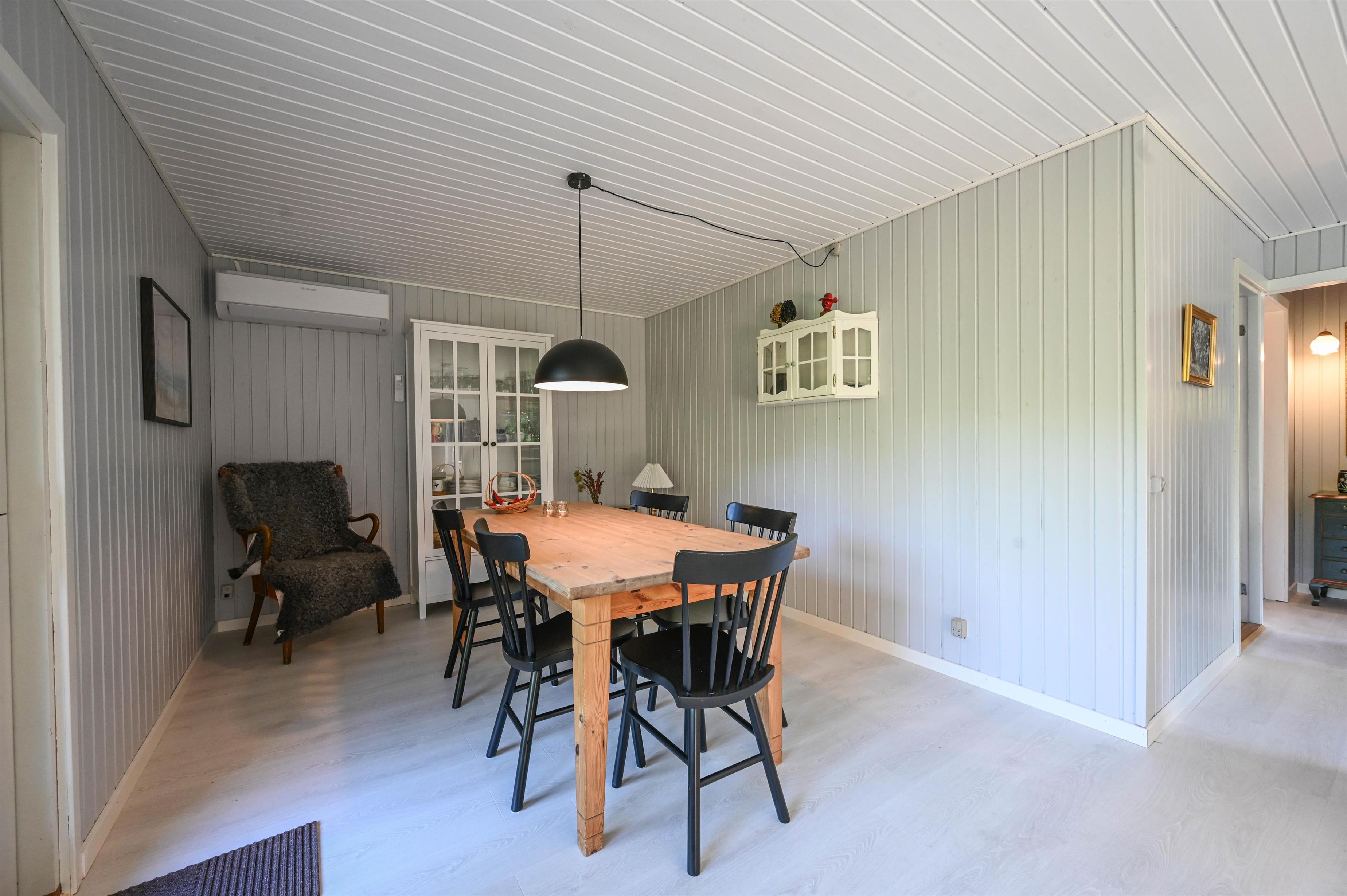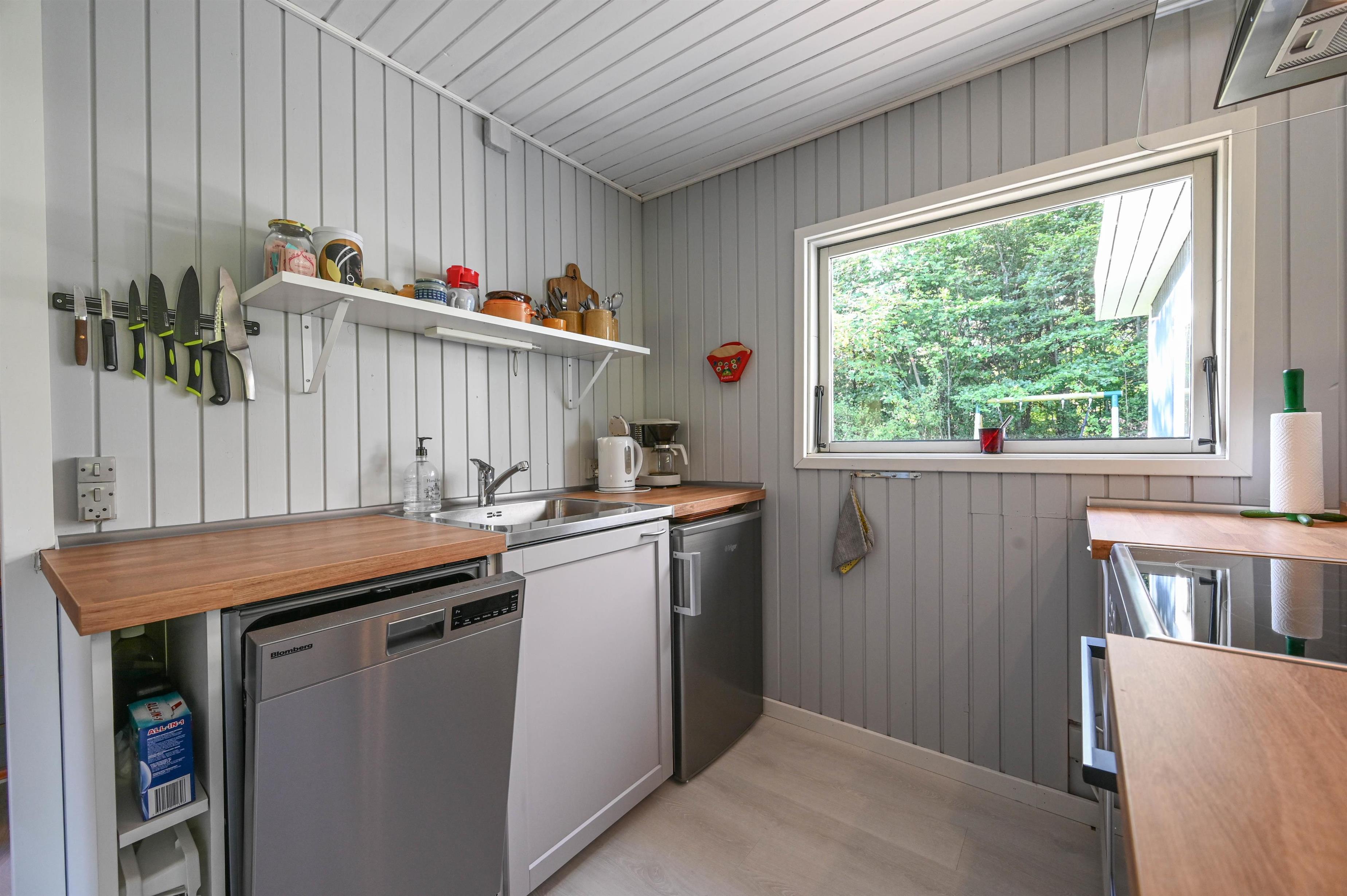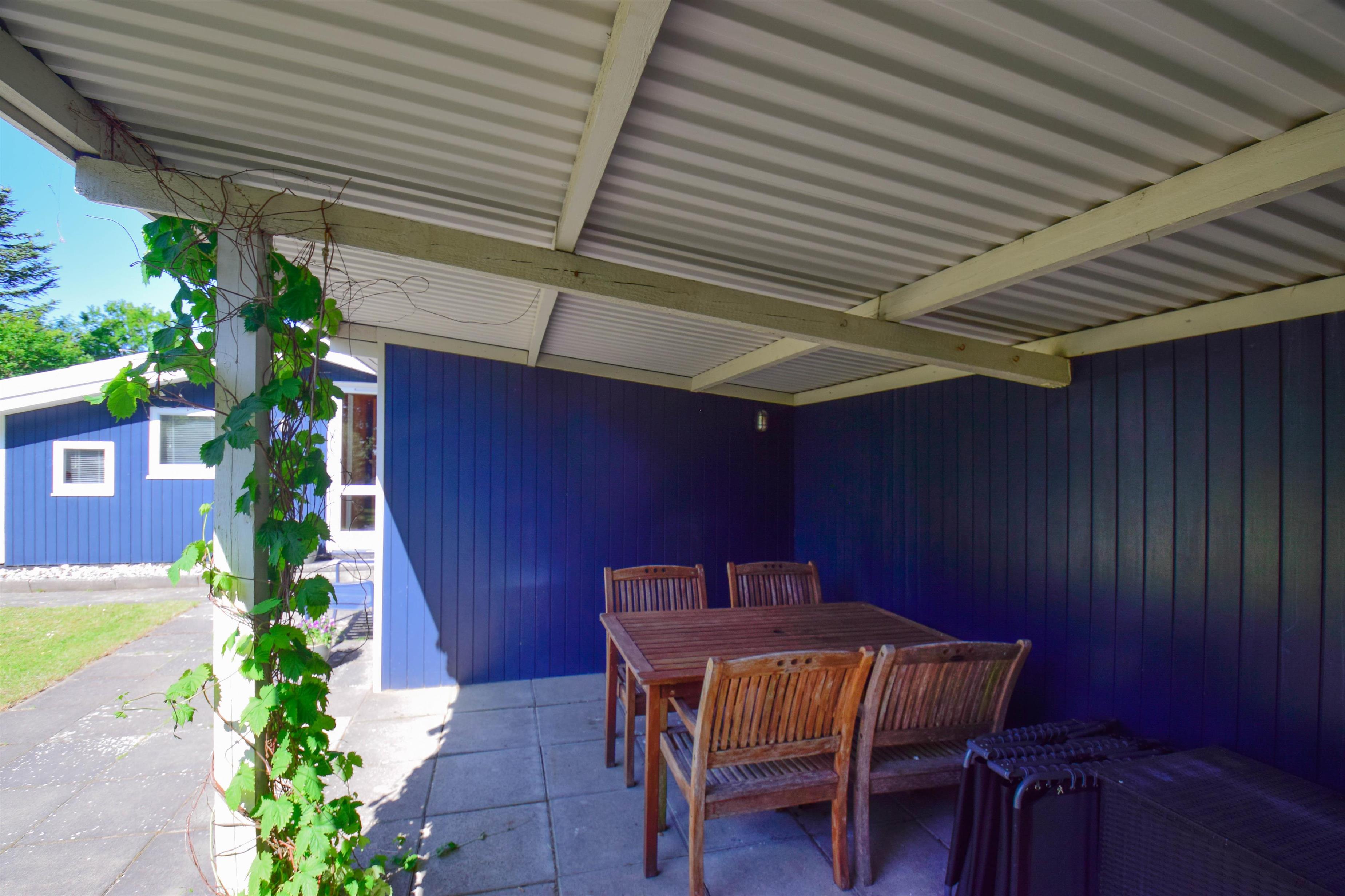 Feriehuset fremstår lyst og venligt med en praktisk indretning og god plads i de vigtigste rum. Det åbne køkken ligger i forbindelse med spiseplads og stue, hvor der er udgang til en lille overdækket terrasse – perfekt til en rolig kop kaffe eller en hyggelig stund i aftensolen.