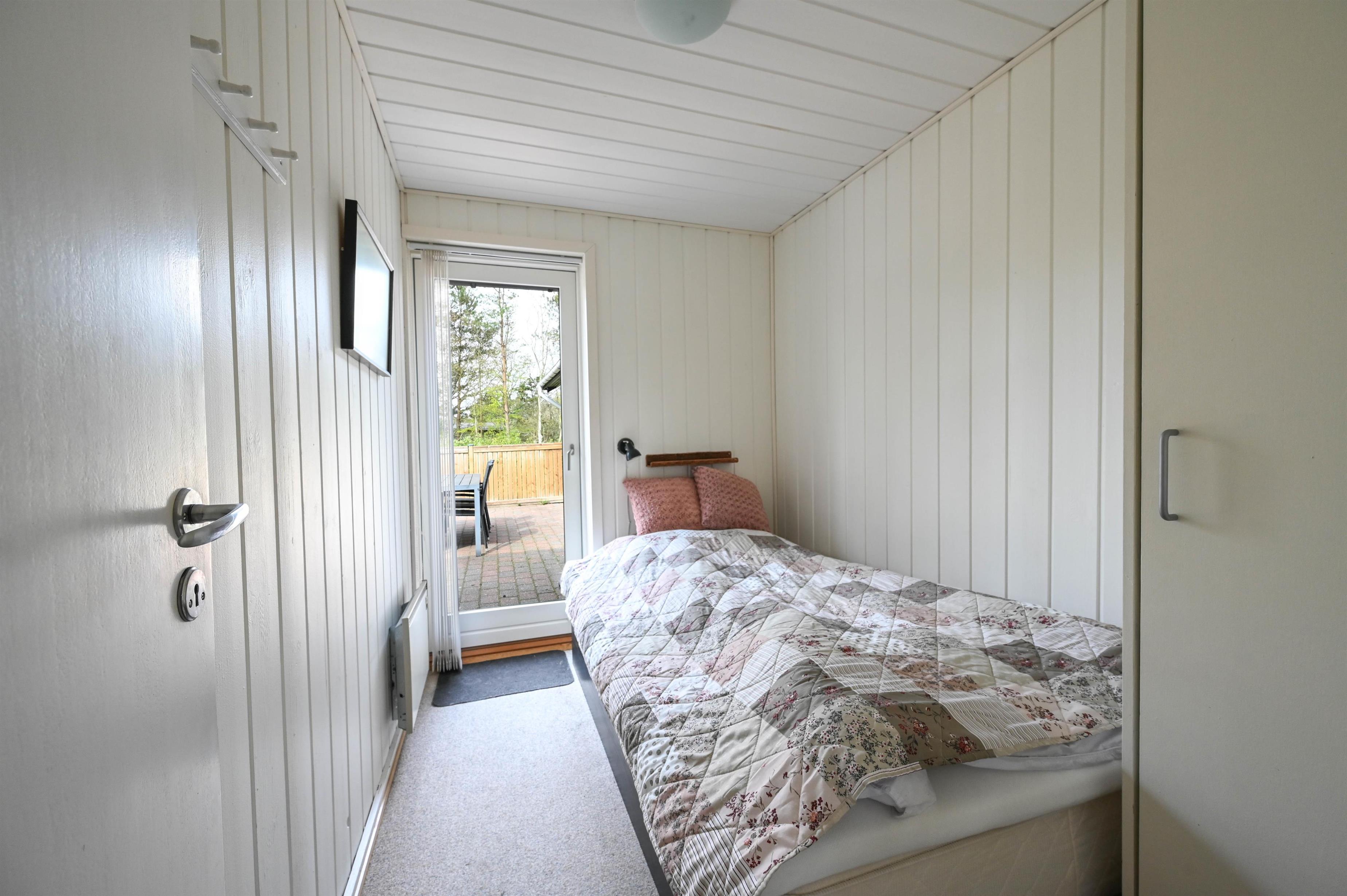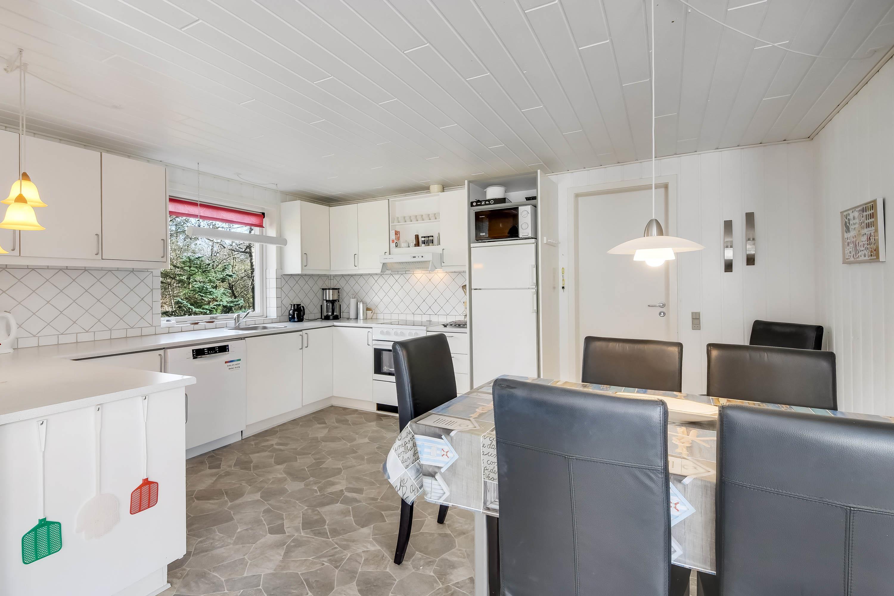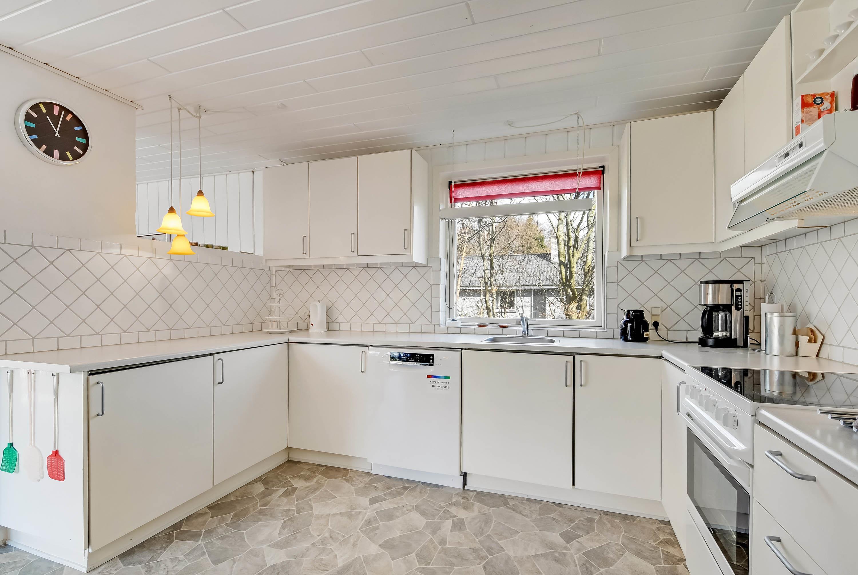 Køkkenet er veludstyret med god bordplads, mange skabe og opvaskemaskine. Det ligger i forbindelse med stuen, hvor brændeovnen er centralt placeret og skaber varme og stemning på de kølige dage. Fra stuen er der udgang til en dejlig terrasse med masser af læ – det perfekte sted til morgenkaffen, solbadning eller aftensmad i det fri.