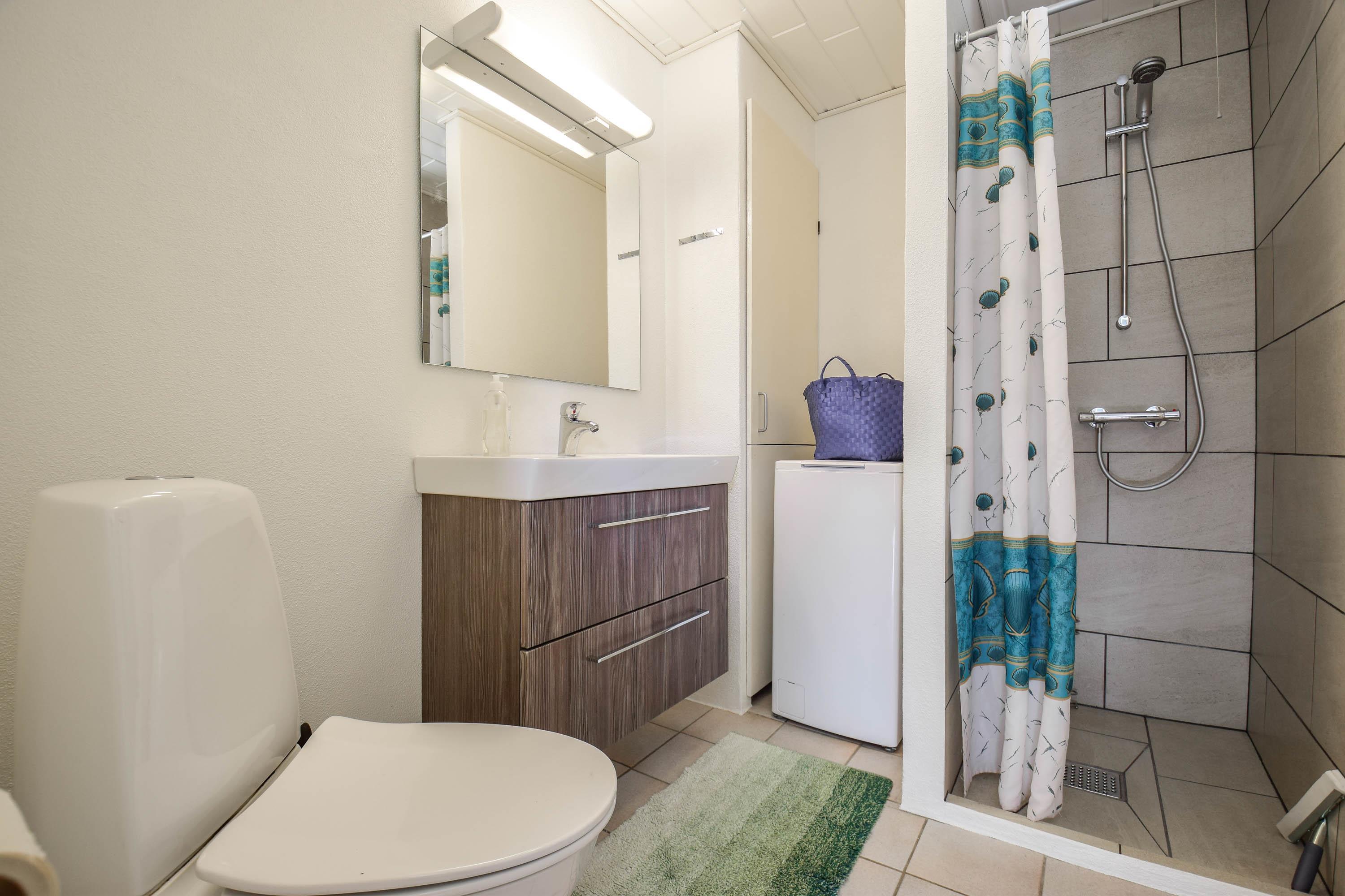 Badeværelse med bruseniche og topbetjent vaskemaskine