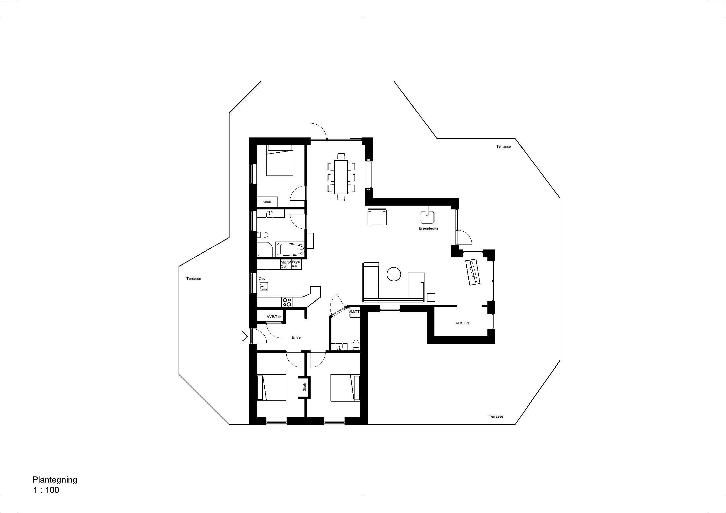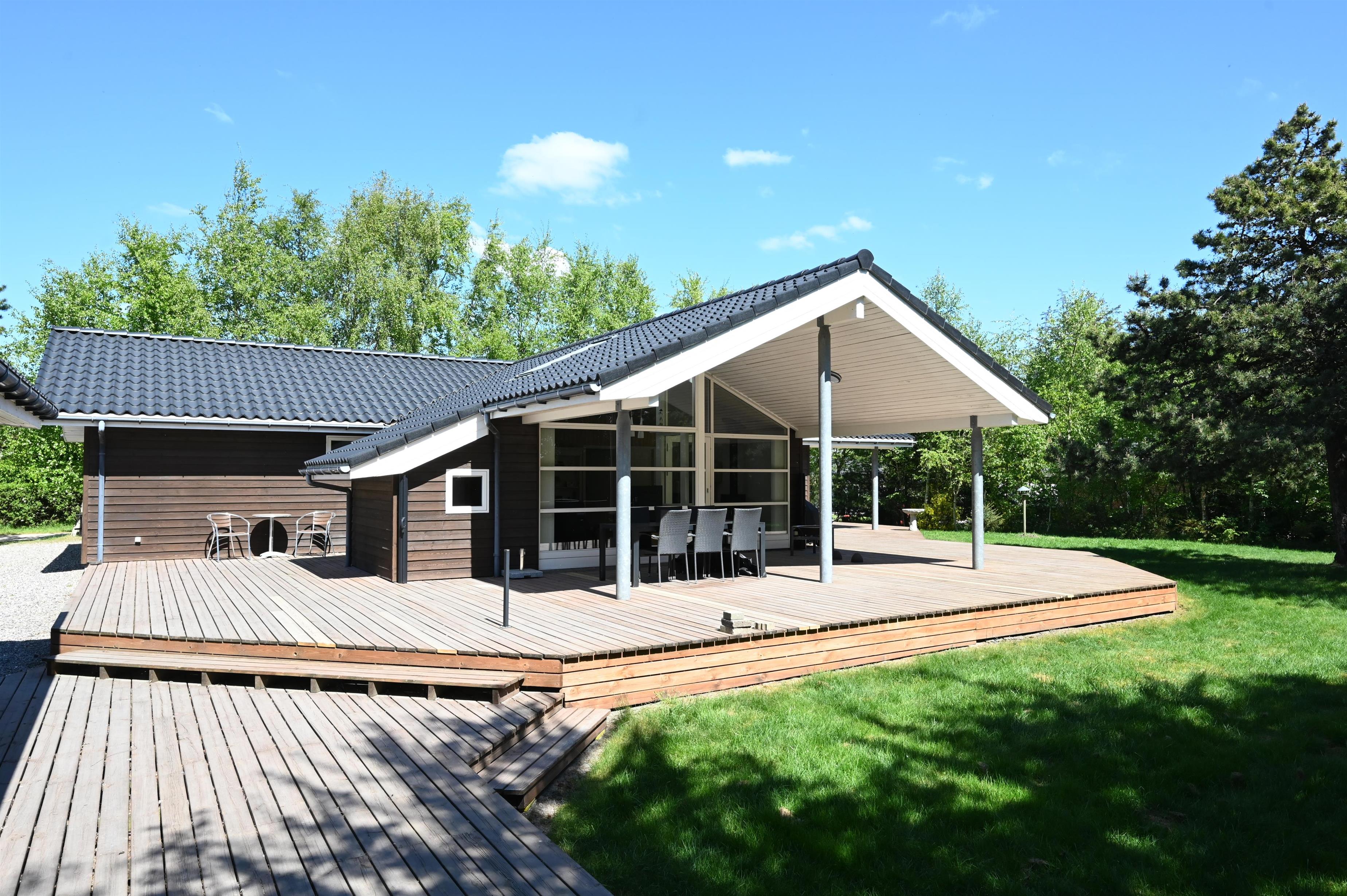 Udenfor er der en stor græsplæne, hvor børnene kan boltre sig og spille bold i de små fodboldmål. Rundt om huset er der anlagt dejlig store træterrasser, der gør det muligt at finde læ, sol og skygge, alt efter hvad man ønsker sig.