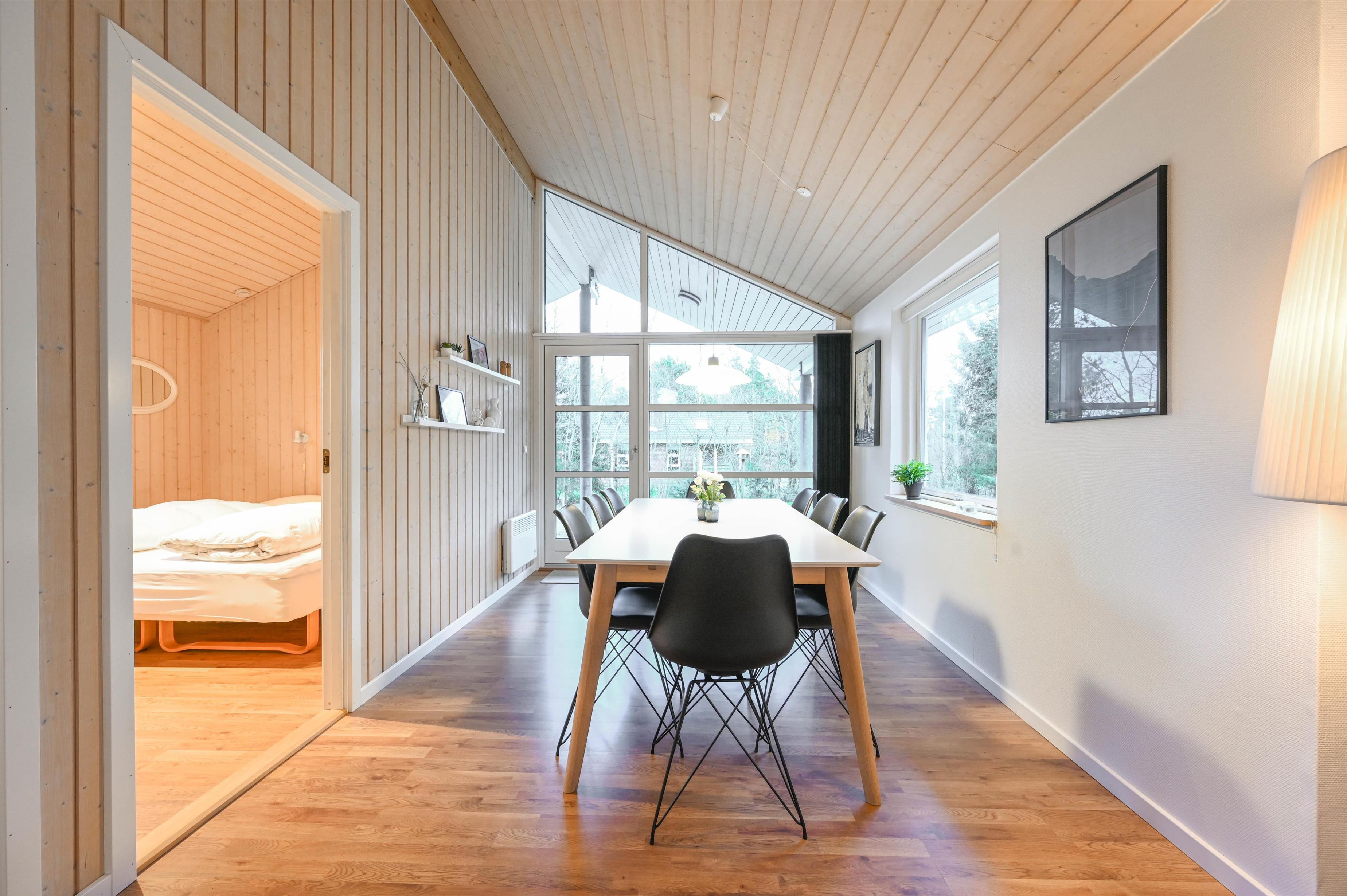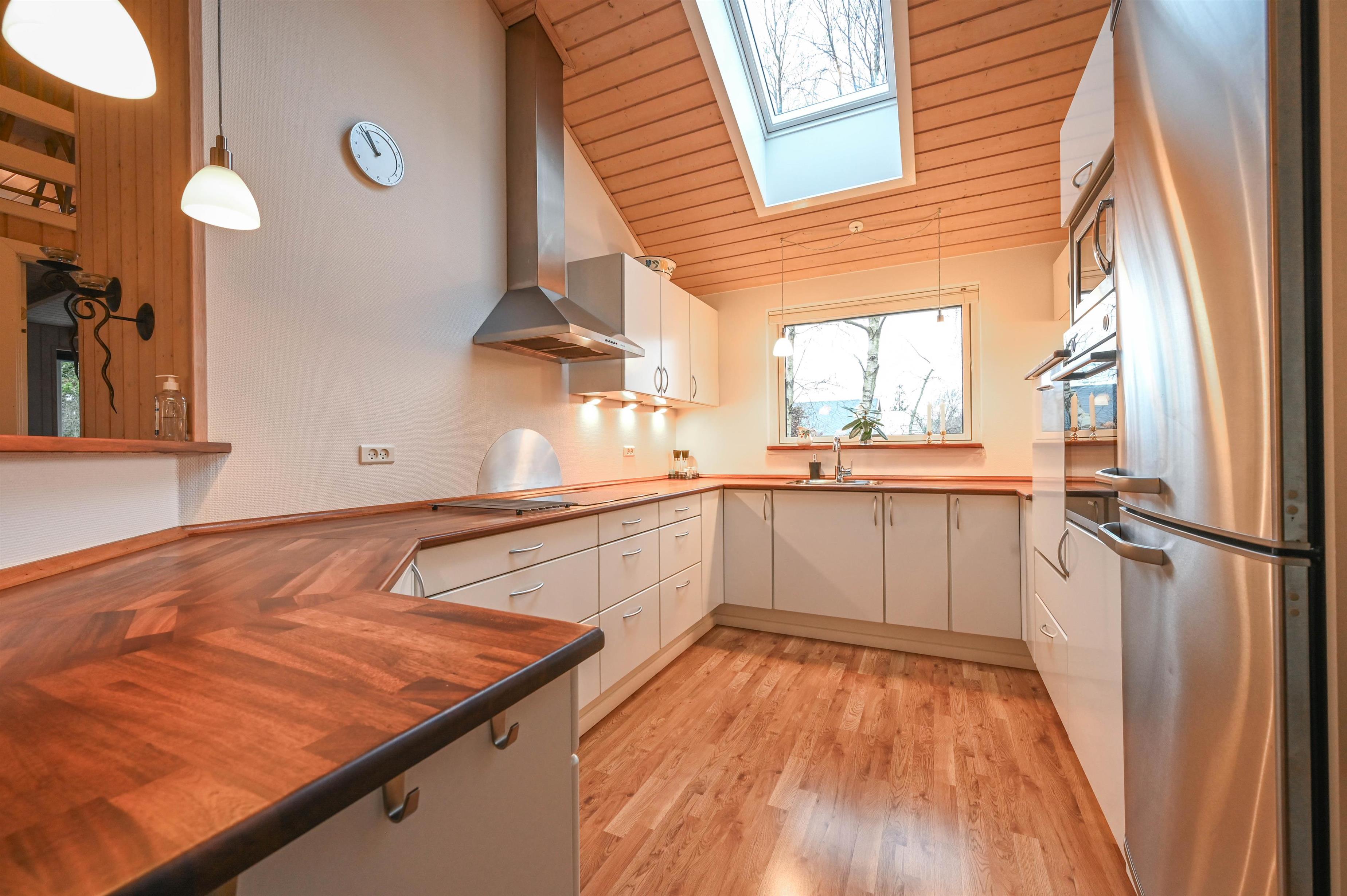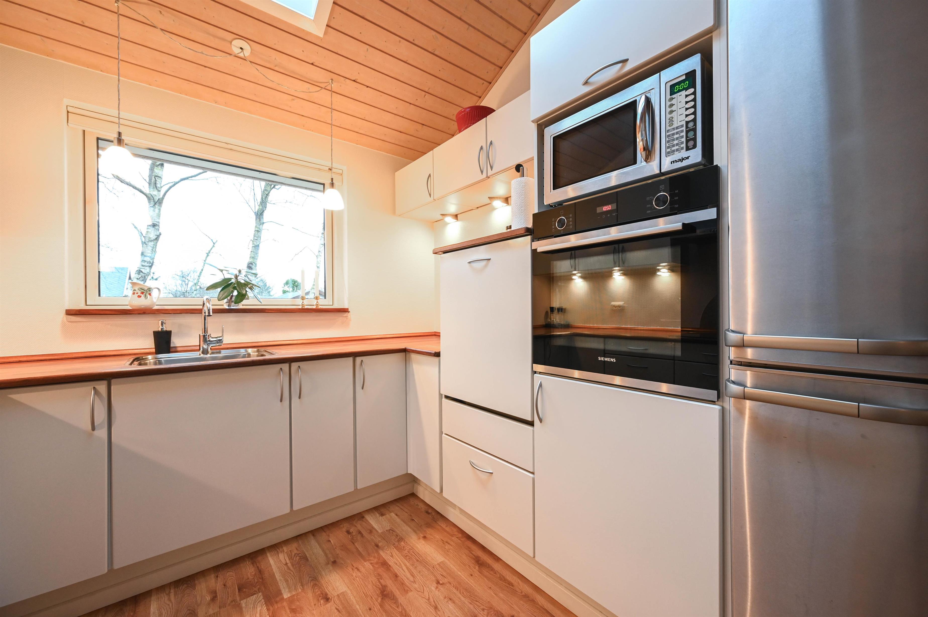 Huset er rigtig godt indrettet med hyggeligt og veludstyret køkken, stor stue og spiseafdeling hvor de store vinduespartier bevirker at der kommer en masse lys ind.