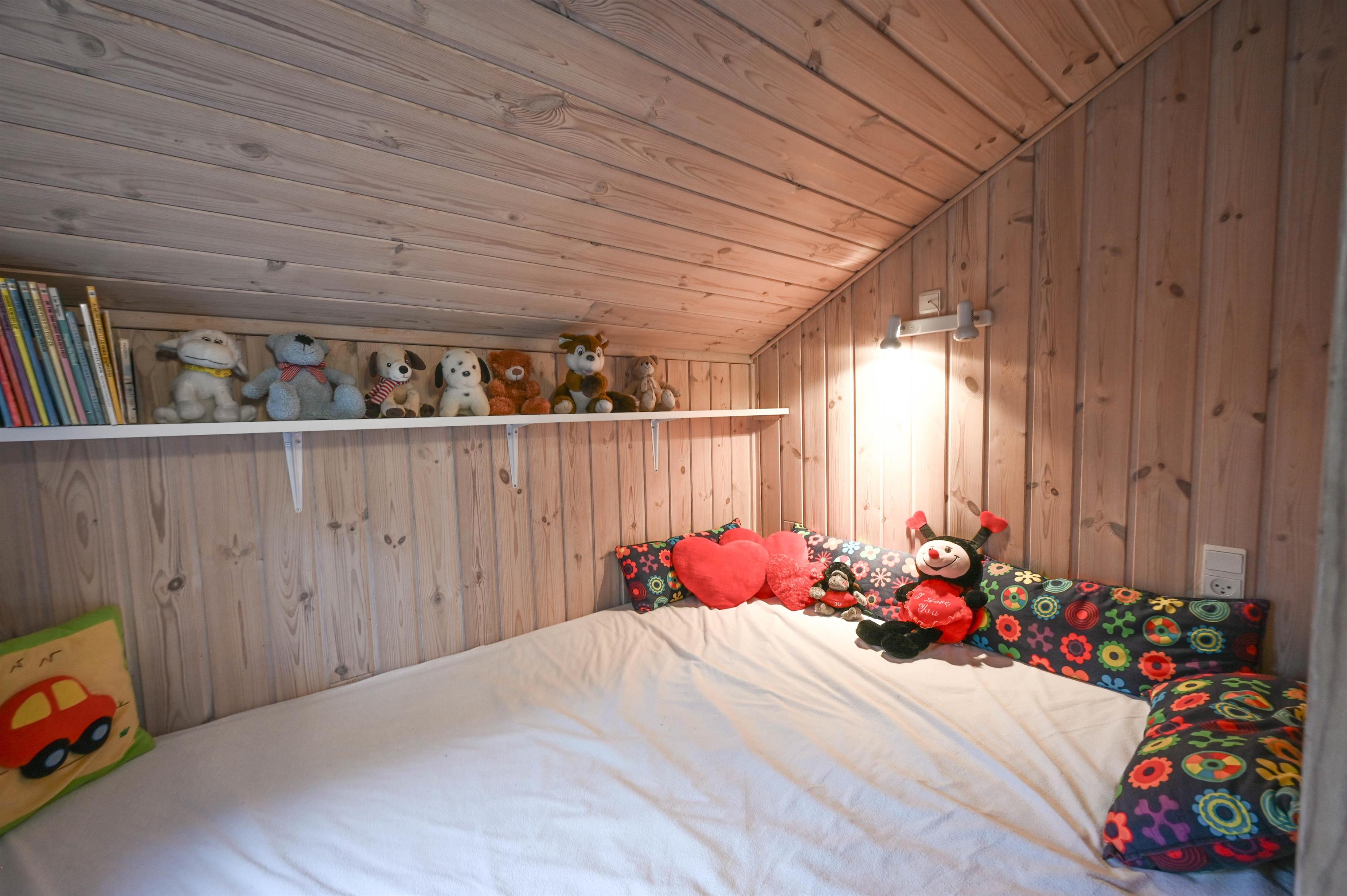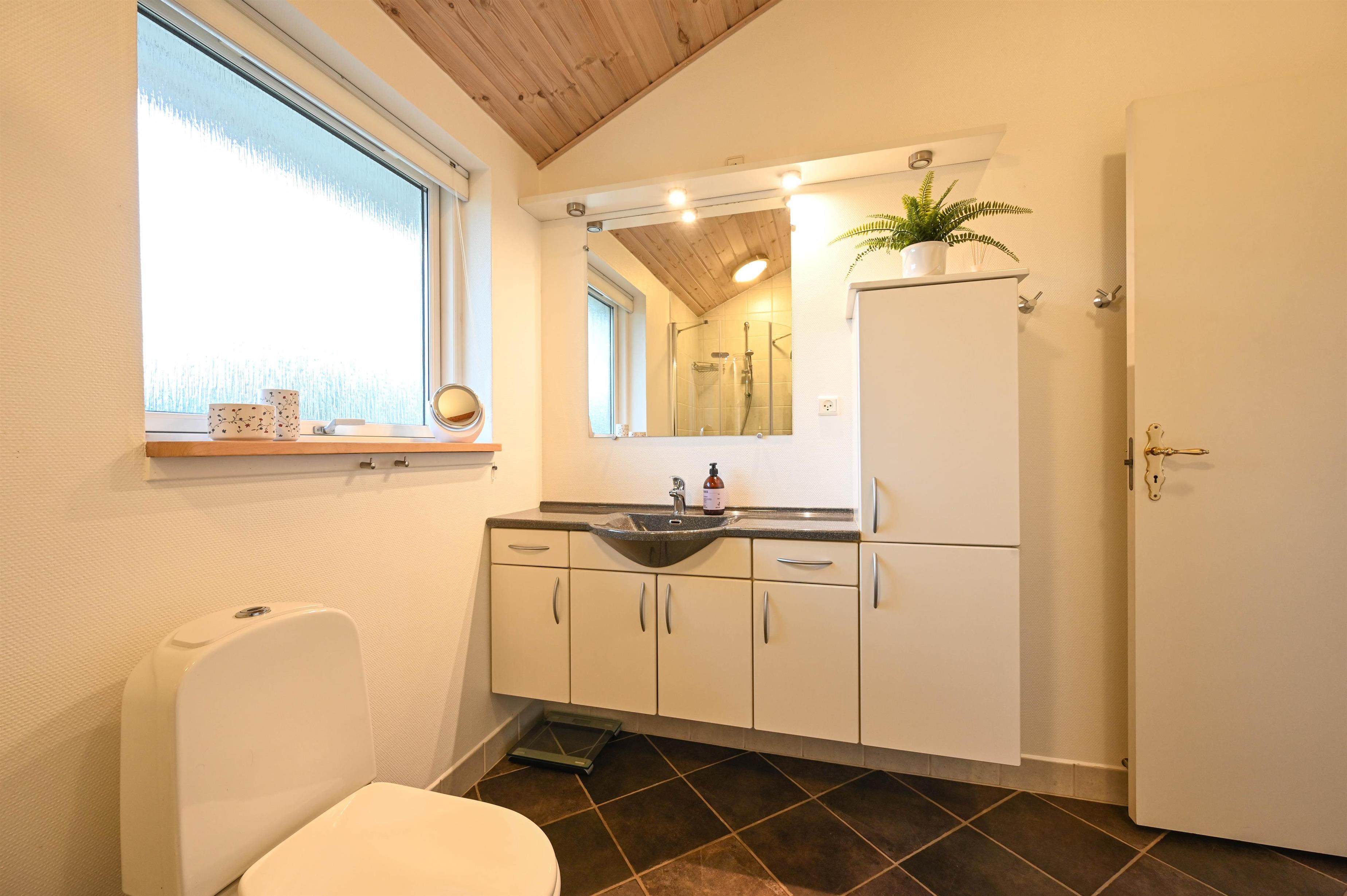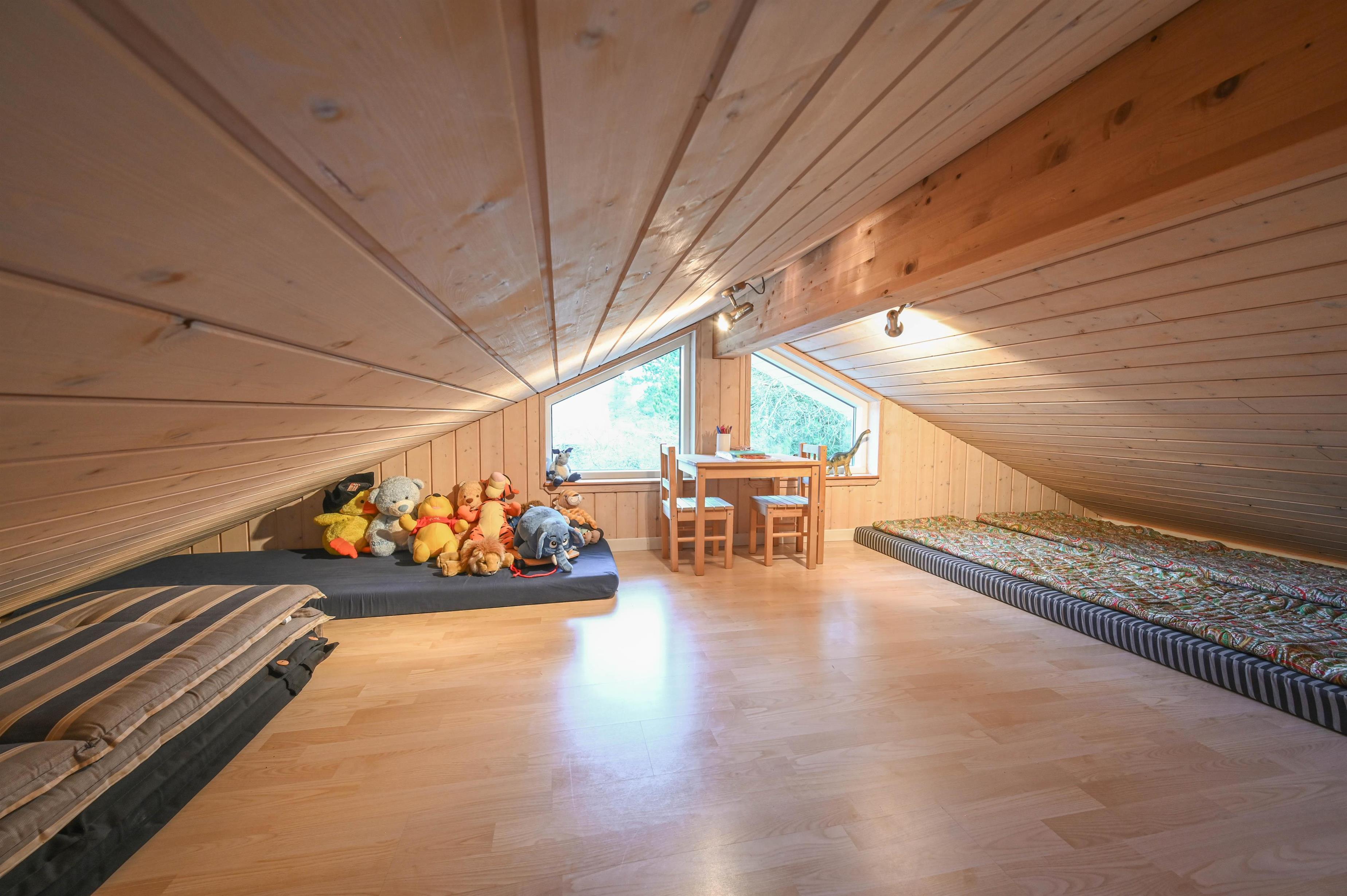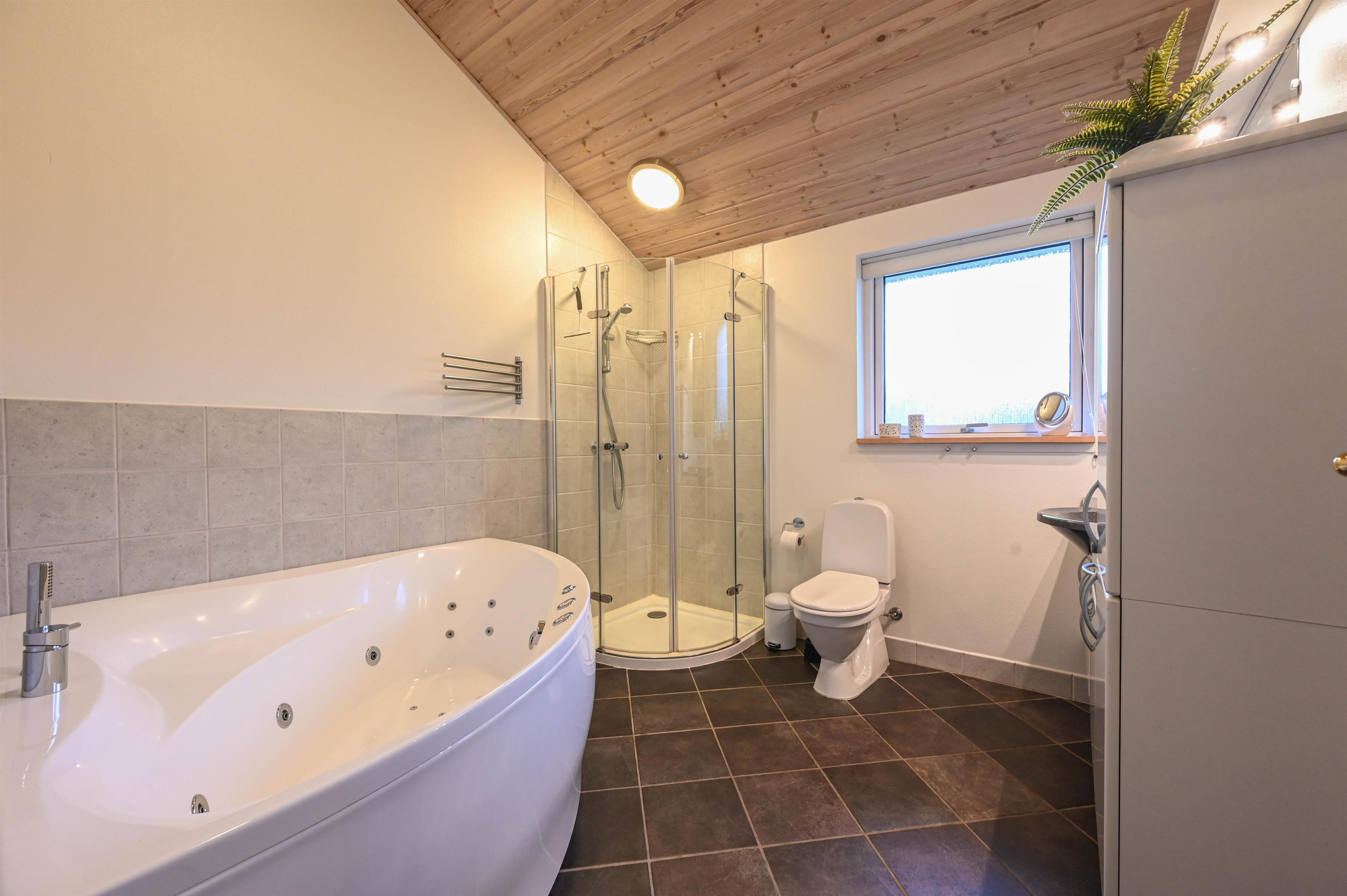 Derudover et dejligt stort badeværelse med spabad, et gæstetoilet, 3 gode soveværelser og en hems og en alkove til børnene.