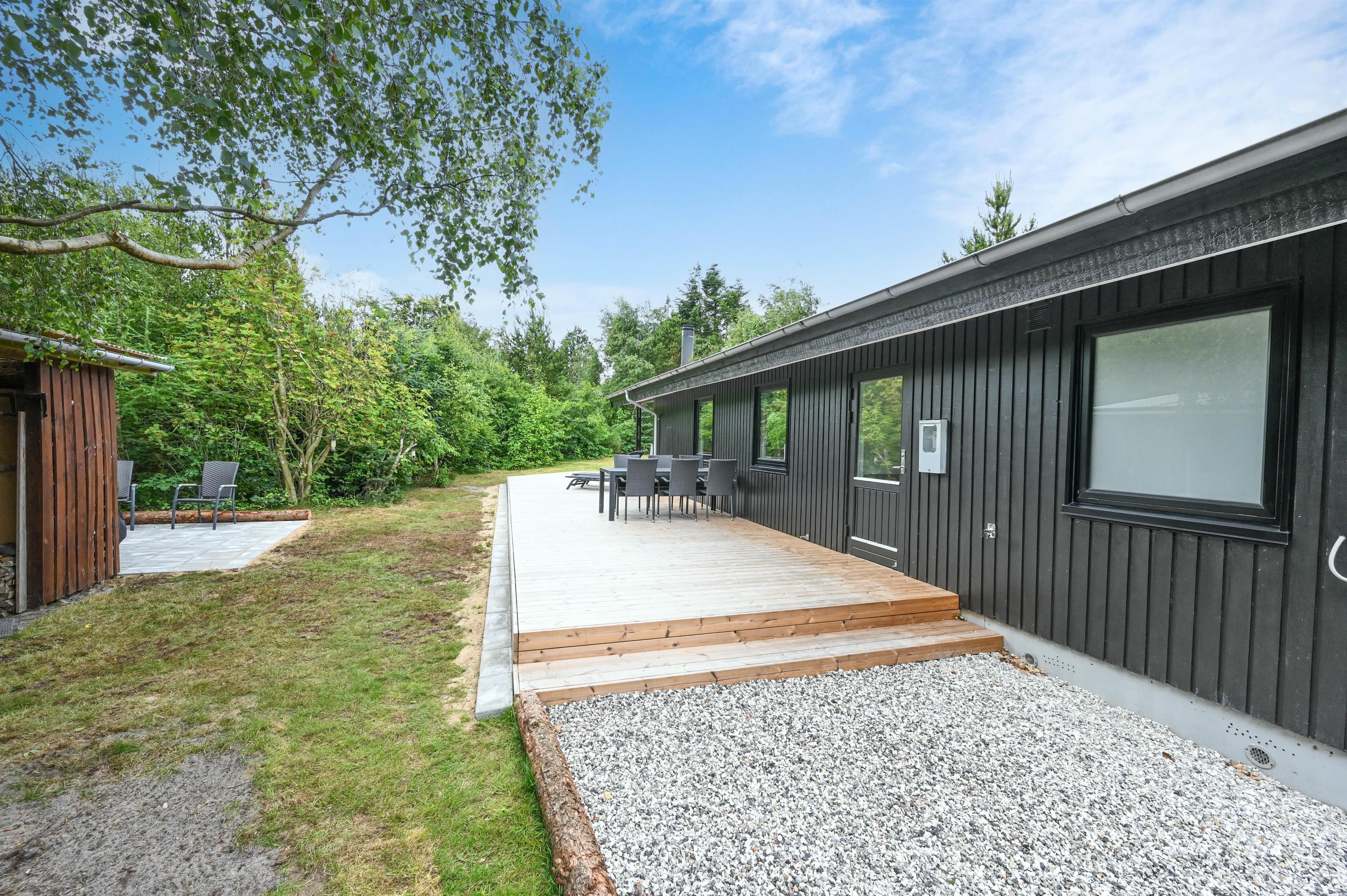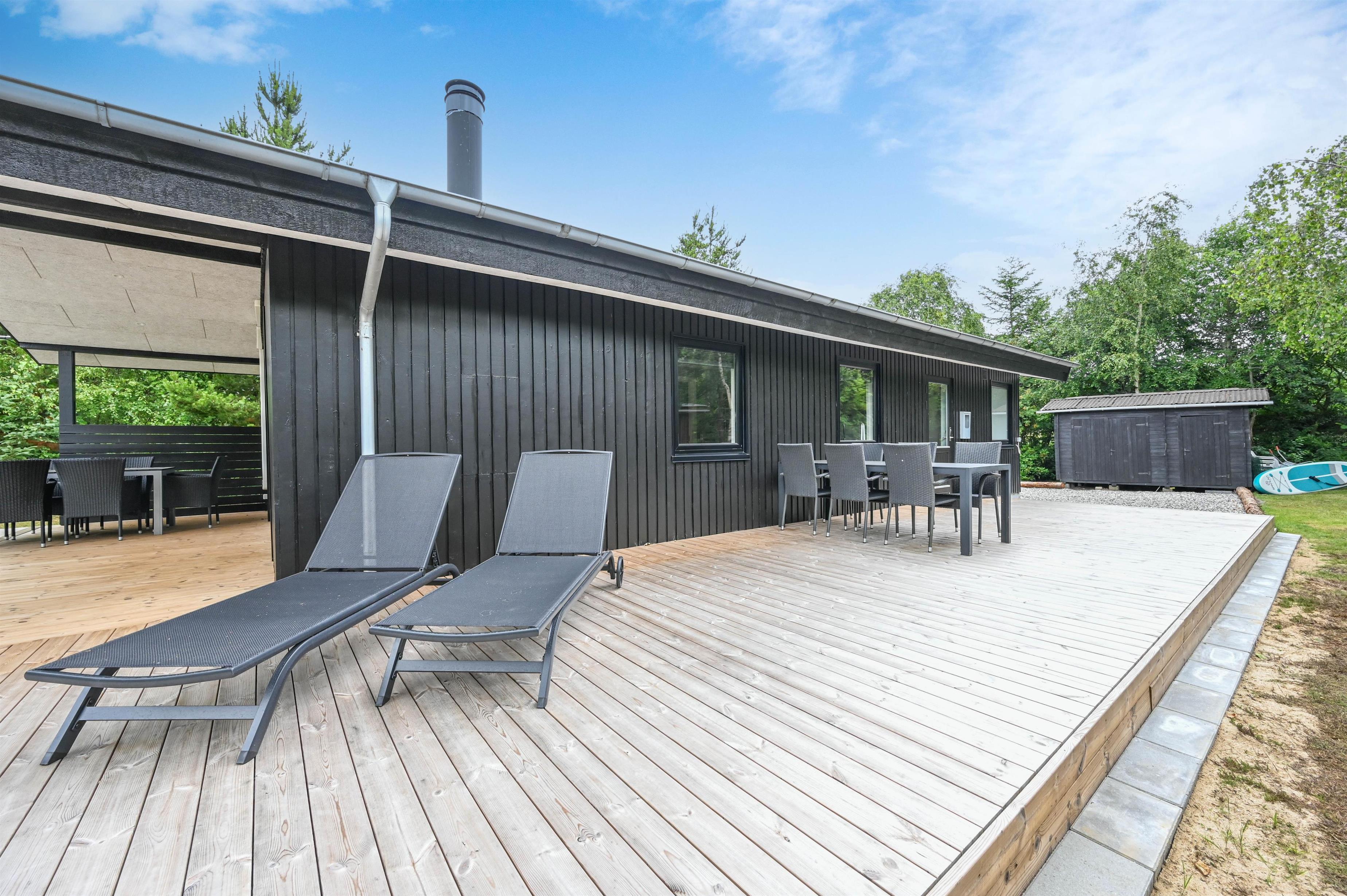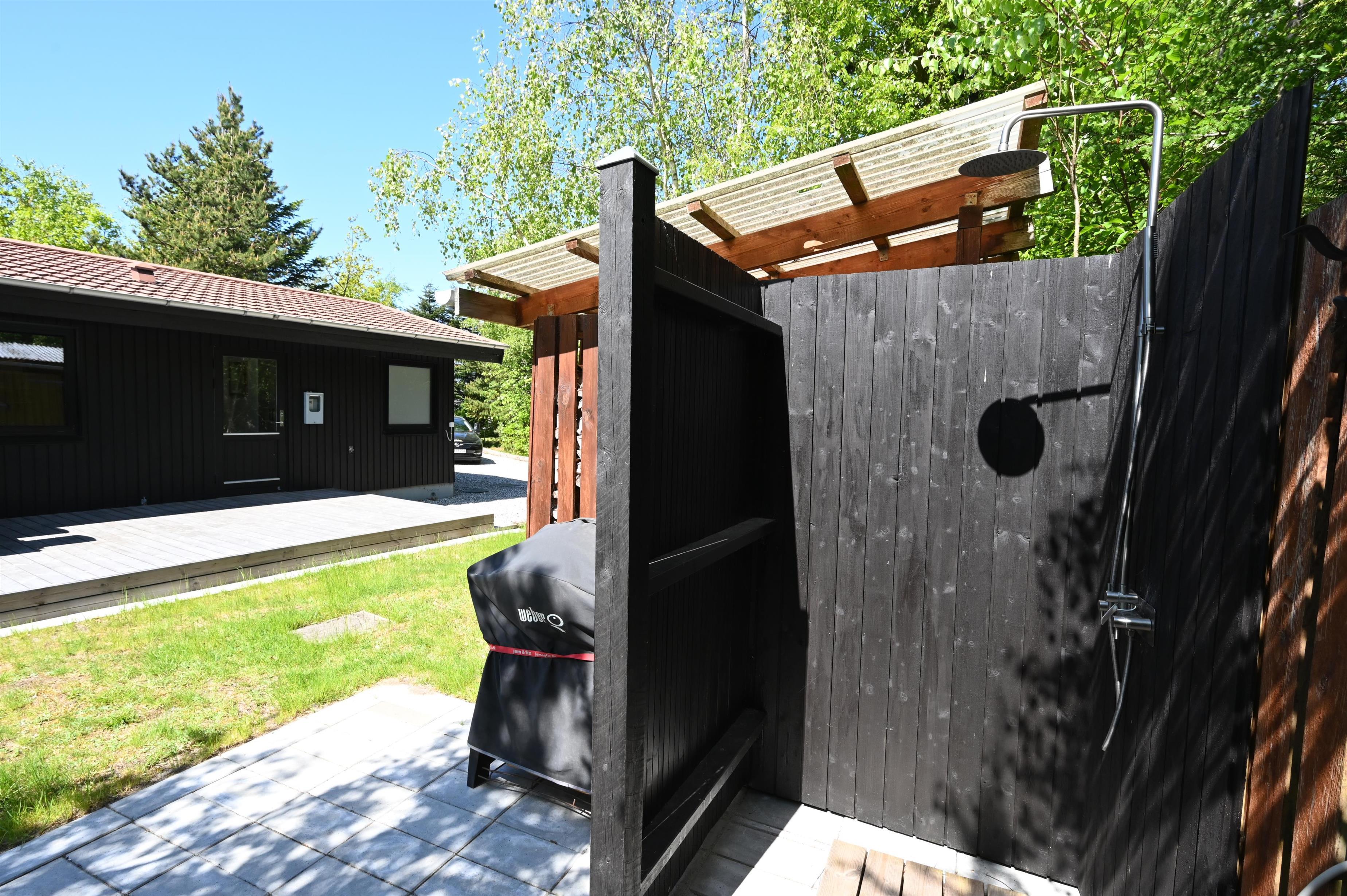 Omkring huset breder der sig en stor, delvist overdækket træterrasse, hvor man kan nyde solen dagen igennem eller tilbringe de lange sommeraftener med grill og god mad. Derudover findes en ekstra terrasse med udebruser – en skøn detalje efter en tur til fjorden eller stranden.