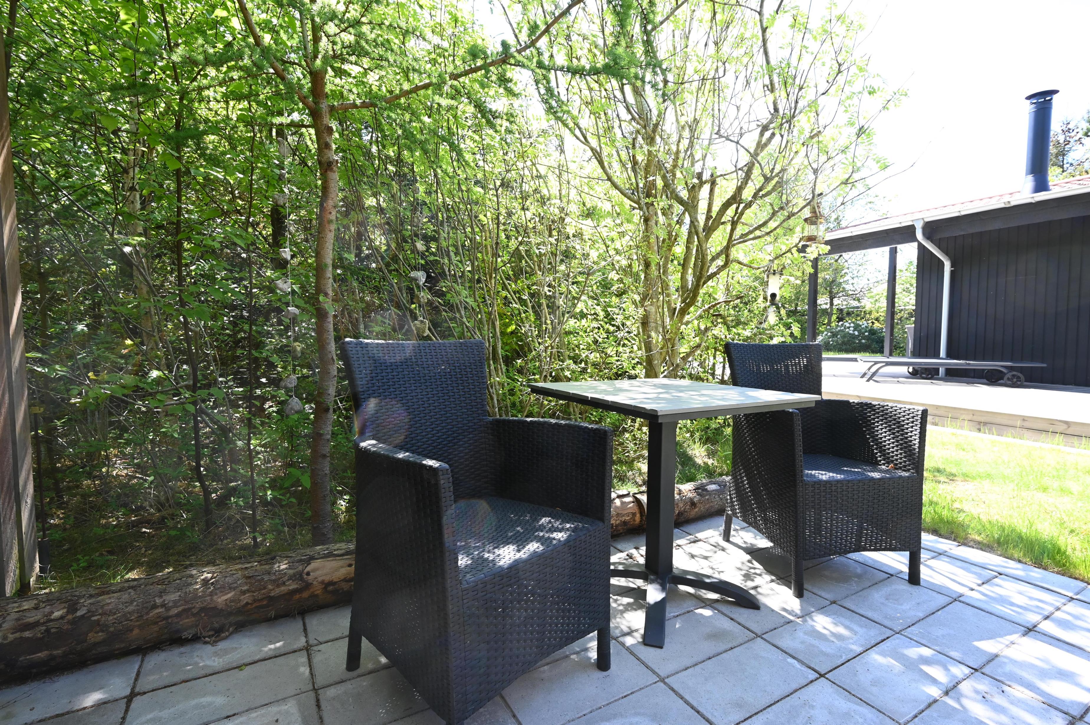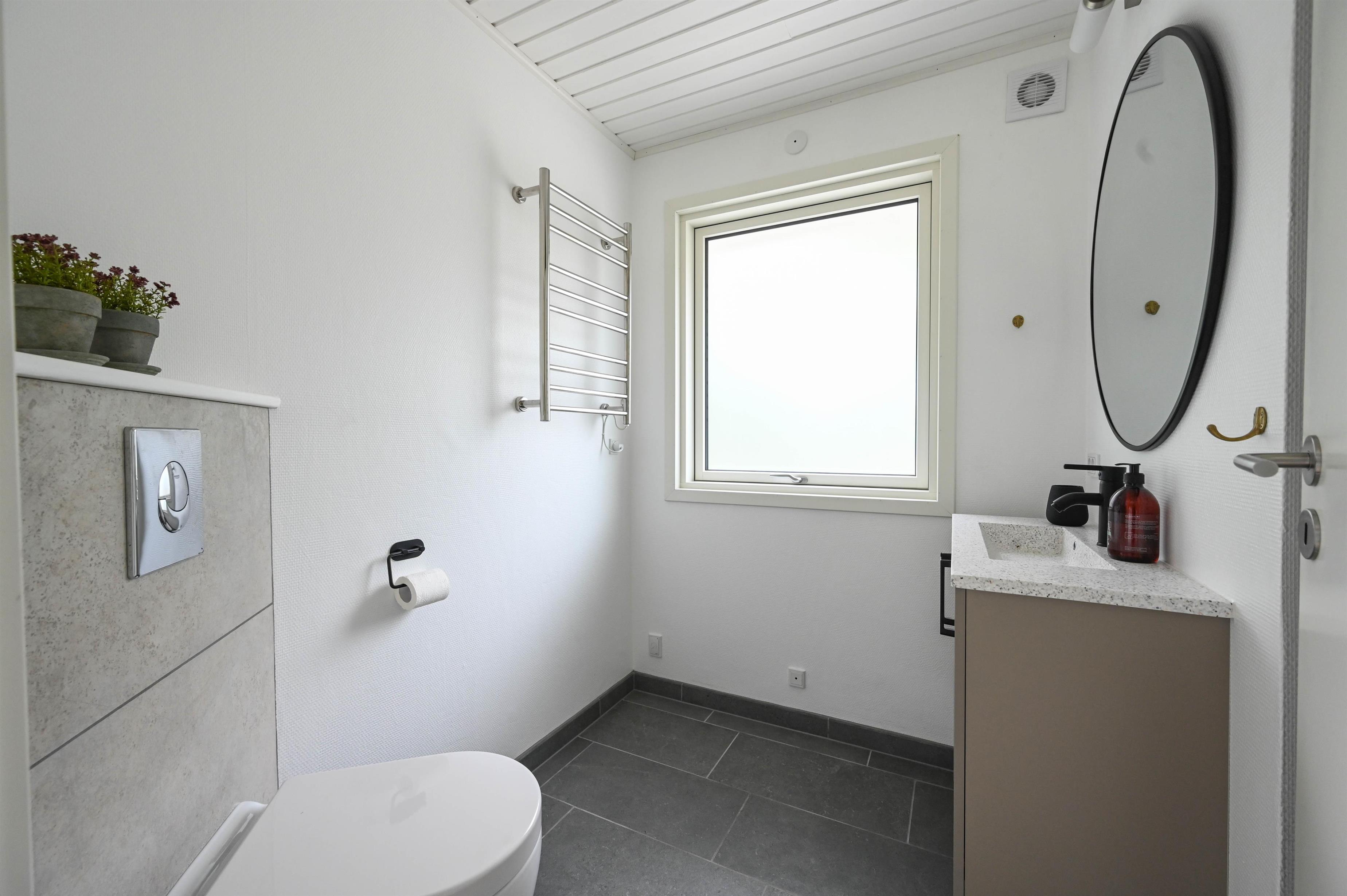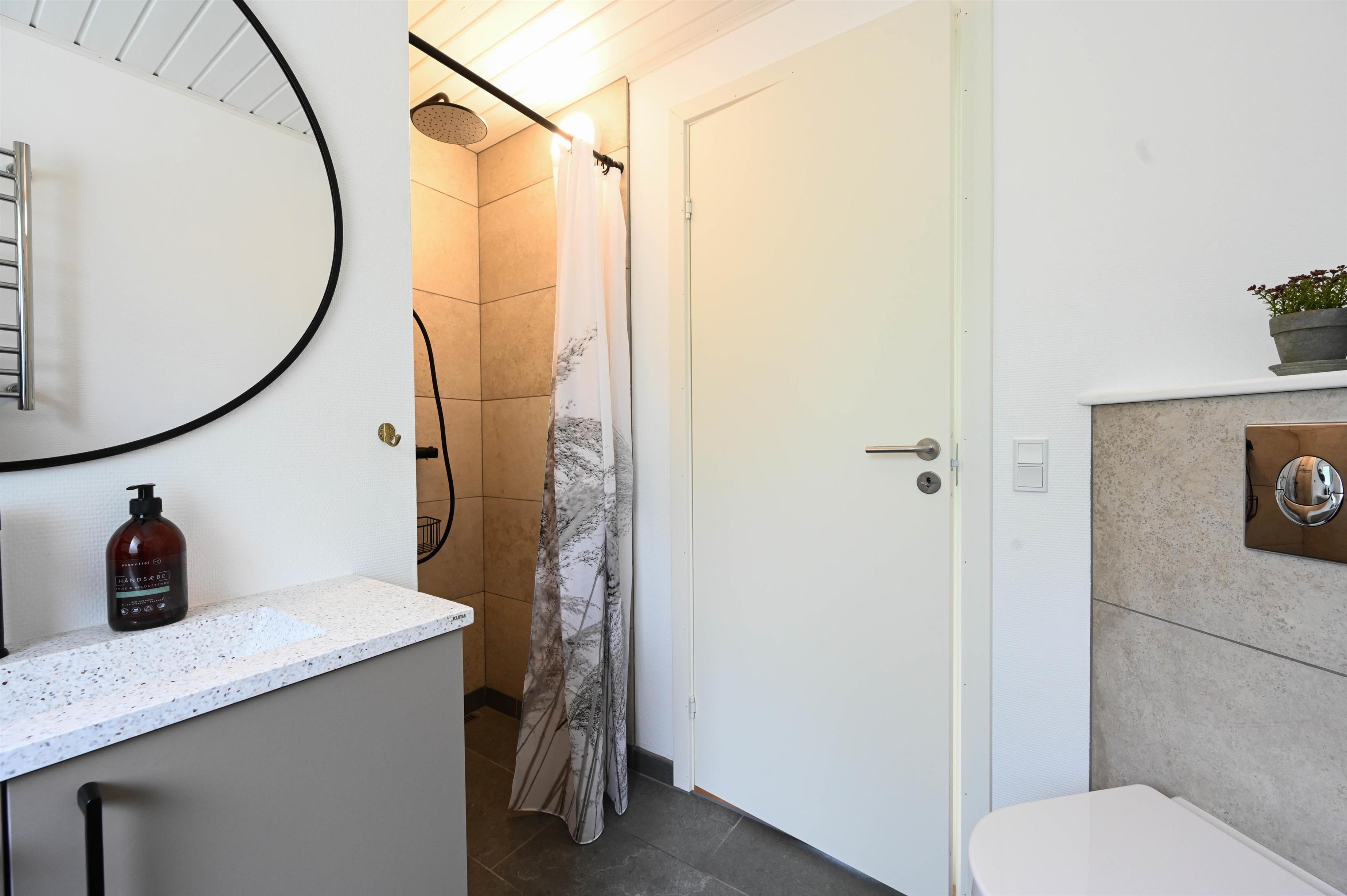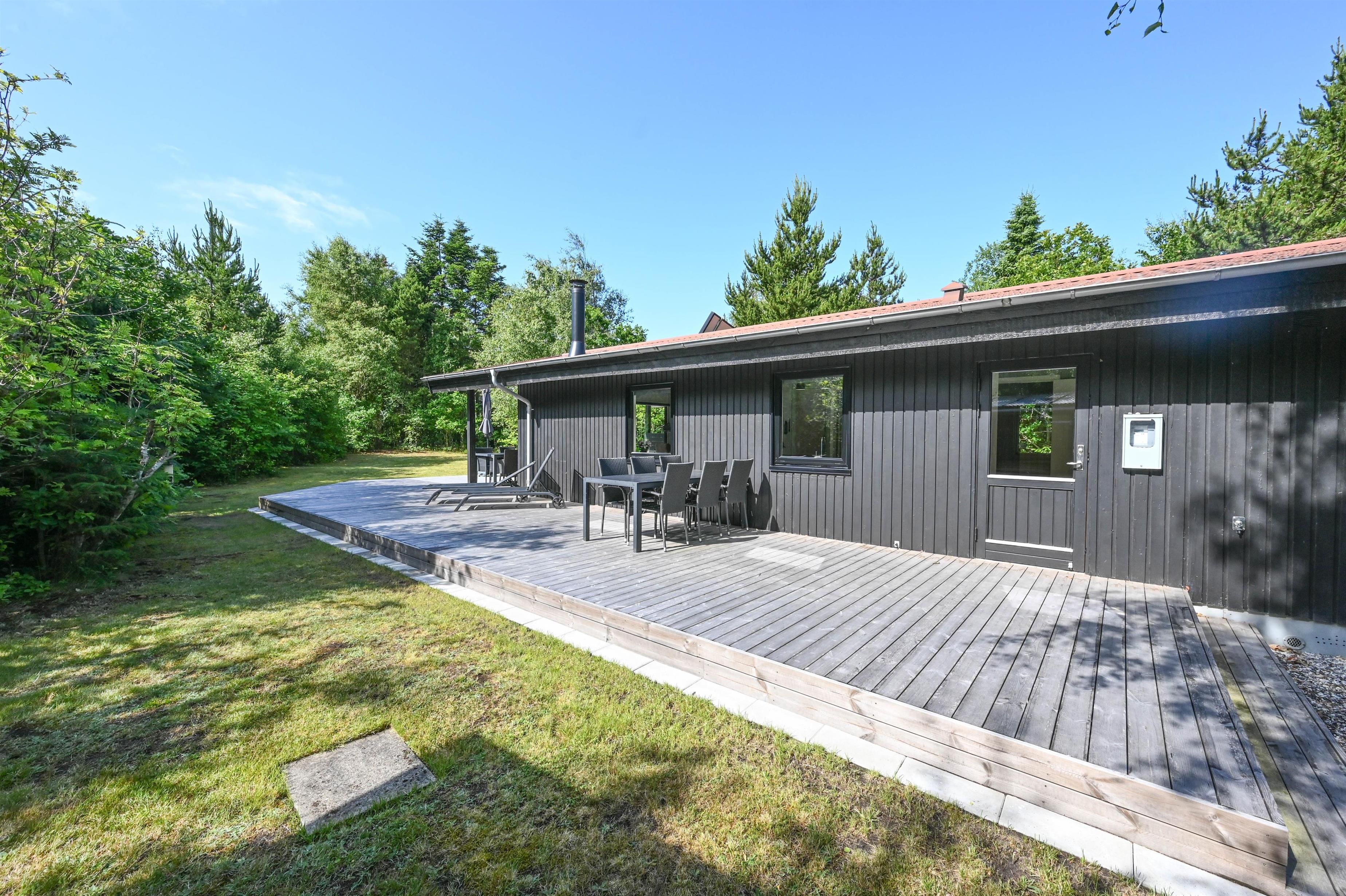 Omkring huset breder der sig en stor, delvist overdækket træterrasse, hvor man kan nyde solen dagen igennem eller tilbringe de lange sommeraftener med grill og god mad. Derudover findes en ekstra terrasse med udebruser – en skøn detalje efter en tur til fjorden eller stranden.