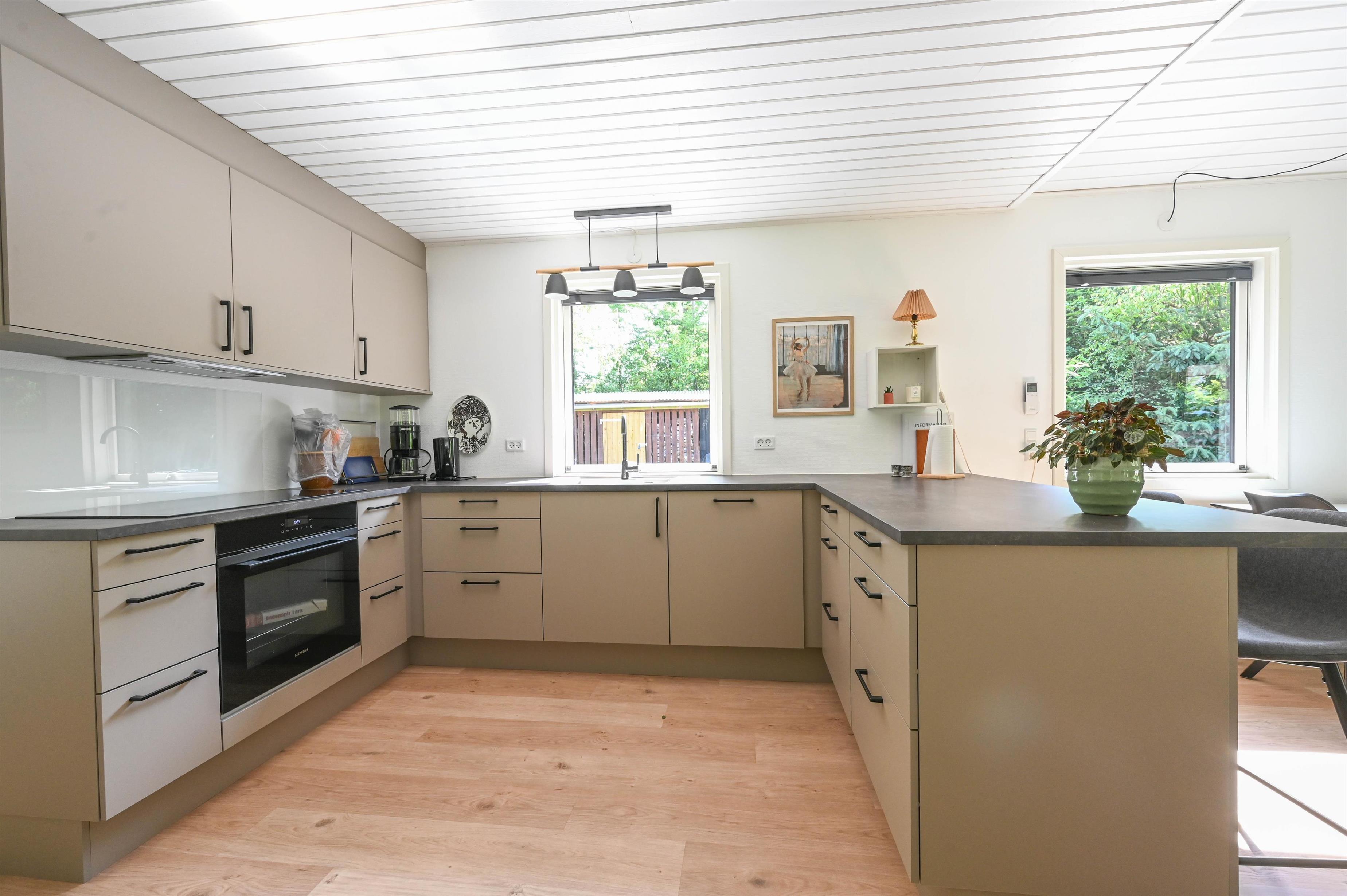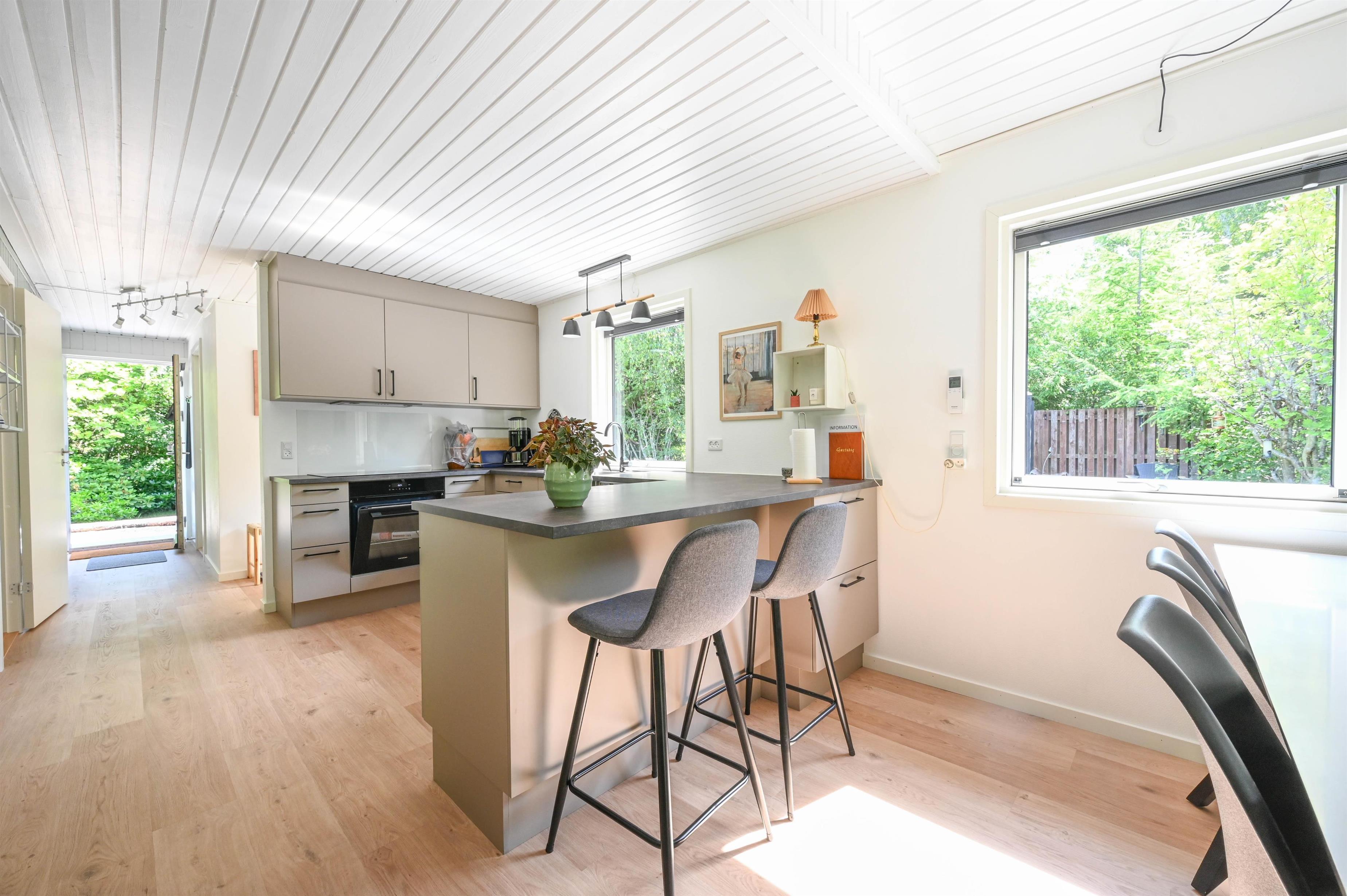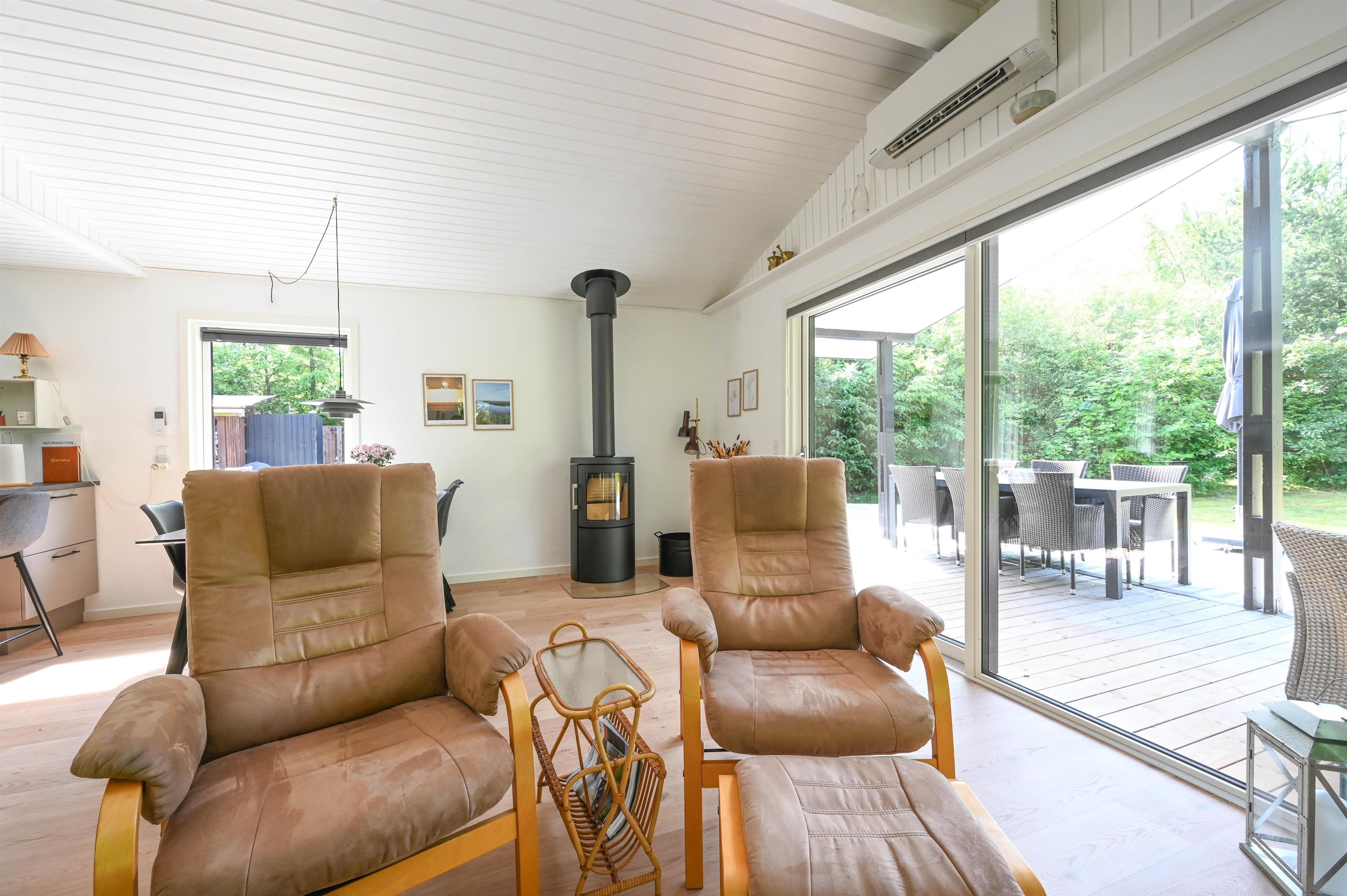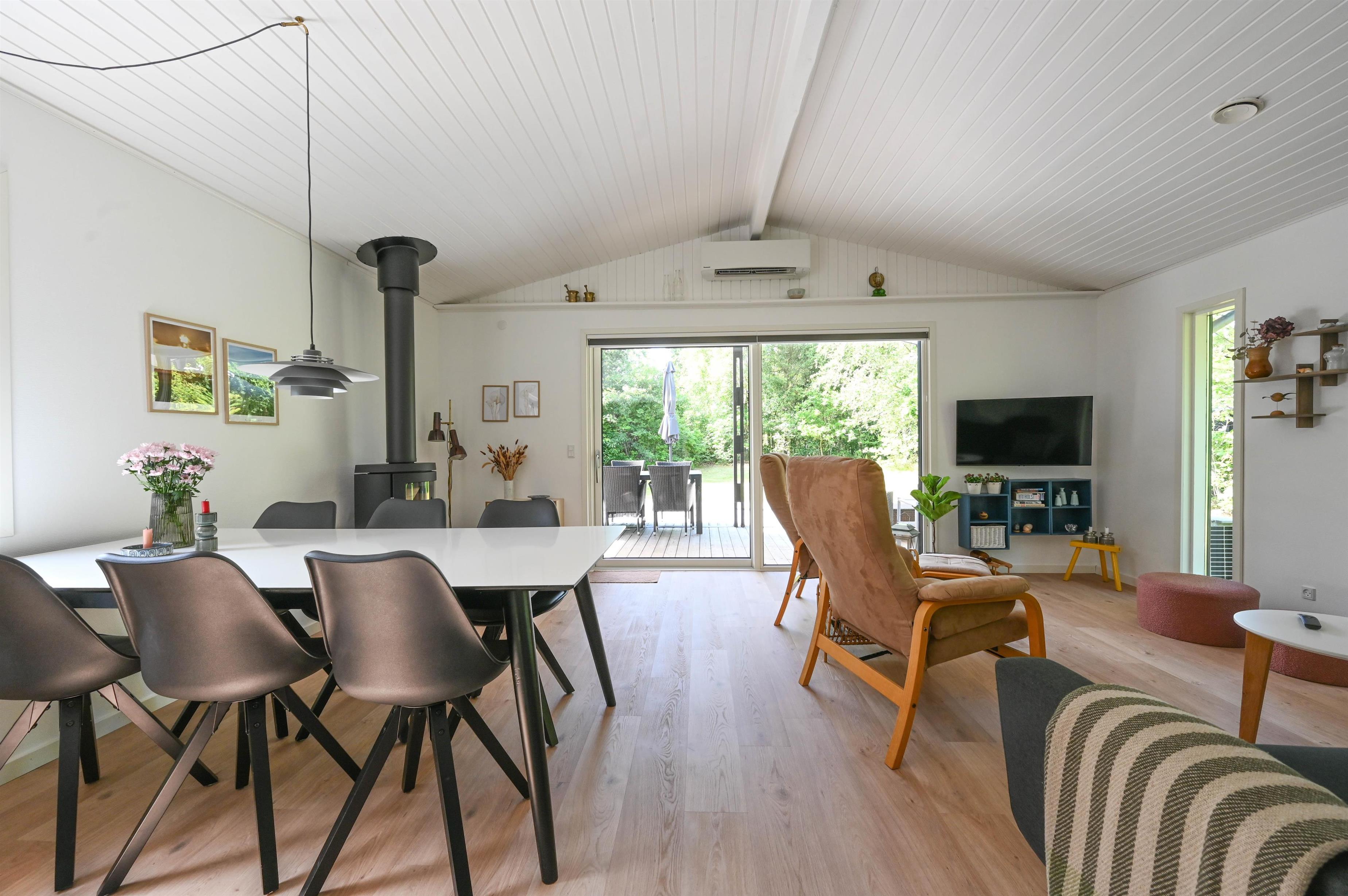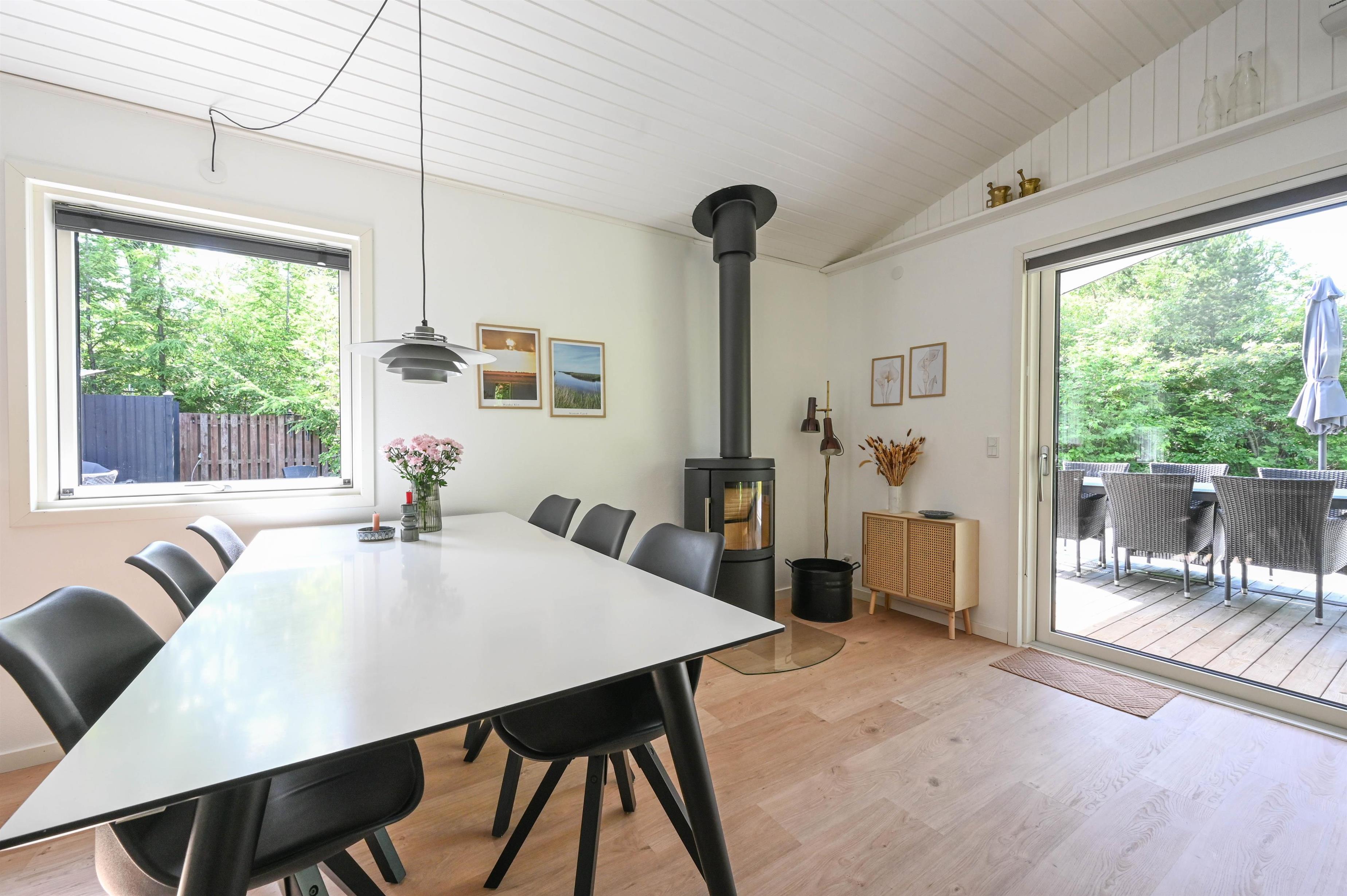 Feriehuset fremstår lyst, venligt og stilfuldt indrettet. Det flotte køkken ligger i åben forbindelse med stuen, hvor der både er spiseplads og sofahjørne – og herfra er der direkte udgang til den store terrasse. Brændeovnen i stuen skaber en hyggelig stemning, og de store vinduespartier giver et flot lysindfald og bringer naturen helt tæt på.