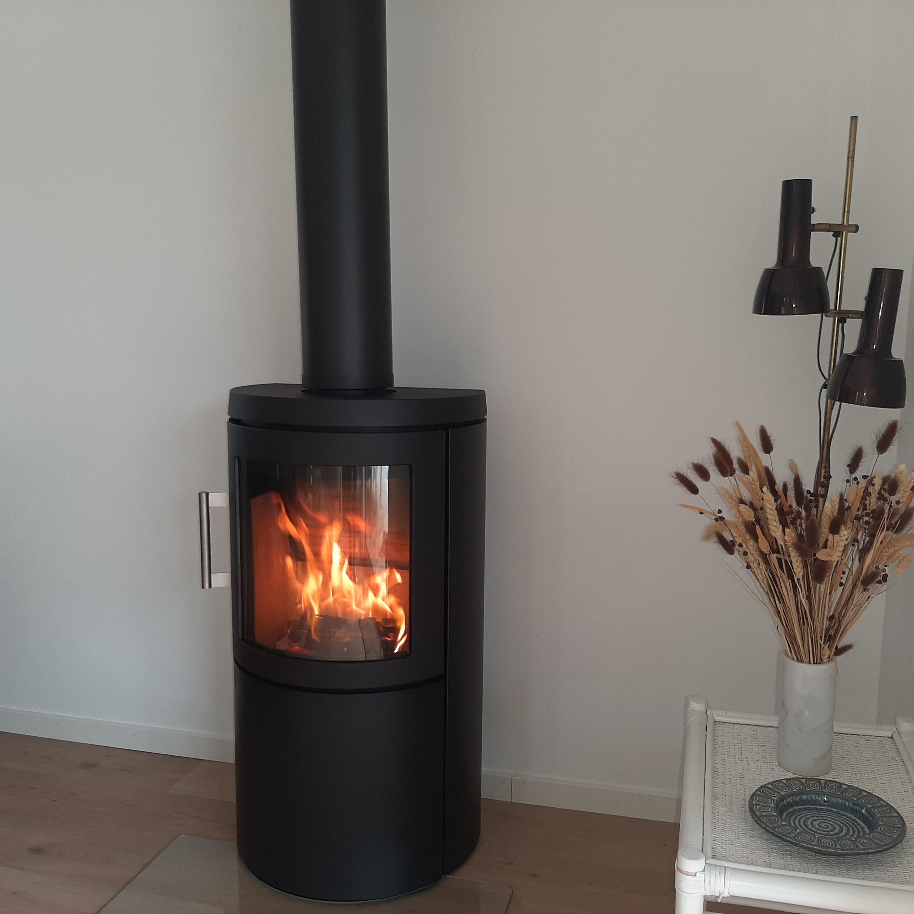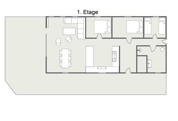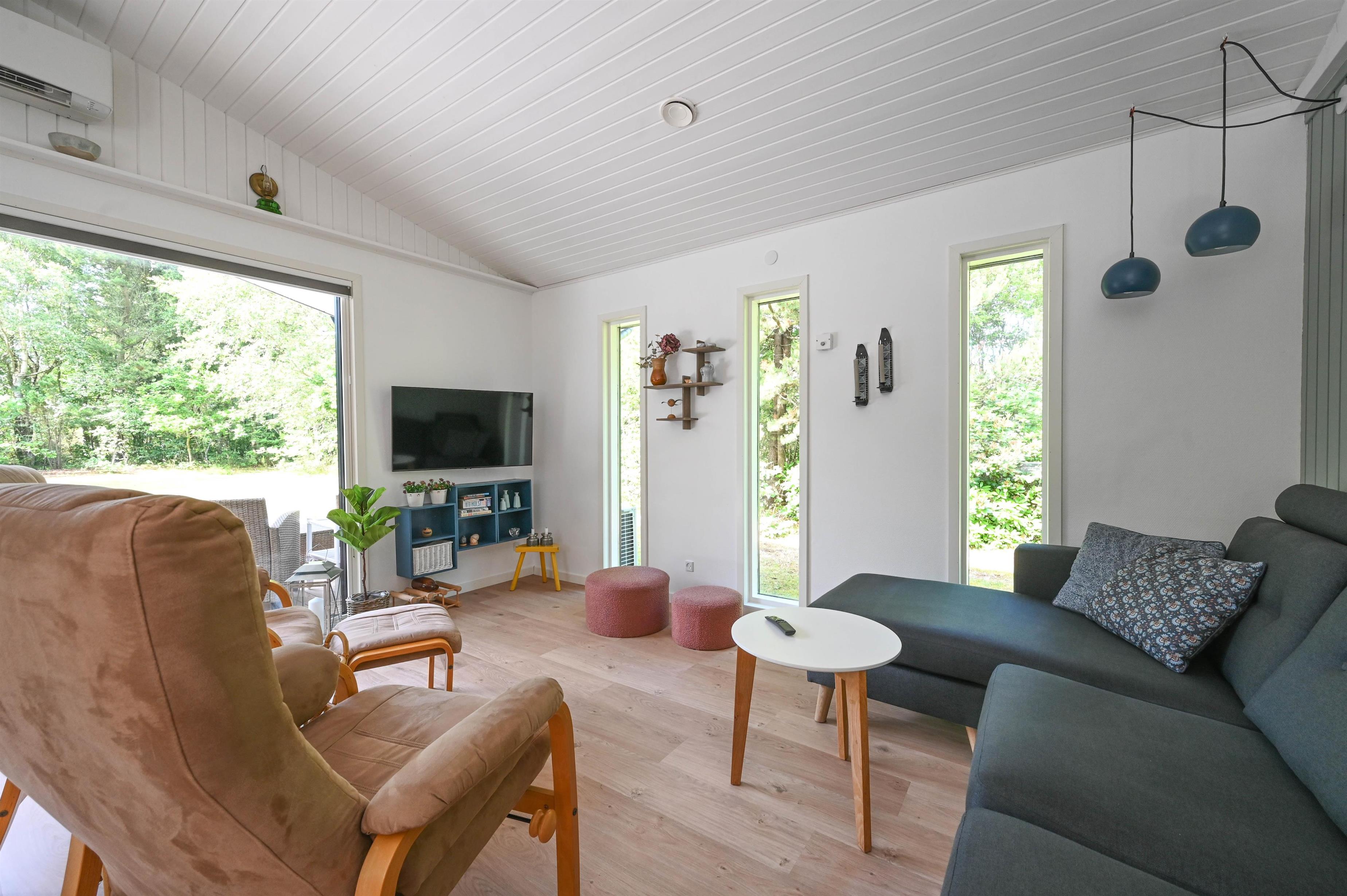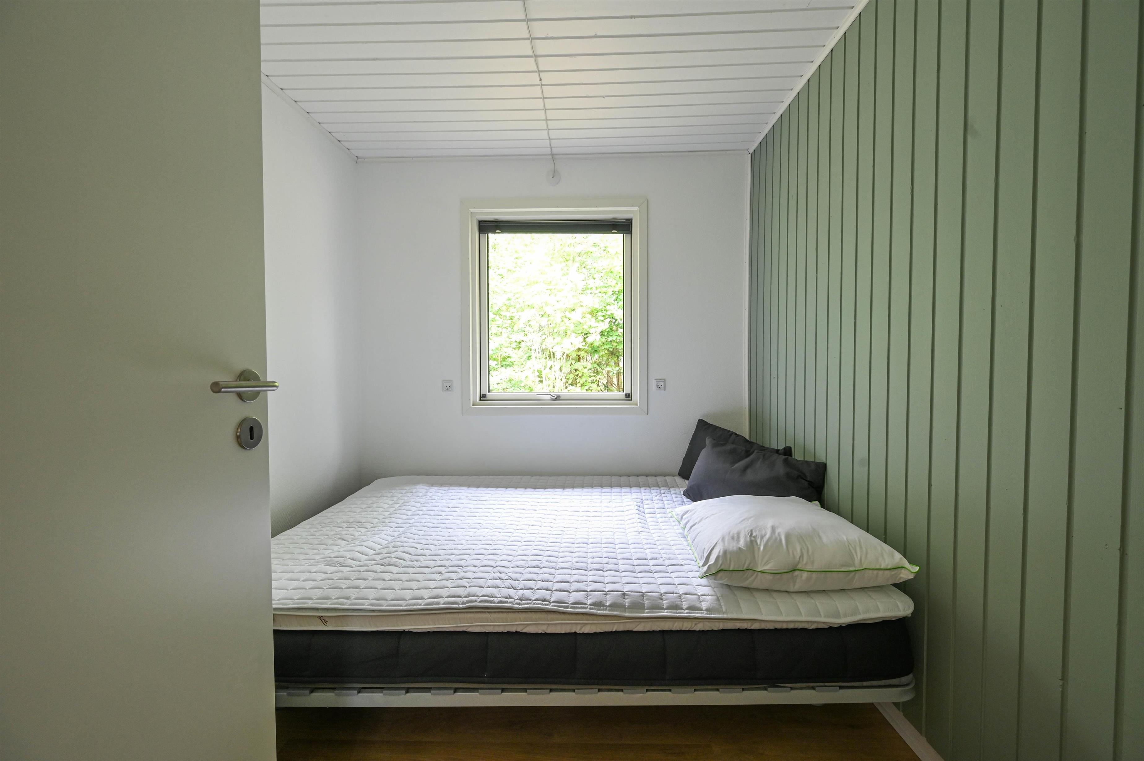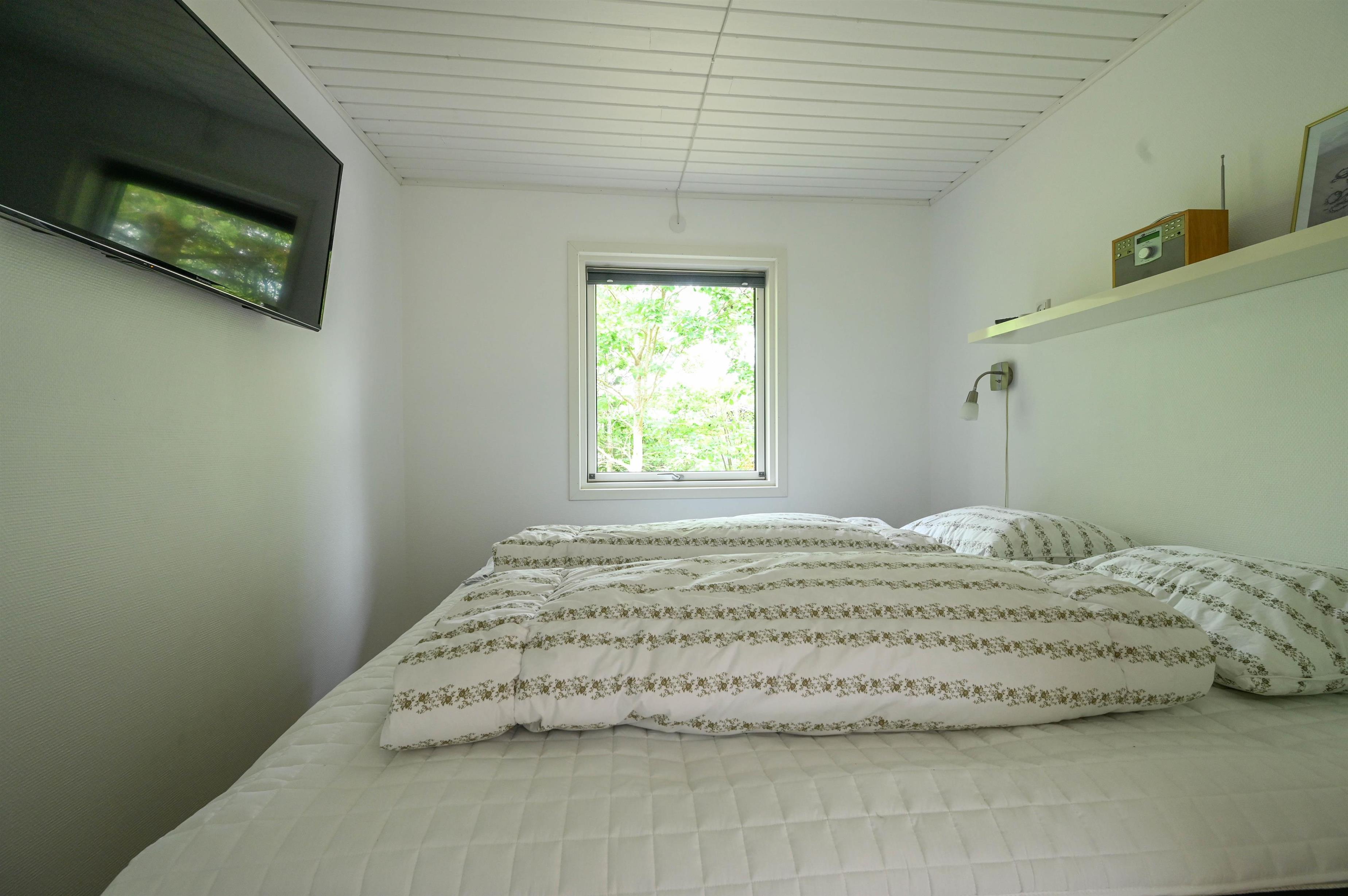 Feriehuset fremstår lyst, venligt og stilfuldt indrettet. Det flotte køkken ligger i åben forbindelse med stuen, hvor der både er spiseplads og sofahjørne – og herfra er der direkte udgang til den store terrasse. Brændeovnen i stuen skaber en hyggelig stemning, og de store vinduespartier giver et flot lysindfald og bringer naturen helt tæt på.