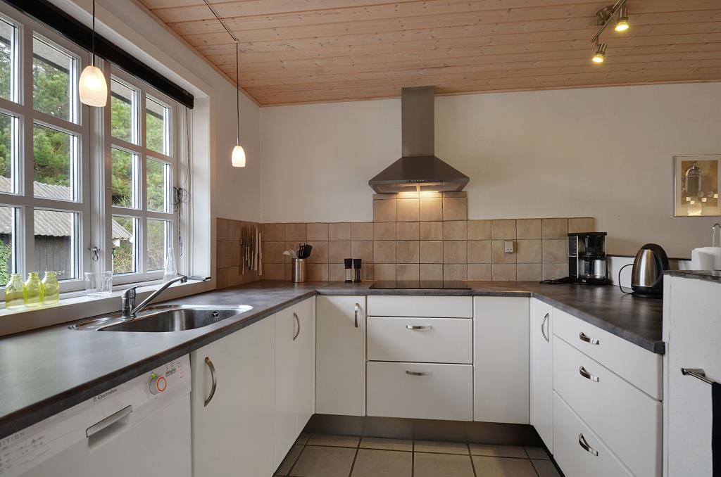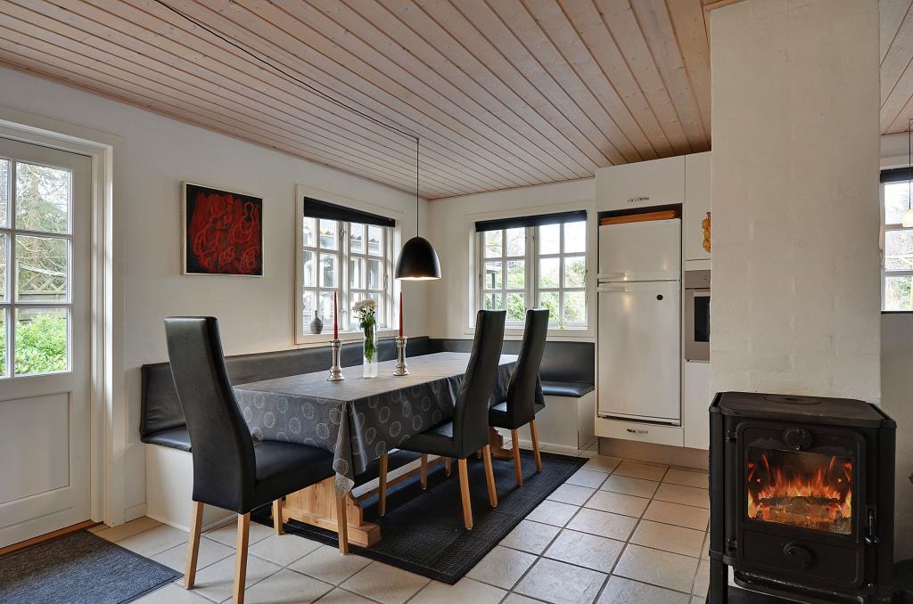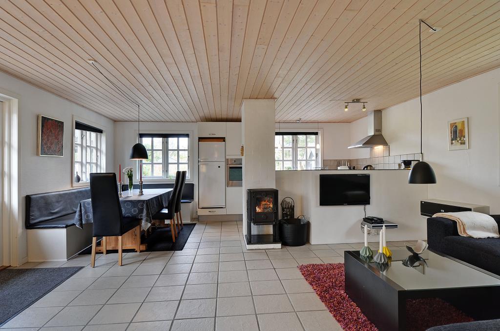 Det lyse køkken ligger i åben forbindelse med spiseplads og stue, hvor brændeovnen sørger for varme og stemning på kølige dage. Her er det let at samles om madlavning, spil og hyggelige aftener.