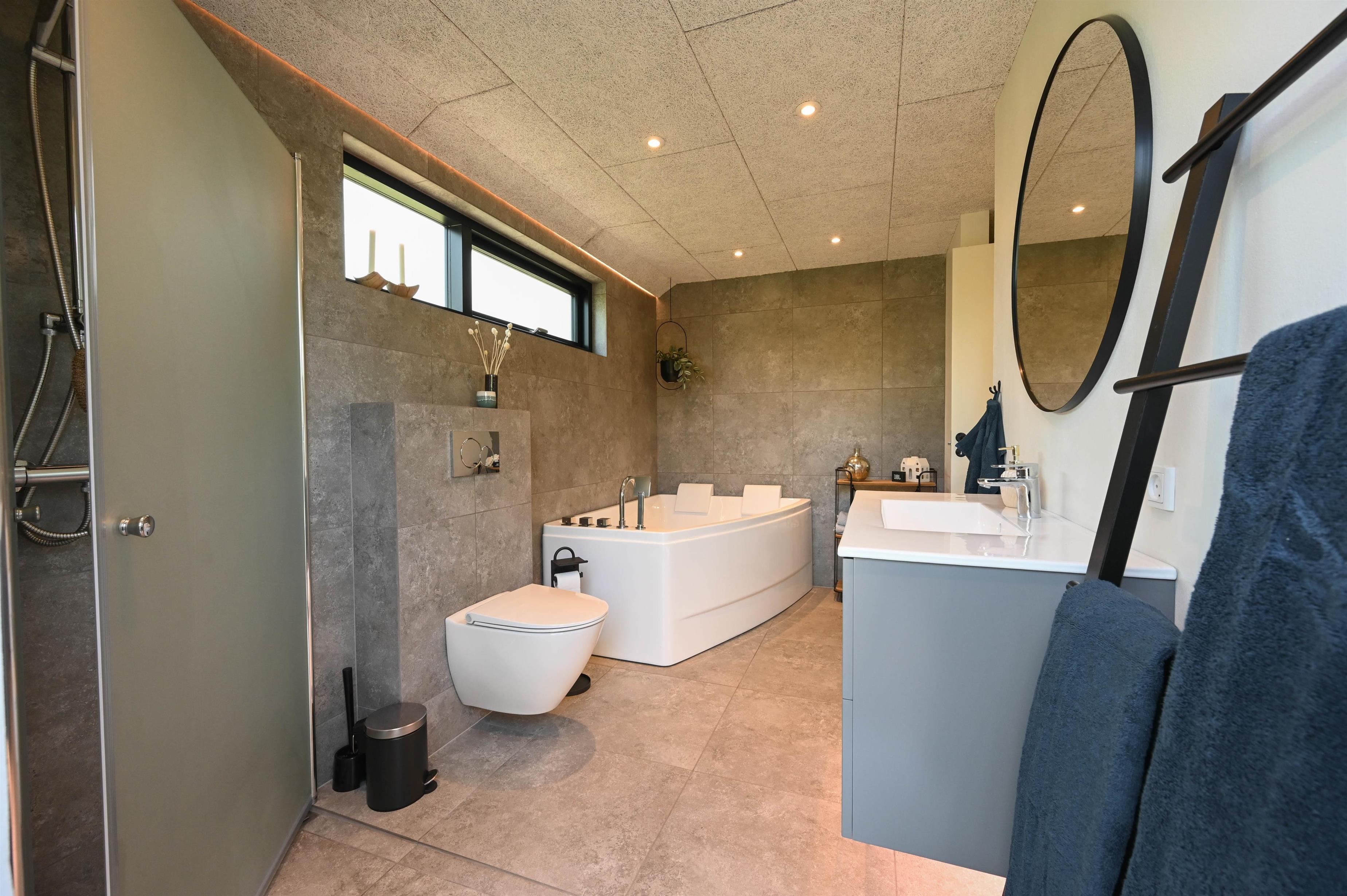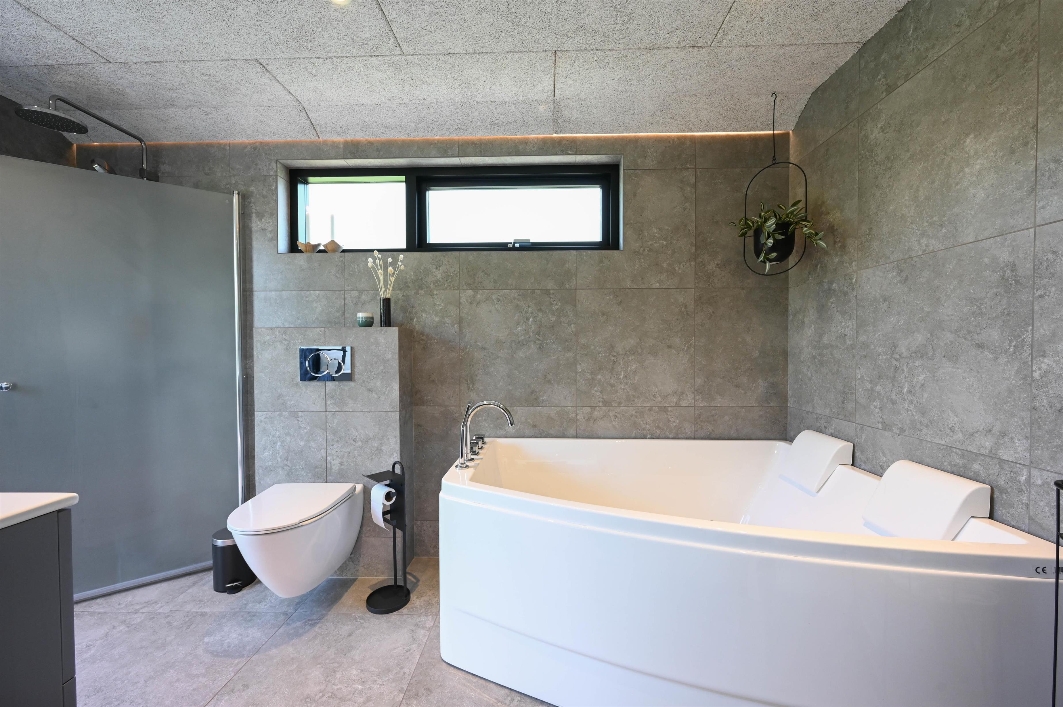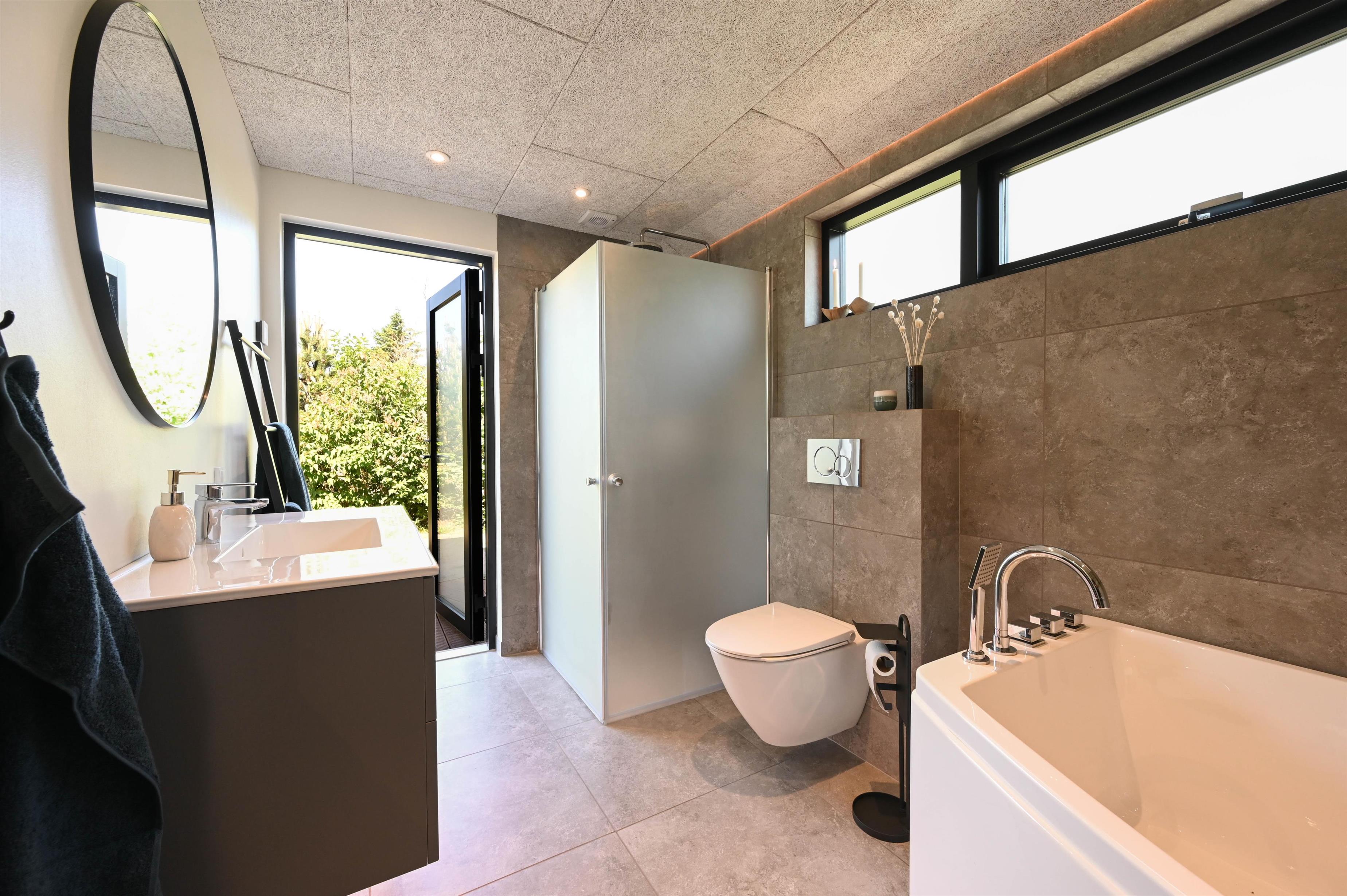 Det ene badeværelse med badekar og direkte udgang til terrasse