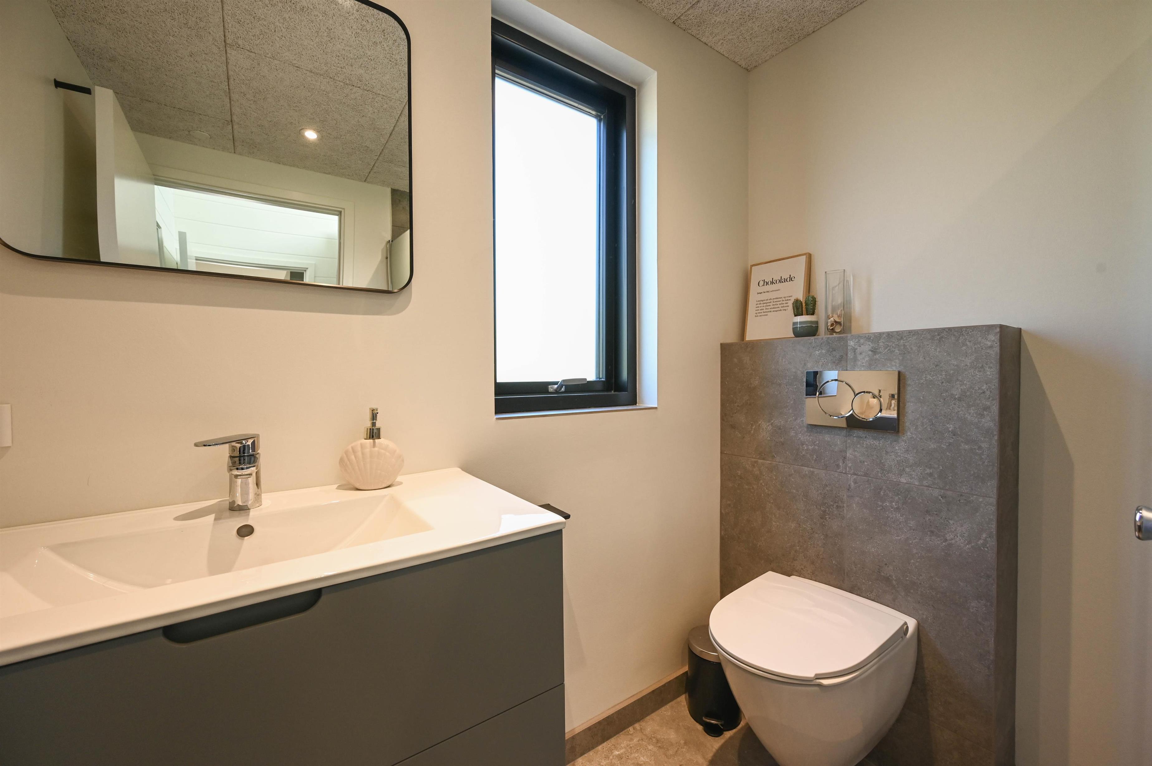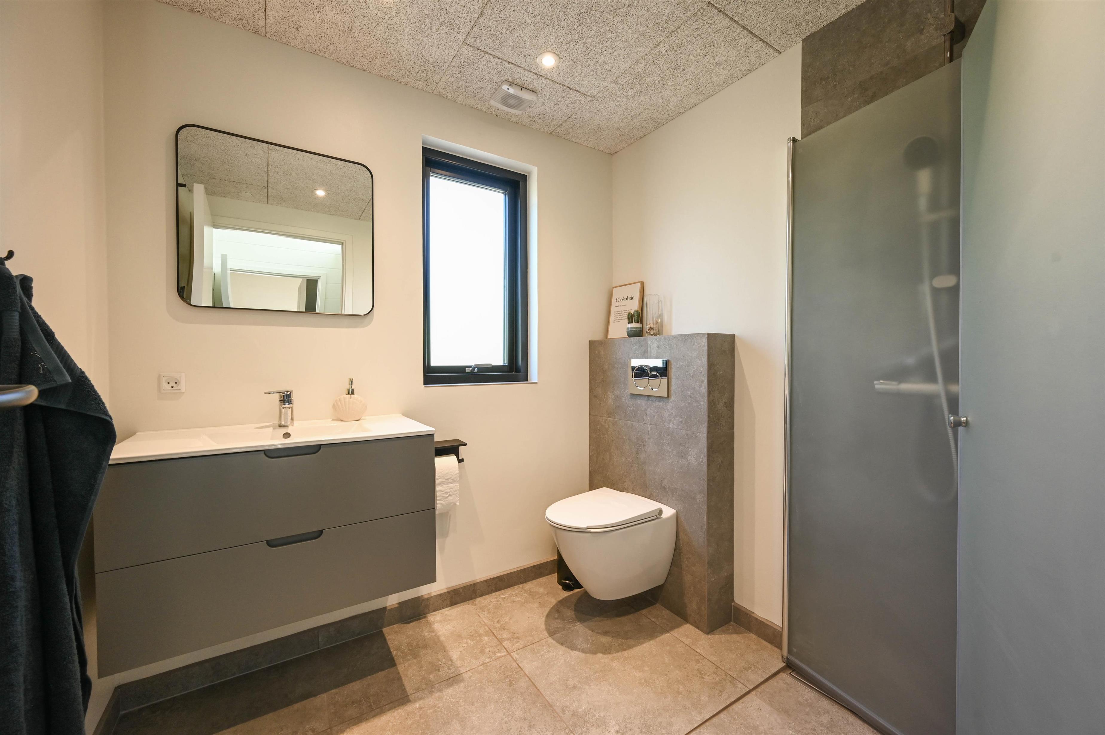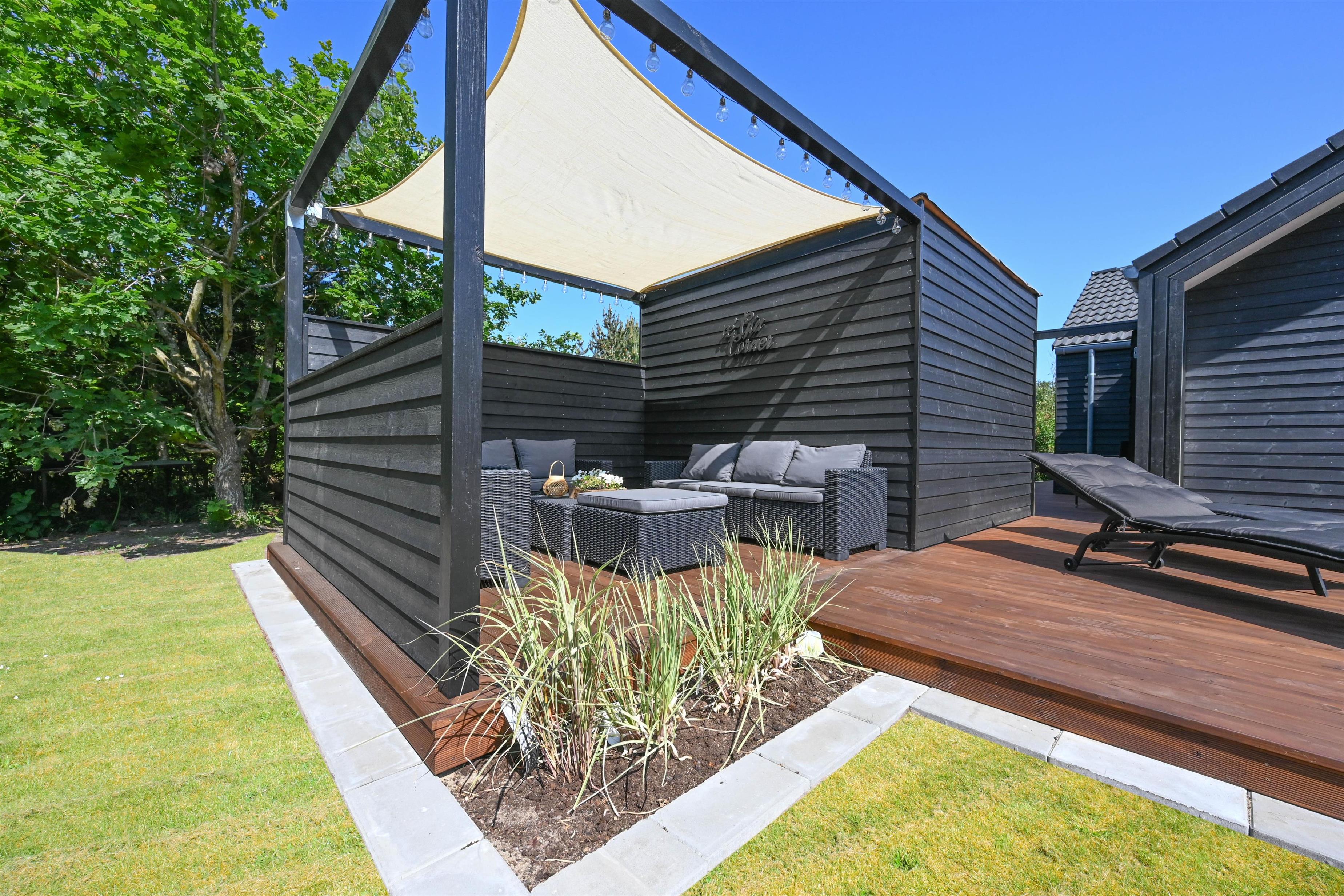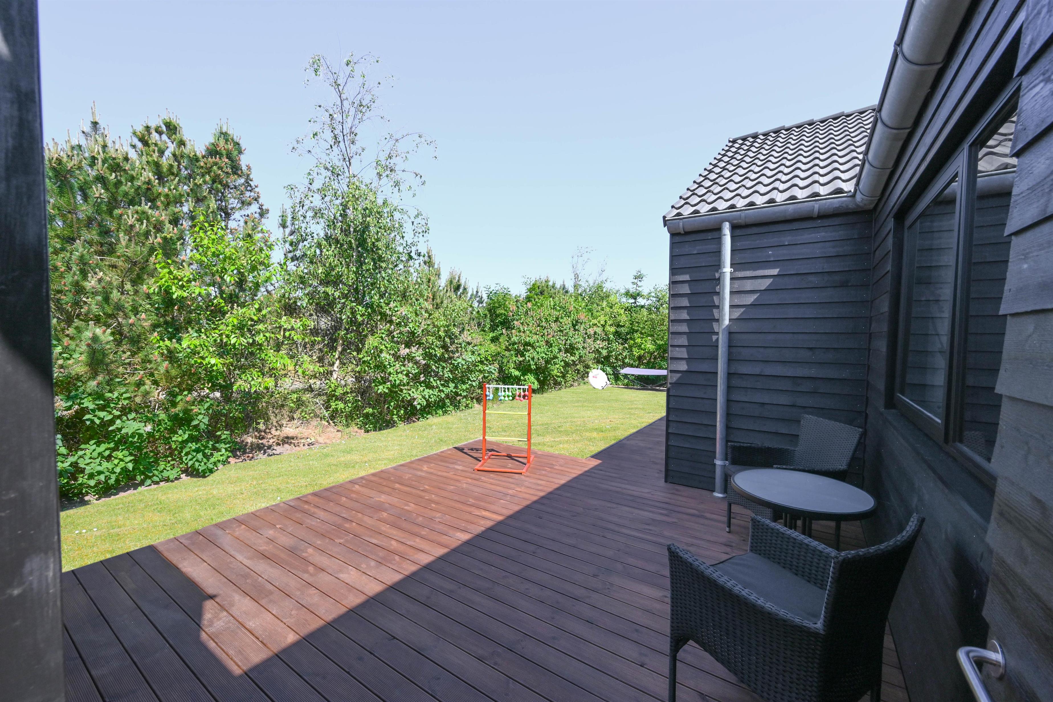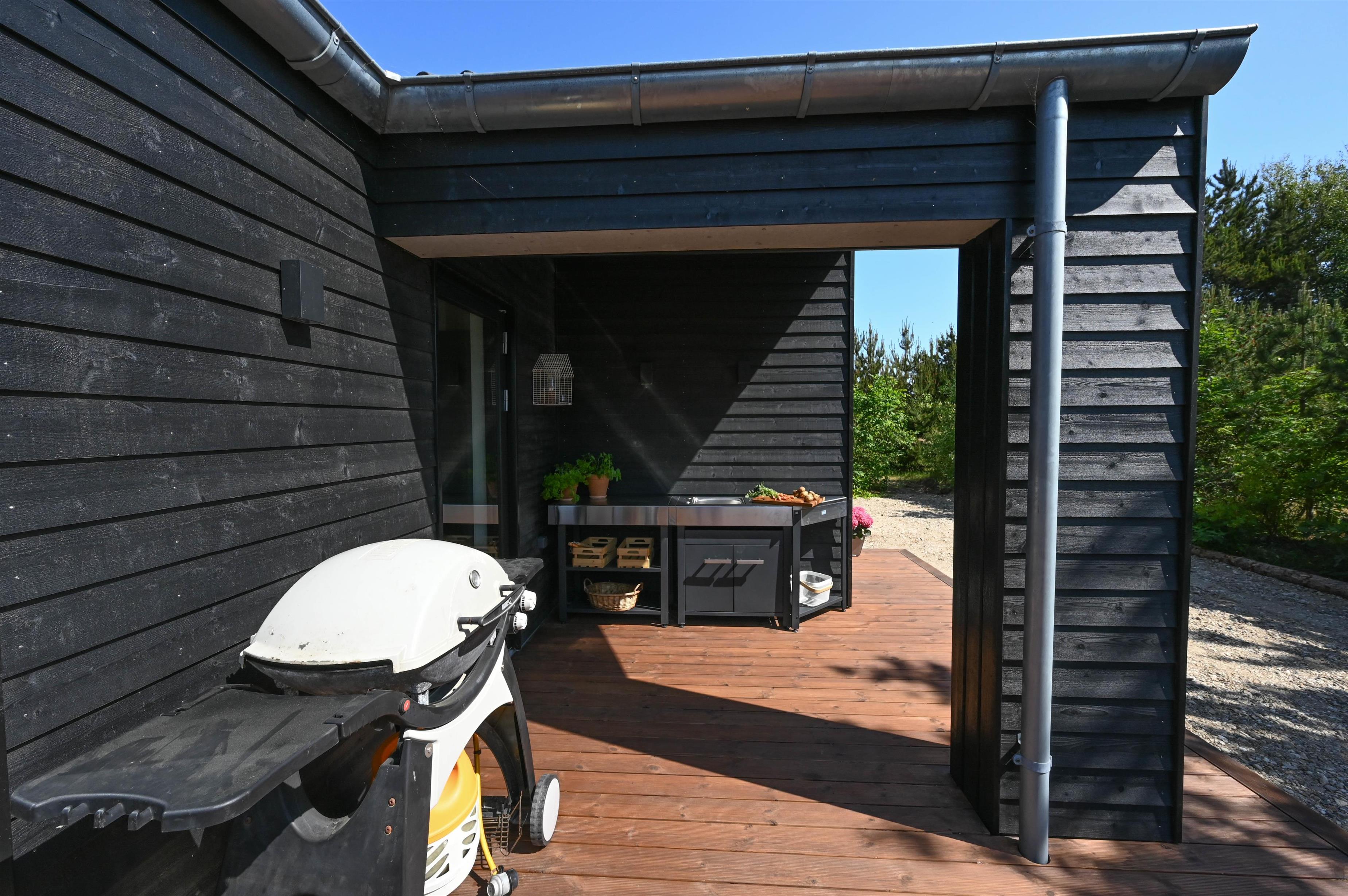 De flotte udearealer byder på flere terrasser – herunder et hyggeligt loungehjørne – samt en nedgravet trampolin, hvor børnene kan slå sig løs. Der er også mulighed for at tilberede aftensmaden udendørs og nyde de lange sommeraftener i fredelige omgivelser.