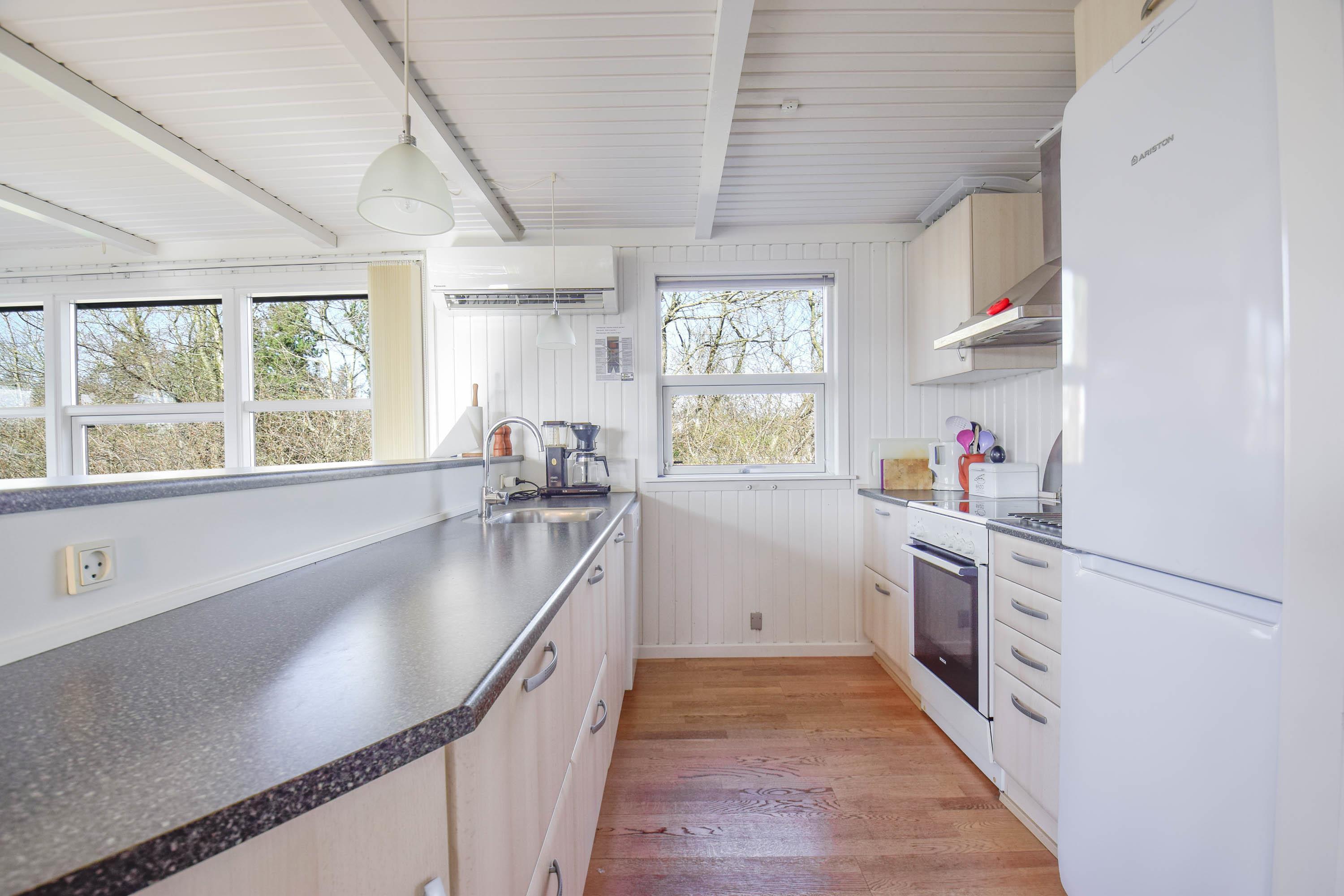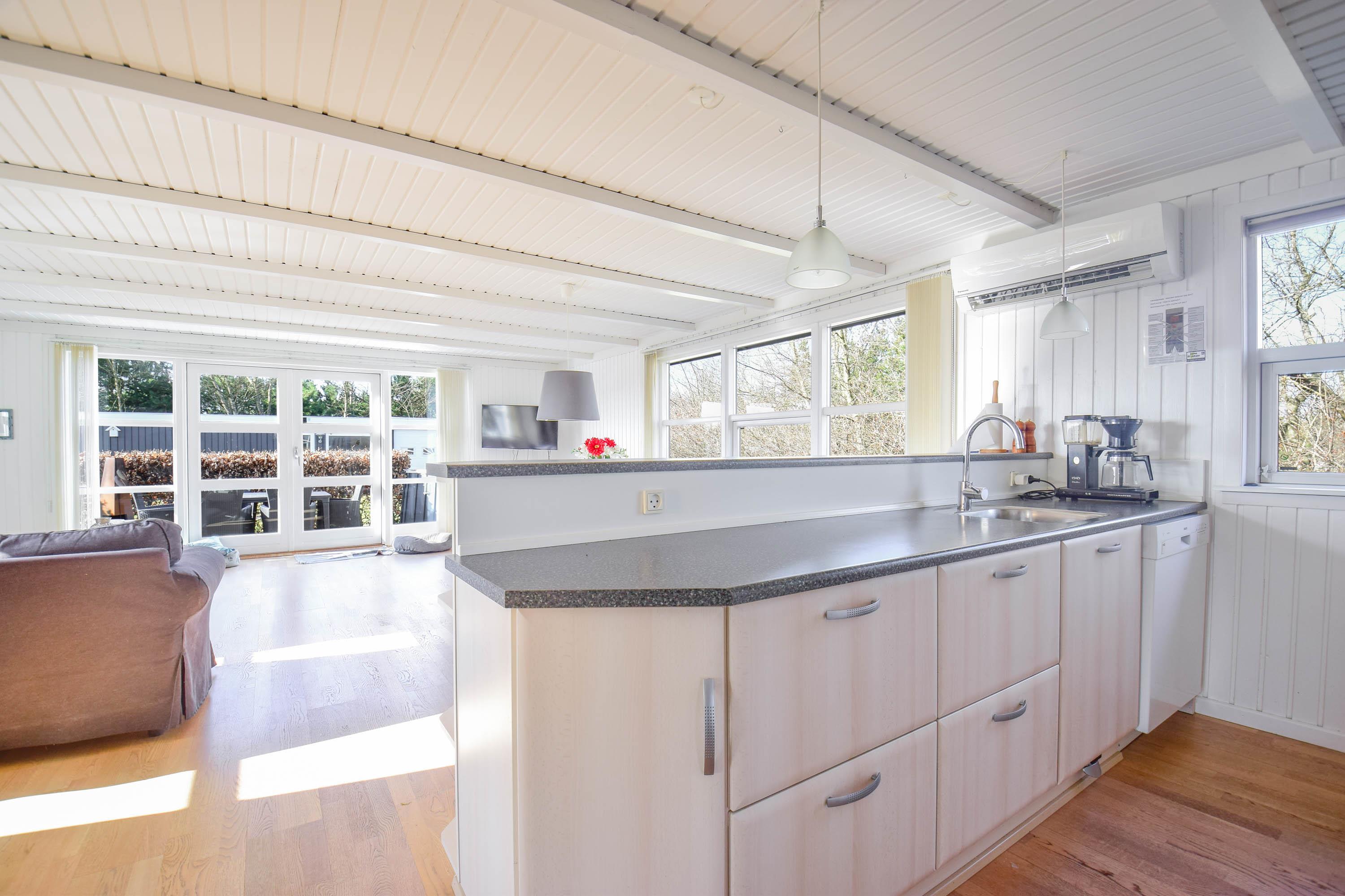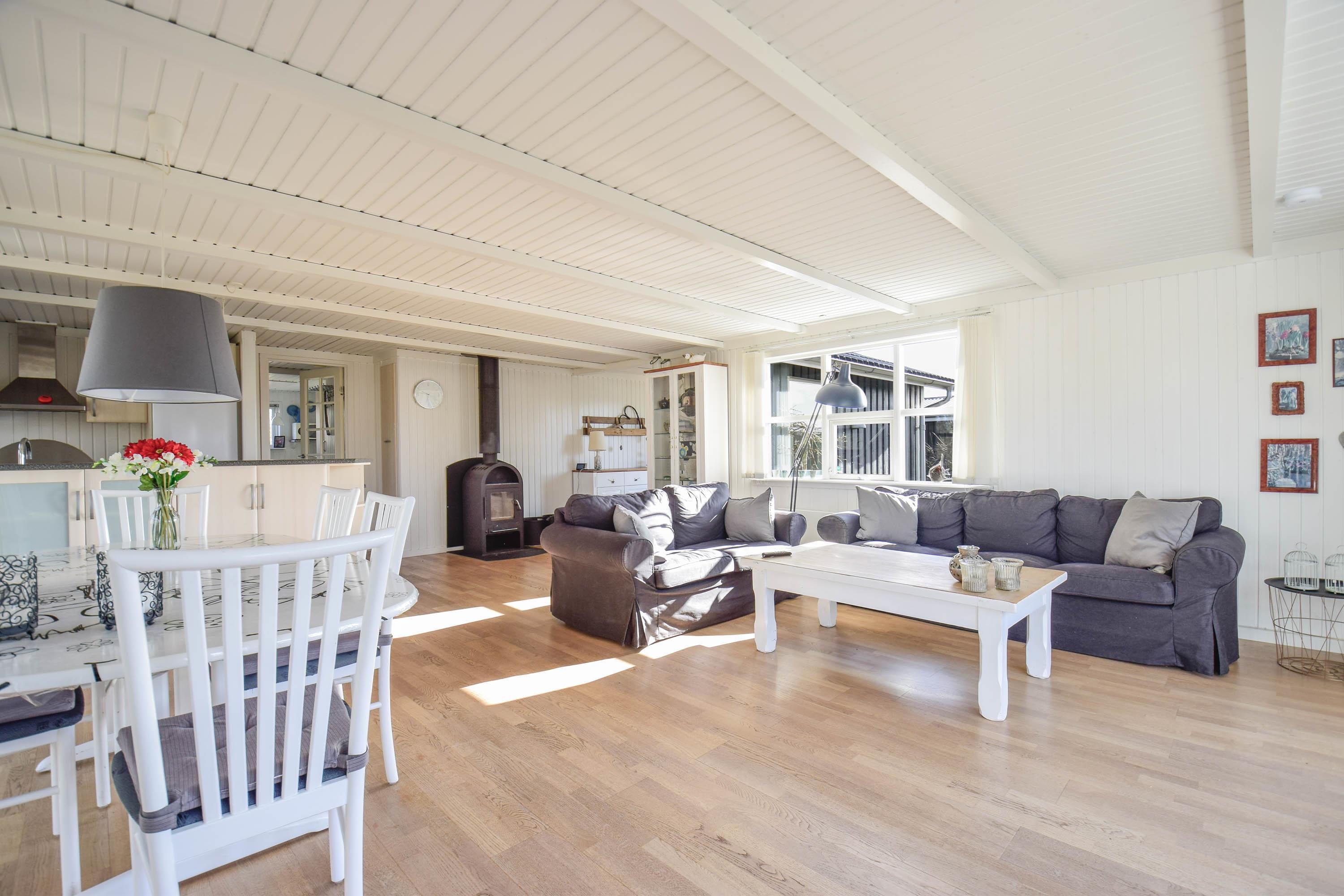 Feriehuset byder på en god planløsning og en behagelig atmosfære. Det store køkken/alrum fungerer som husets hjerte, hvor familien kan samles omkring madlavning, brætspil eller hyggelige aftener foran brændeovnen. Herfra er der direkte udgang til den sydvendte terrasse, hvor solen kan nydes dagen igennem.