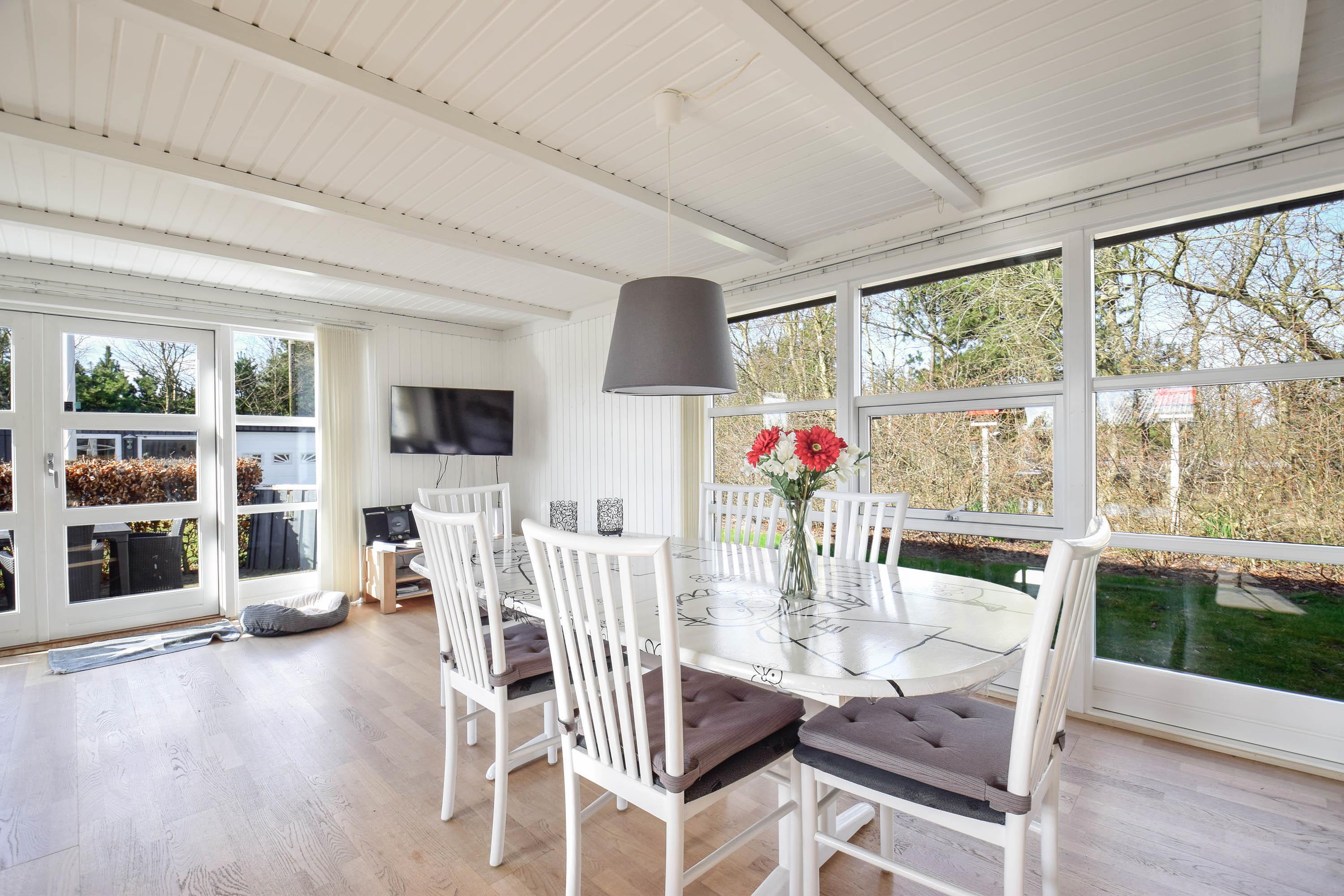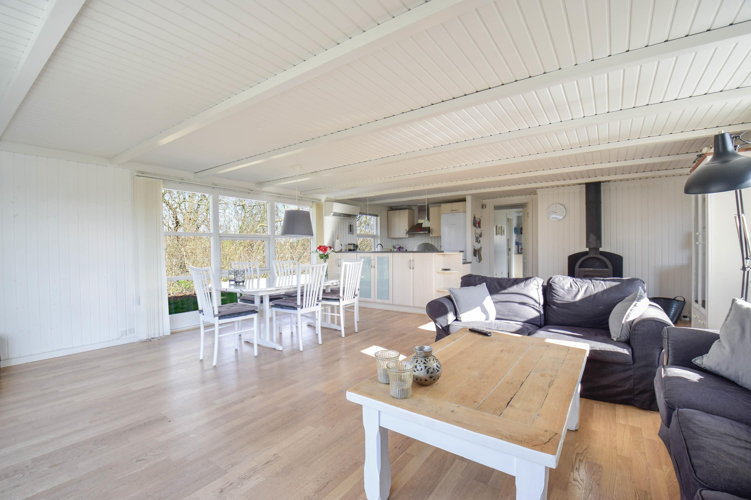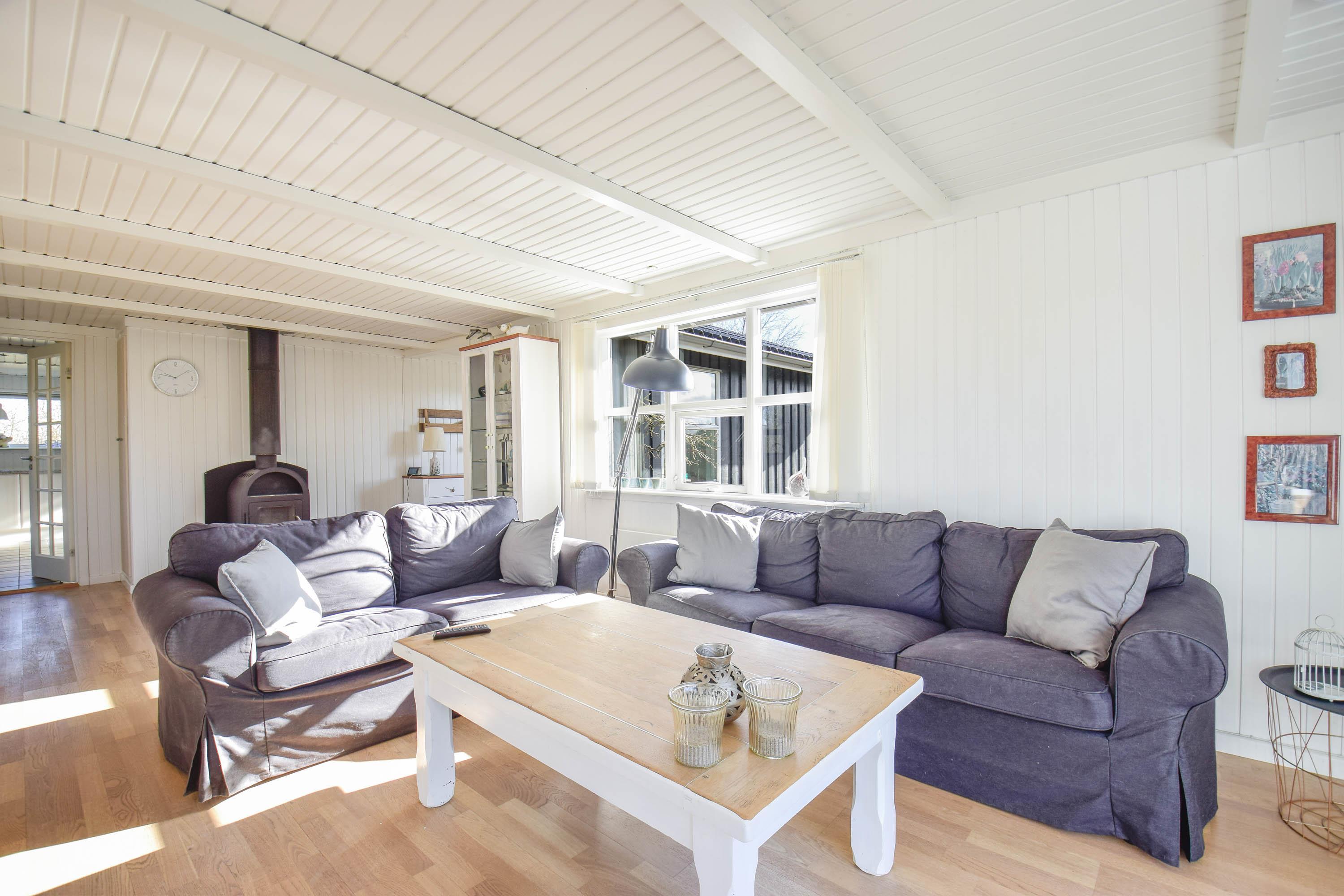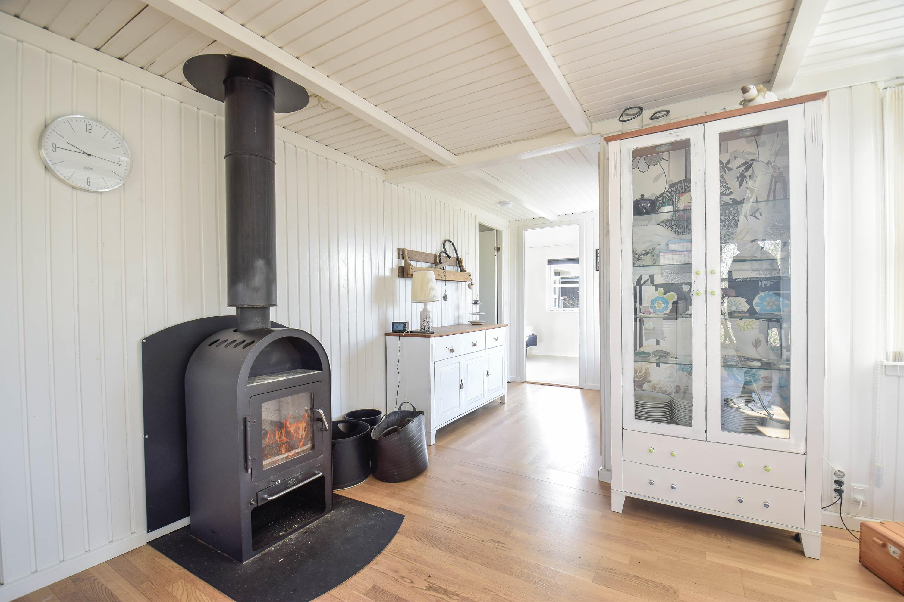 Huset er hyggeligt indrettet med bekvemme møbler og fine detaljer, og de store vinduespartier skaber et lyst og indbydende opholdsrum med udsigt til haven. Her er rammerne perfekte til både afslapning og samvær – uanset årstid.