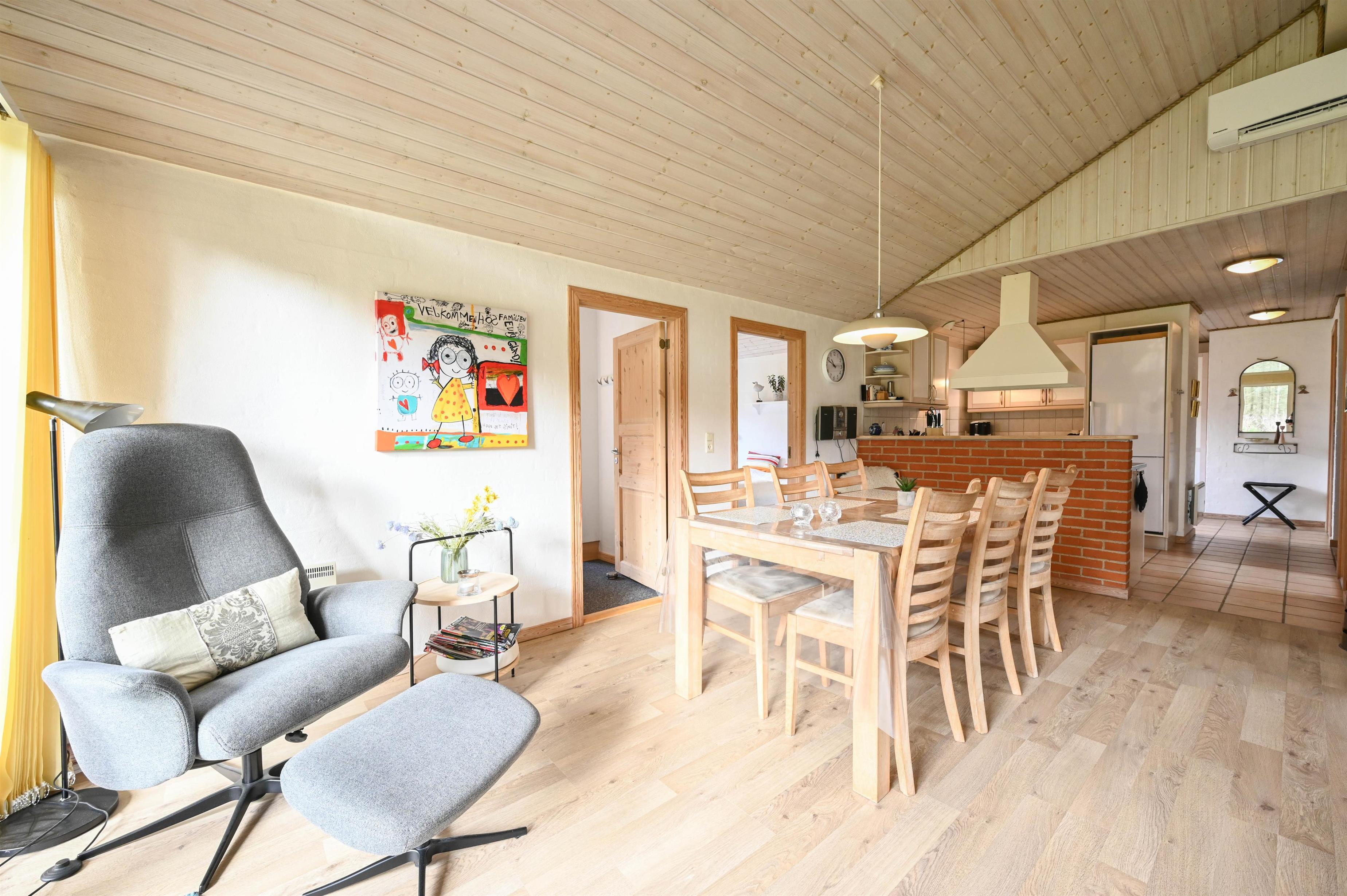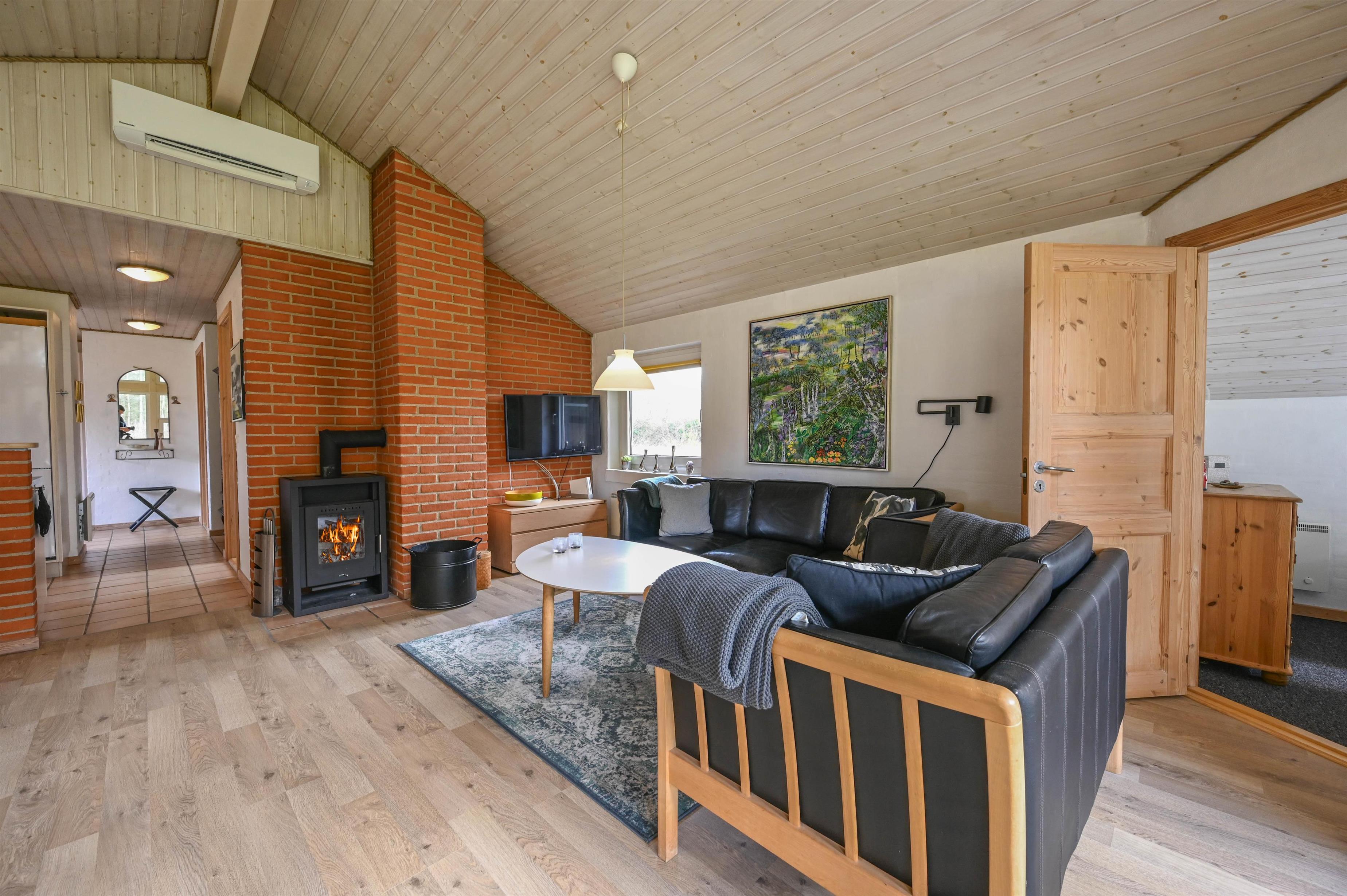 Feriehuset er indrettet med fokus på hygge, komfort og familievenlig stemning. Den lyse stue har gode lædermøbler, brændeovn og varmepumpe, så du altid kan skabe en behagelig temperatur – sommer som vinter.