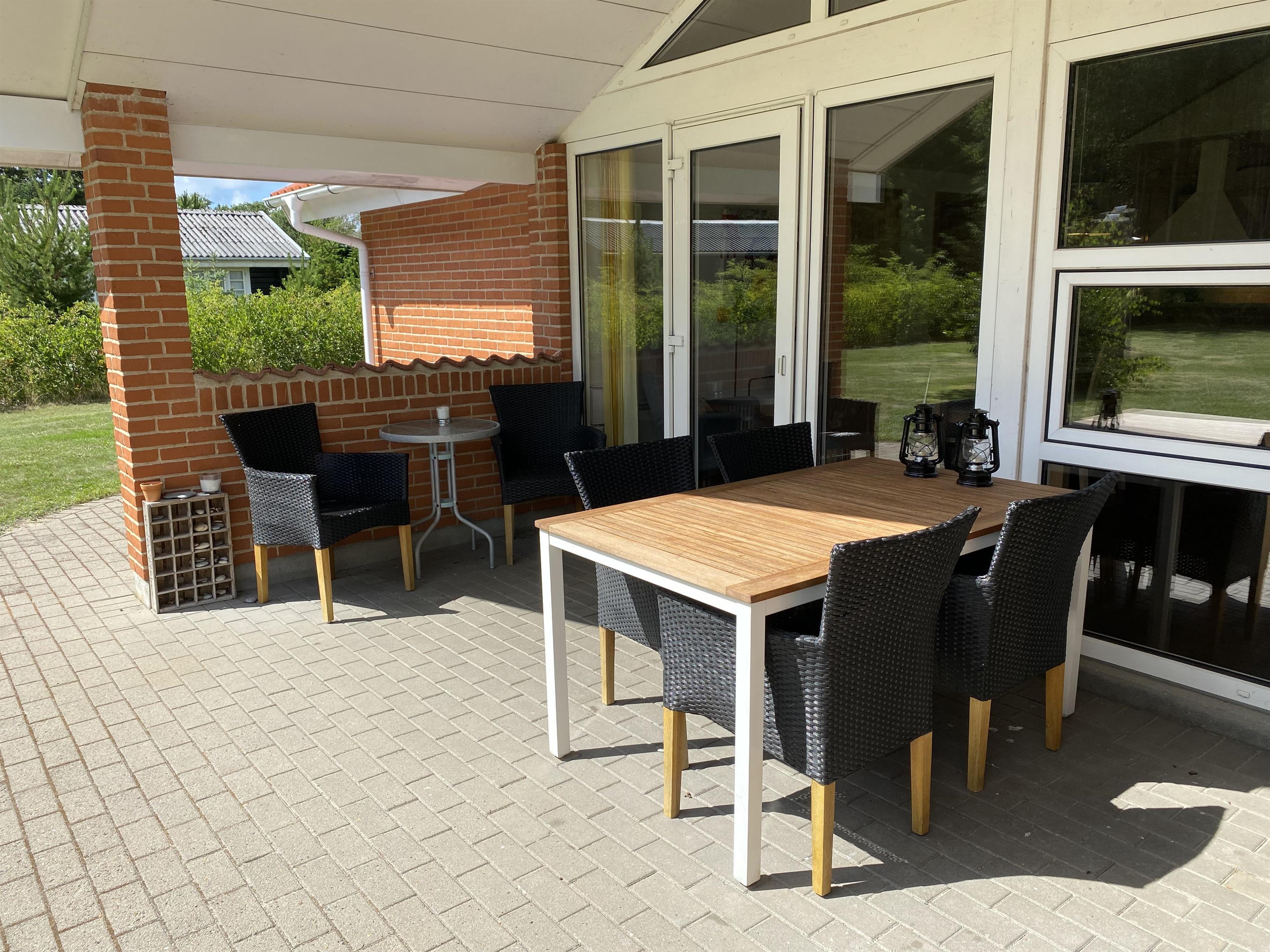 Den overdækkede terrasse gør det let at nyde udelivet, uanset vejret, og den store grund giver plads til både leg og afslapning.