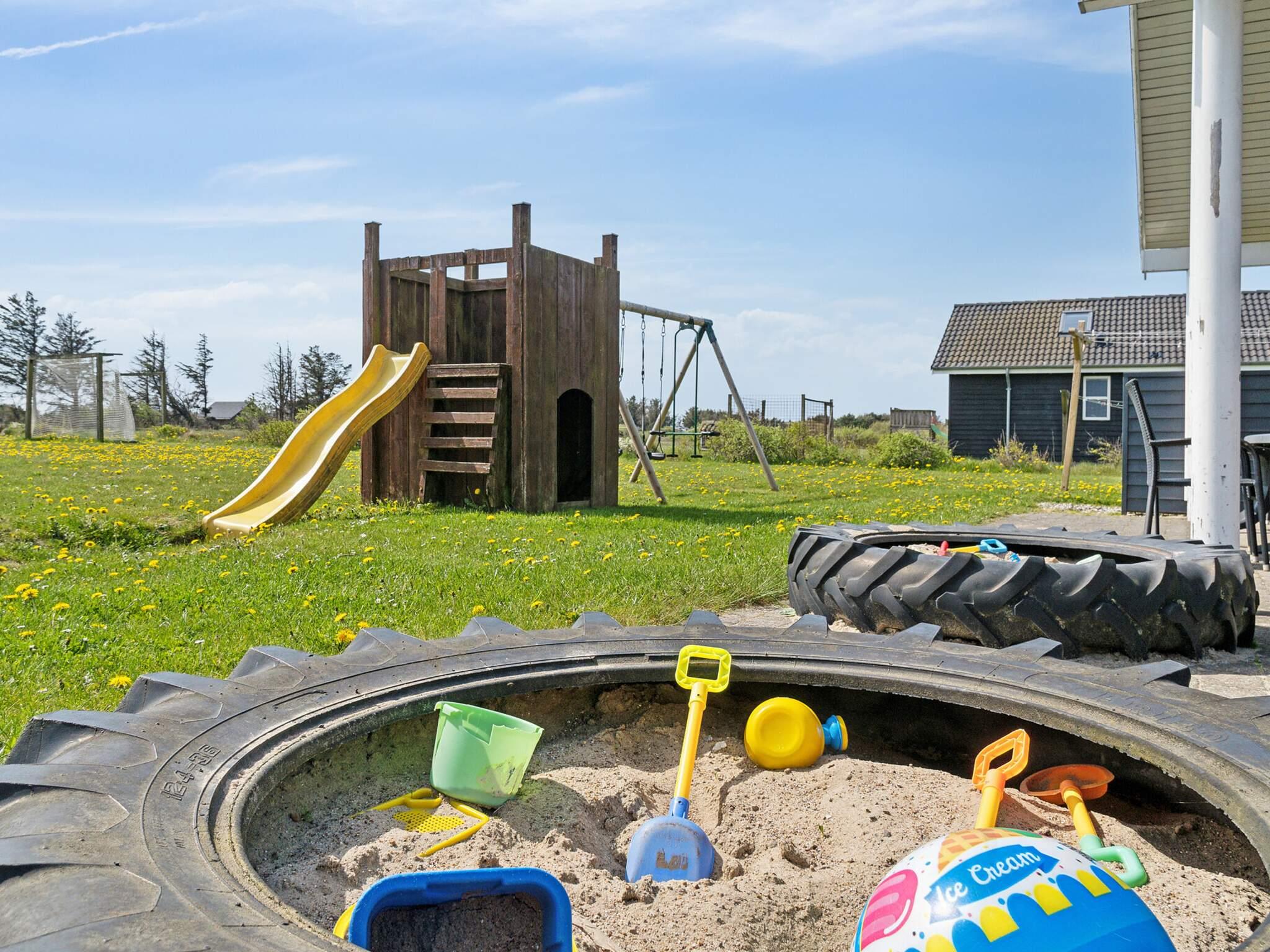 Lige ved siden af husets terrasse er der et legetårn med gynger, klatrevæg, rutschebane to små sandkasser, basketnet samt fodboldbane med to fodboldmål.