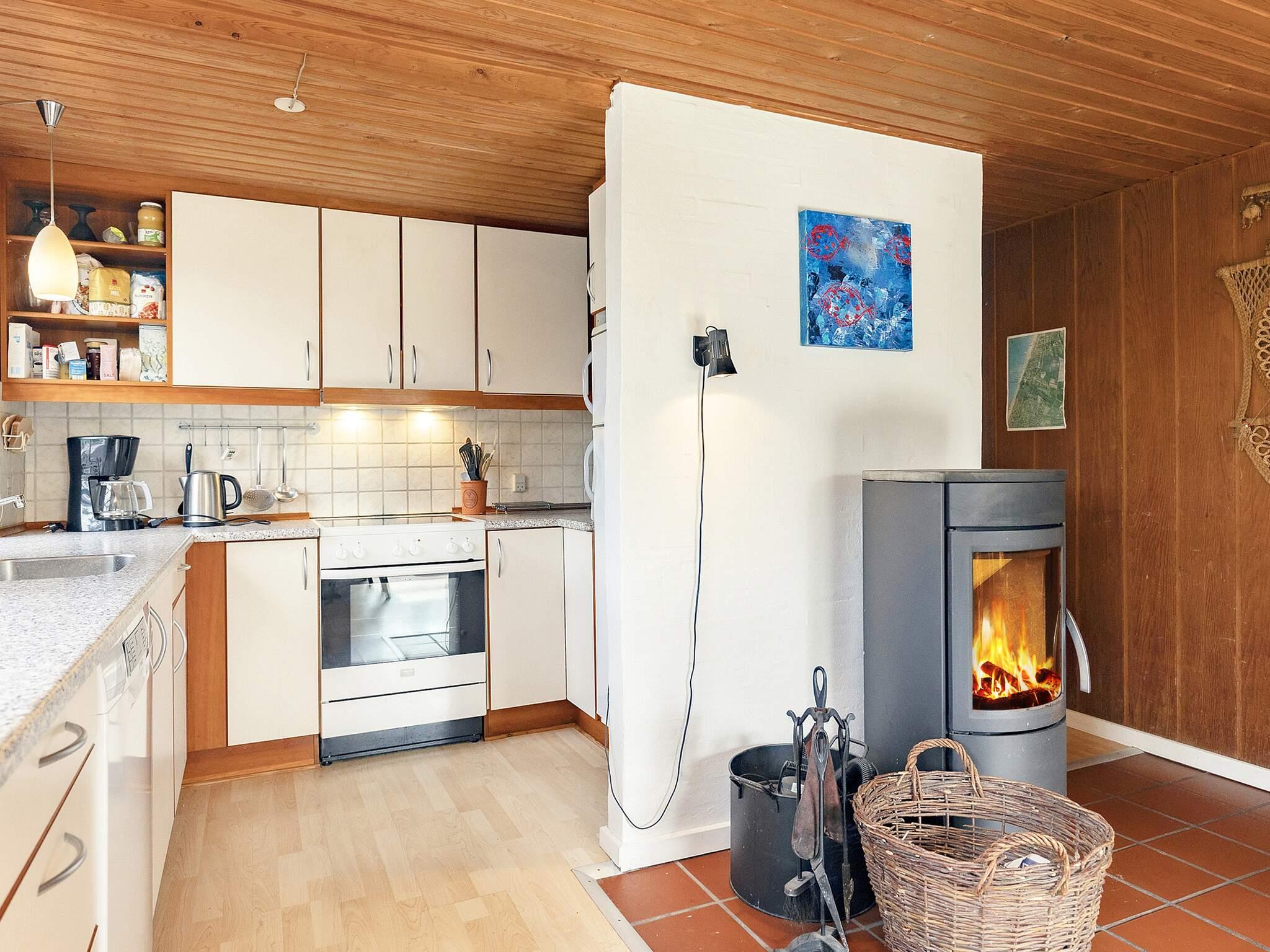 Indenfor byder huset på et indbydende køkken og spiseplads, hvor alle kan samles og nyde tiden sammen. Naturlig træbeklædning i hele boligen tilføjer varme og karakter, mens stuen med sin hyggelige brændeovn og rolige neutrale indretning skaber en afslappende, hjemlig atmosfære.