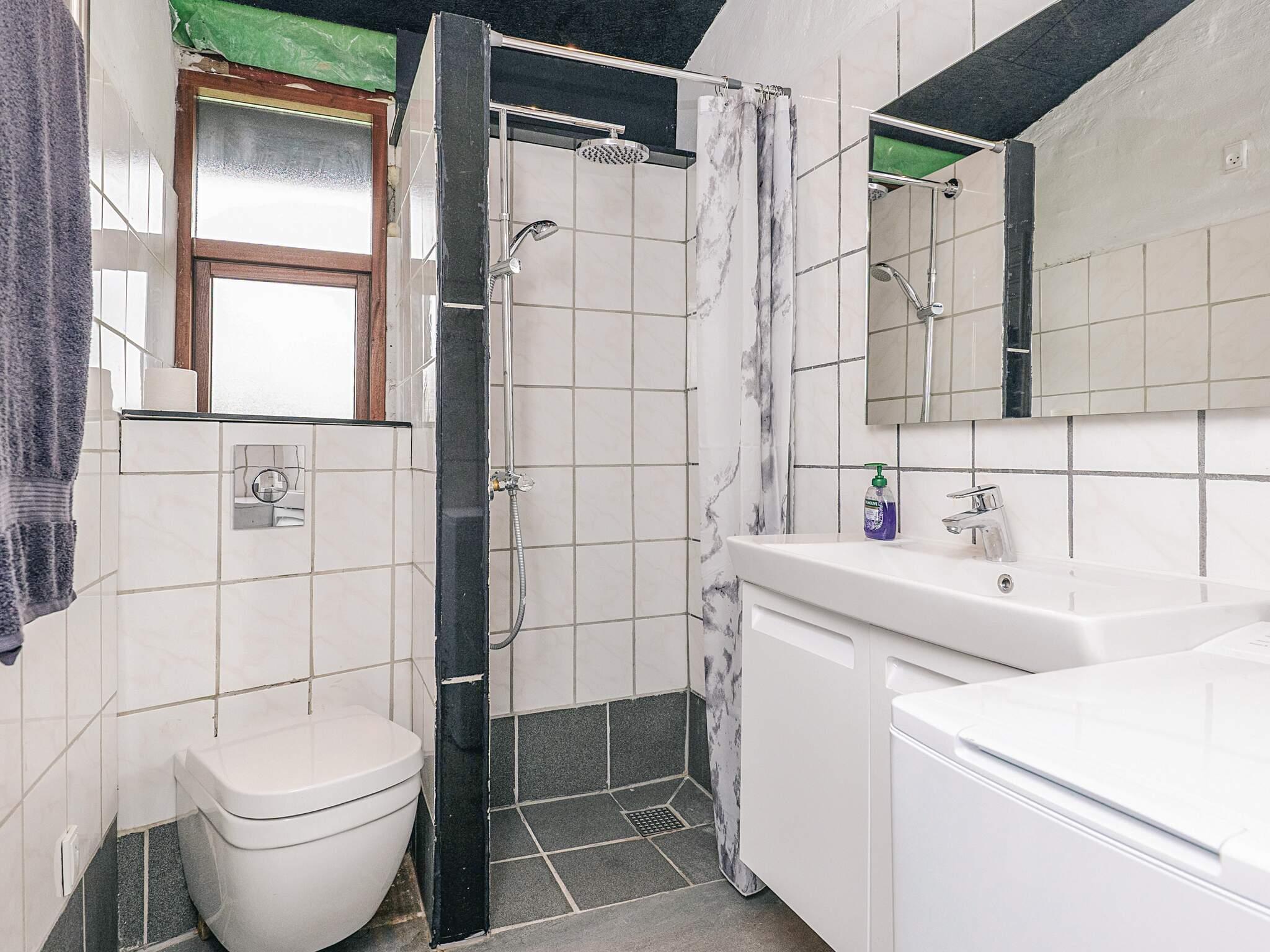 Badeværelse har udover toilet, håndvask og bruser både vaskemaskine og gulvvarme.