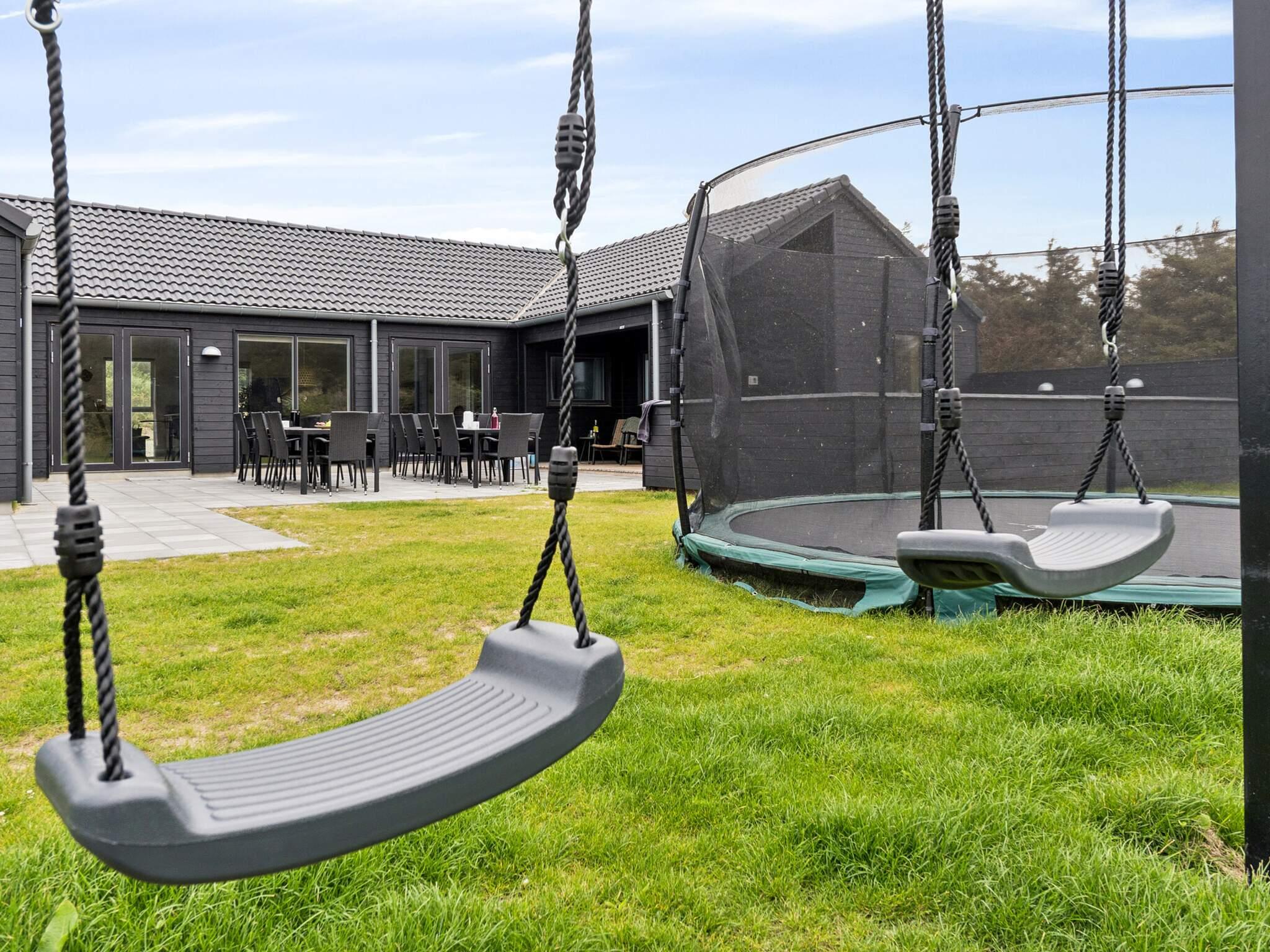 Når du bevæger dig udenfor, åbner der sig endnu flere muligheder for at skabe fantastiske minder sammen. Den delvist overdækkede flotte træterrasse er udstyret med havemøbler og grill, perfekt til hyggelige grillmiddage. På den store terrasse finder du også den udendørs wellnessafdeling med en trappeopbygget udespa, udesauna og udebruser – her kan du virkelig forkæle dig selv under åben himmel. For turens yngste gæster finder du udendørs også trampolin og gynger.