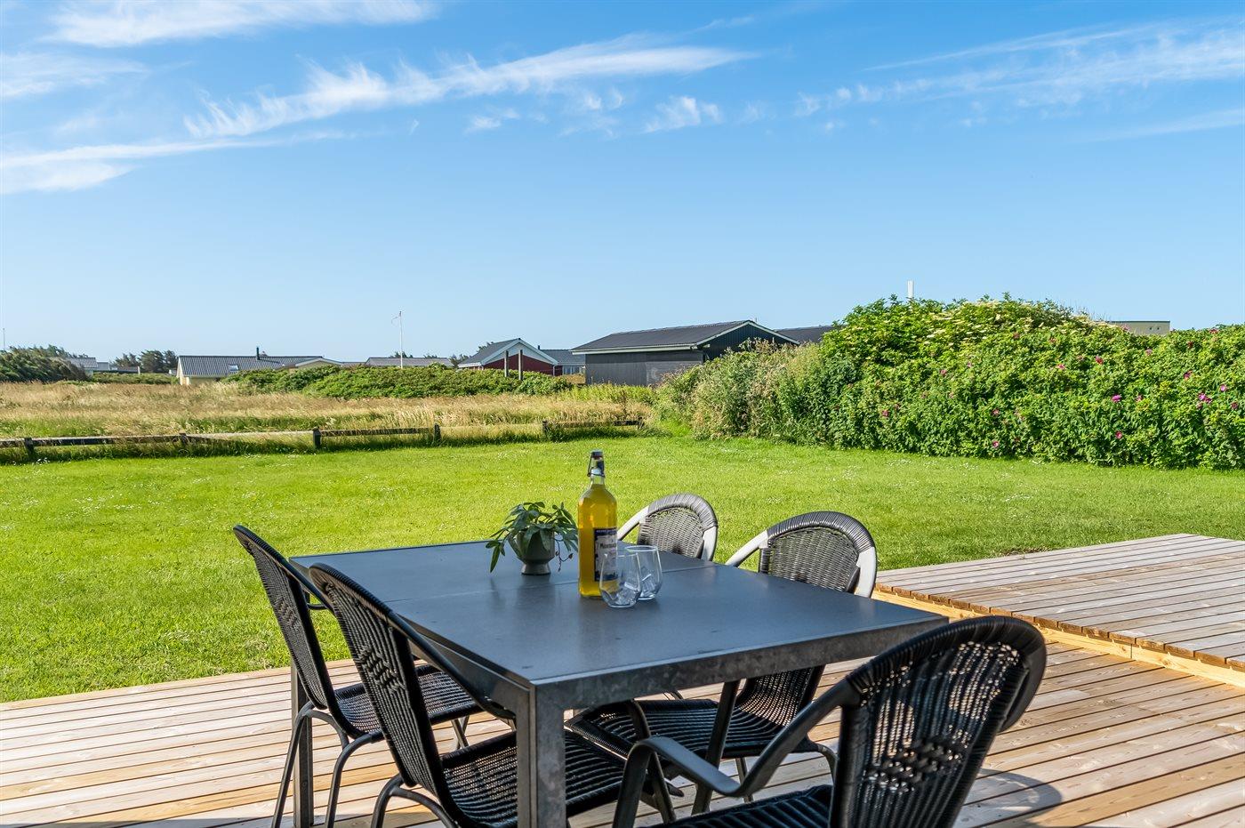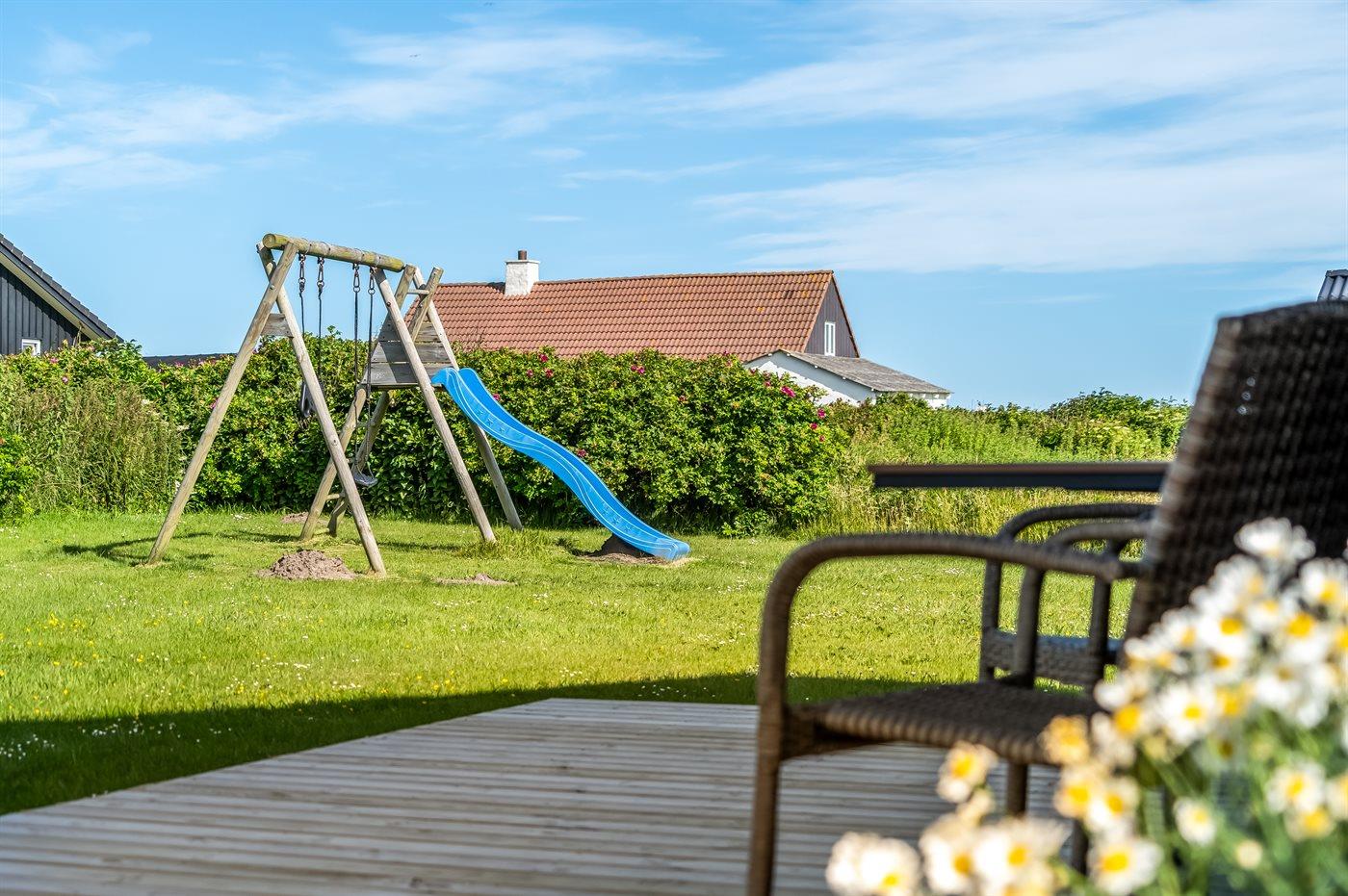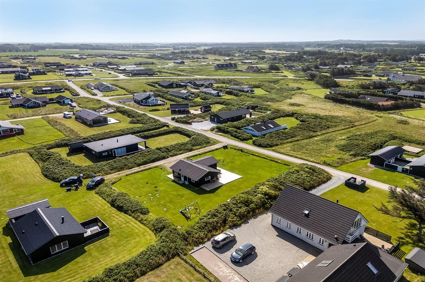 Ferieboligen er beliggende på en 1266 m² stor havegrund. Der er 130 m til havet. Nærmeste forretning er beliggende i en afstand af 4000 m. Til ferieboligen hører åbent terrasseareal. Desuden er der overdækket terrasse. Gynge. Rutchebane. Udendørs bruser. Grill til rådighed. Der er installeret stik til opladning af elbil. Type 2 stik. Med 6 kW ladeeffekt. Parkering ved ferieboligen.