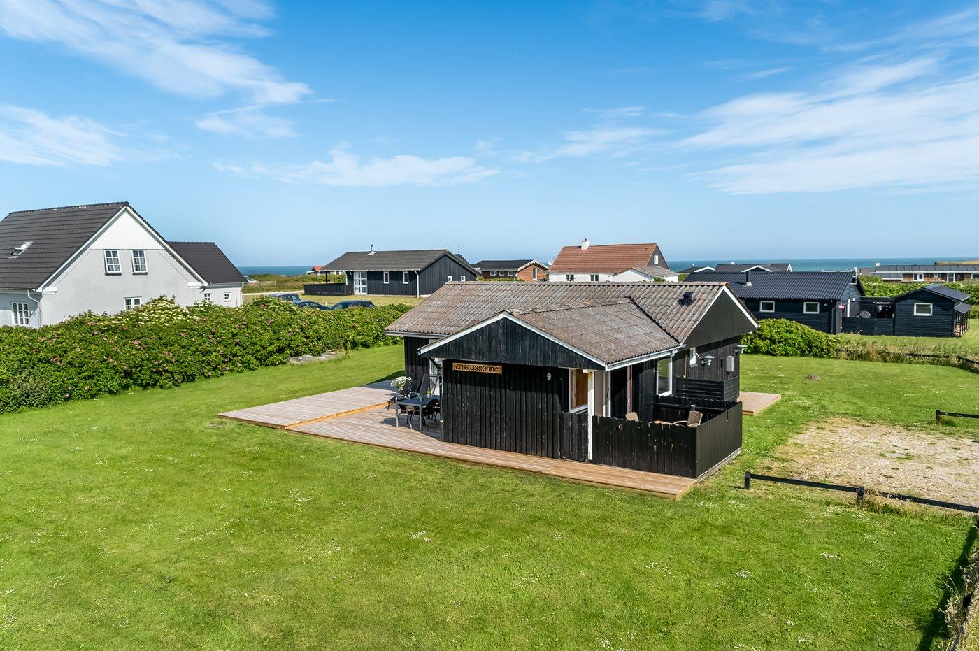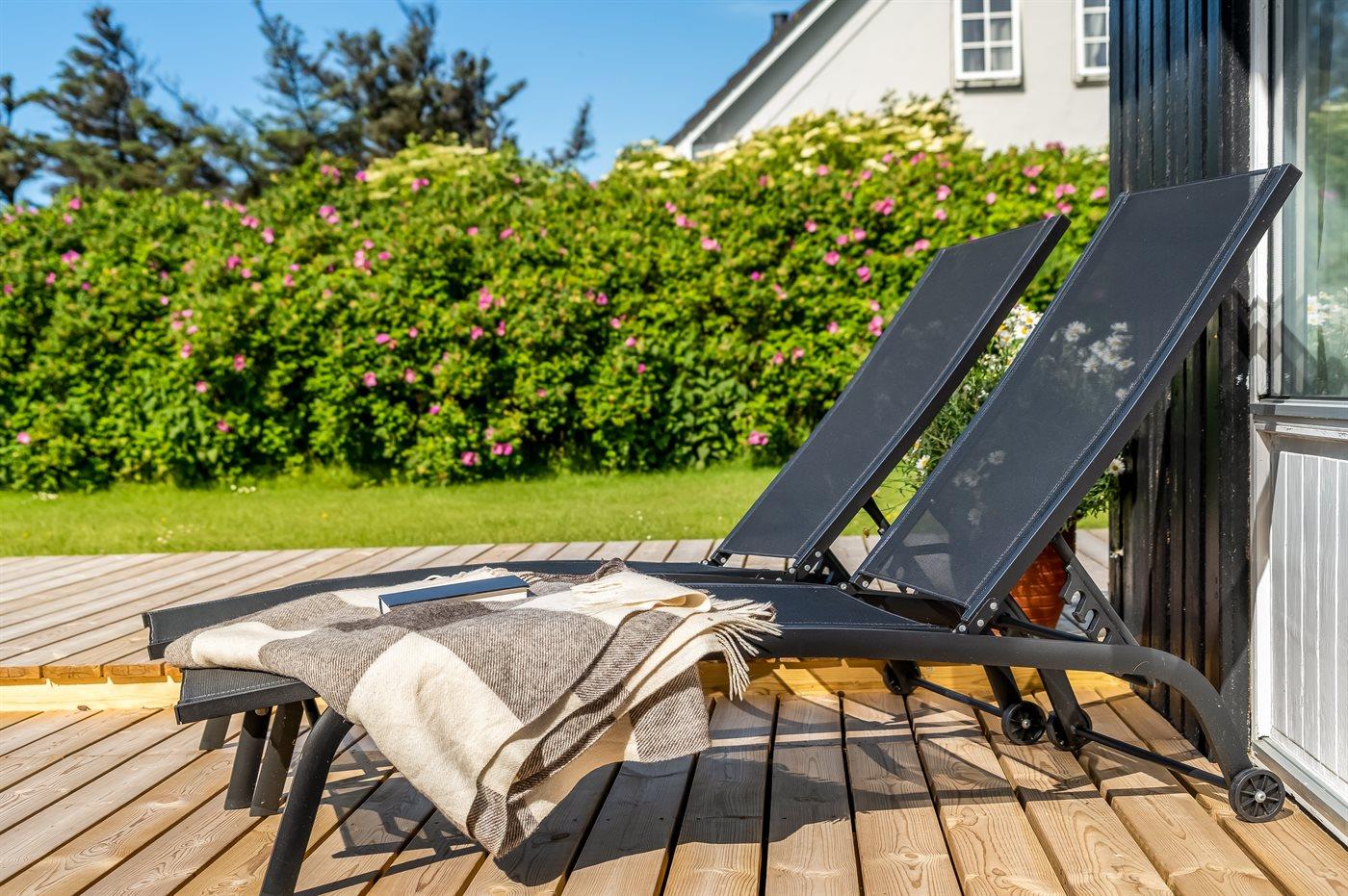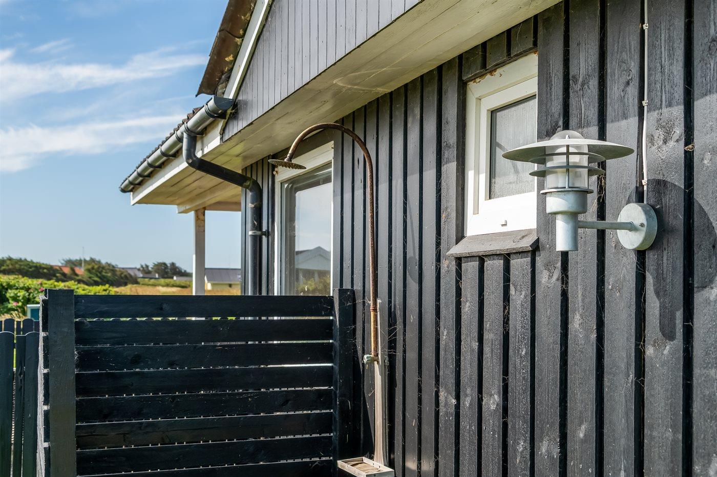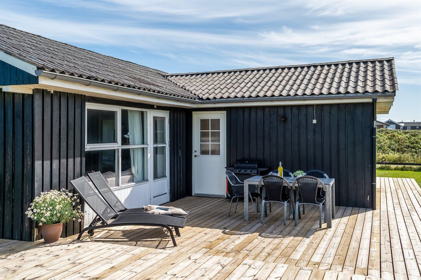 Ferieboligen er beliggende på en 1266 m² stor havegrund. Der er 130 m til havet. Nærmeste forretning er beliggende i en afstand af 4000 m. Til ferieboligen hører åbent terrasseareal. Desuden er der overdækket terrasse. Gynge. Rutchebane. Udendørs bruser. Grill til rådighed. Der er installeret stik til opladning af elbil. Type 2 stik. Med 6 kW ladeeffekt. Parkering ved ferieboligen.