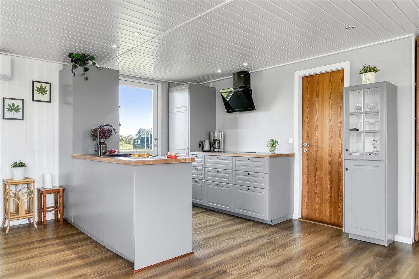 Køkkenet er udstyret med 1 køleskab. Der er 4 induktionskogeplader, varmluftovn, mikrobølgeovn samt opvaskemaskine.