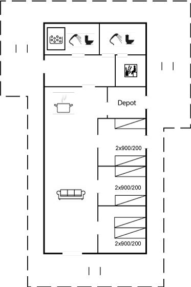 Køkkenet er udstyret med 1 køleskab. Der er 4 induktionskogeplader, varmluftovn, mikrobølgeovn samt opvaskemaskine.