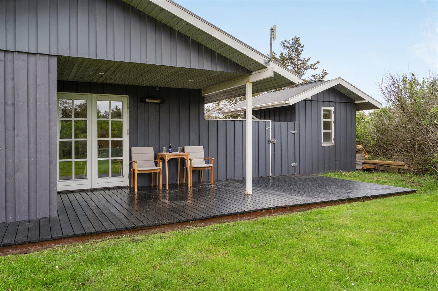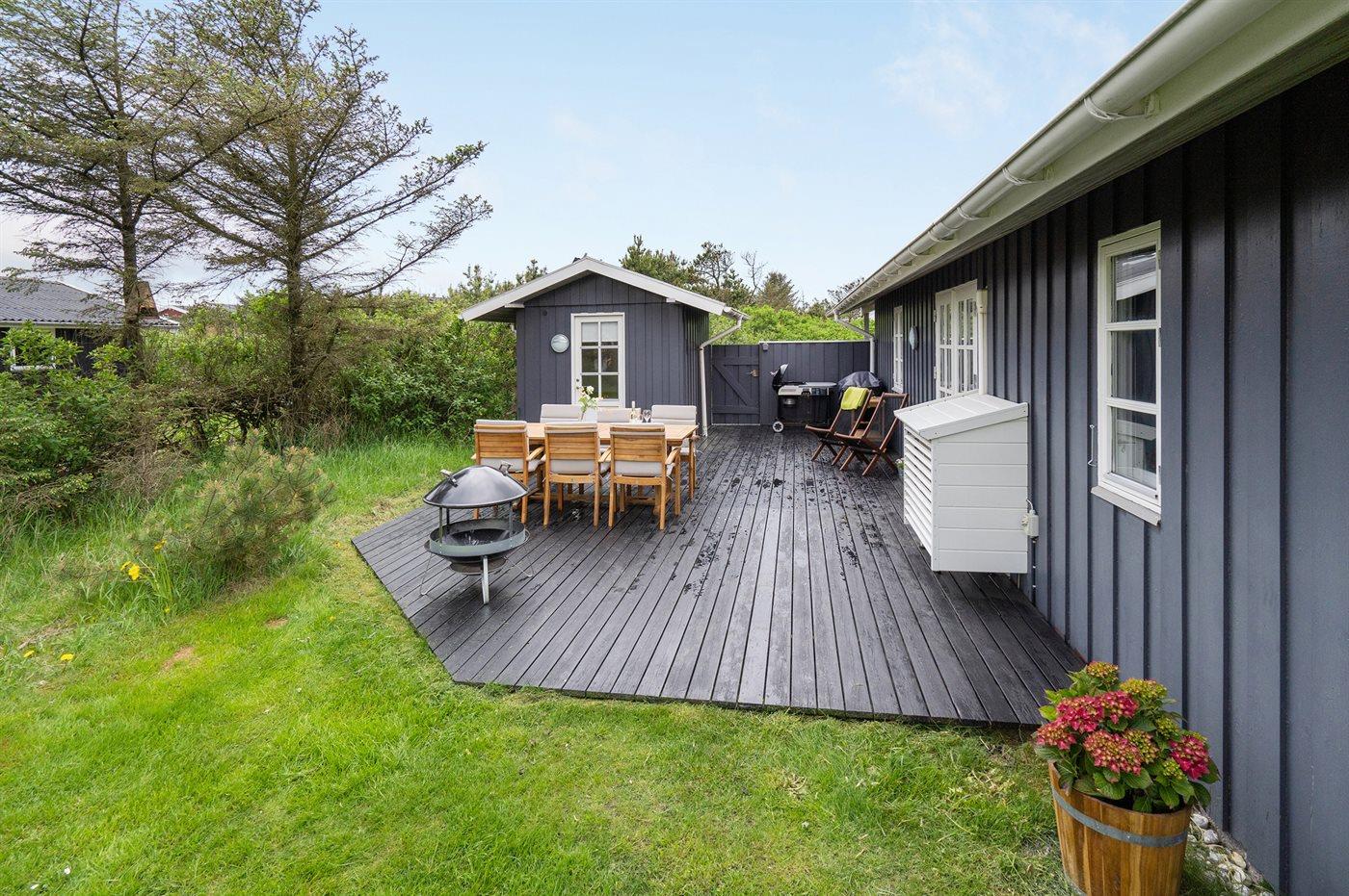 Ferieboligen er beliggende på en 1500 m² stor naturgrund. Der er 300 m til havet. Nærmeste forretning er beliggende i en afstand af 6000 m. Til ferieboligen hører 65 m² terrasseareal. Desuden er der 12 m² overdækket terrasse. Der er redskabsrum. Shelter. Parkering ved ferieboligen.