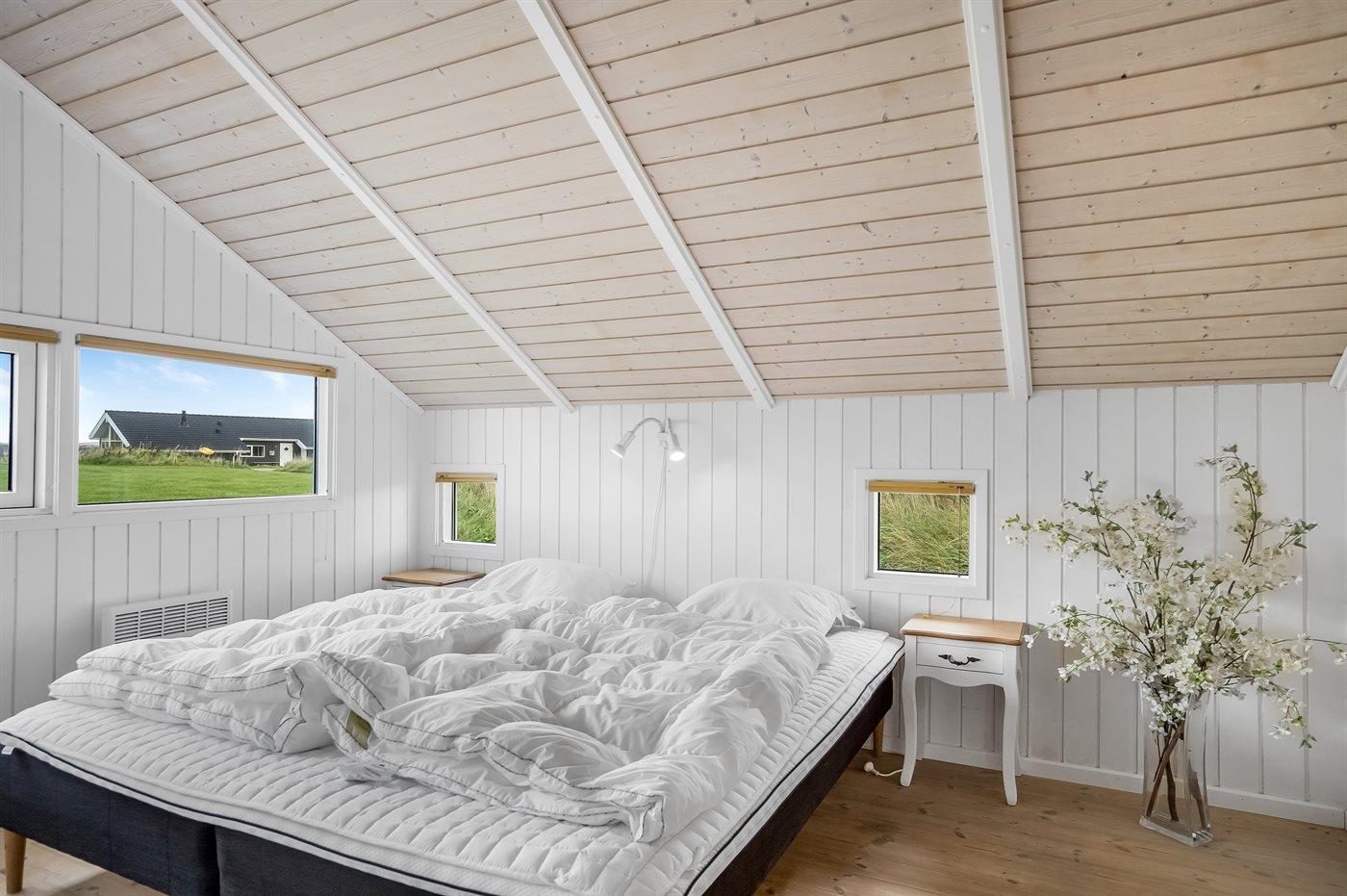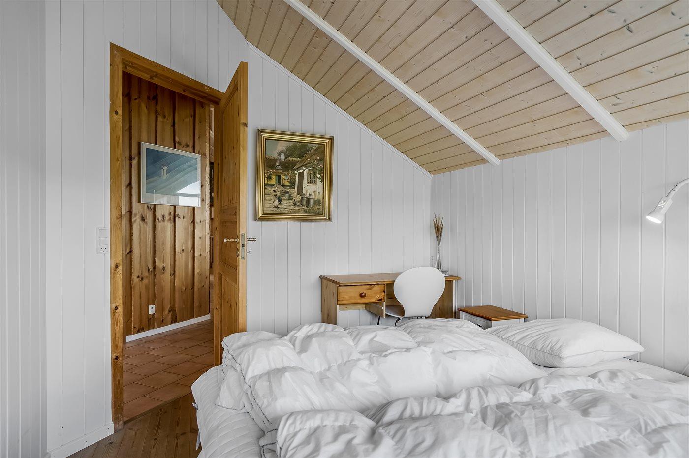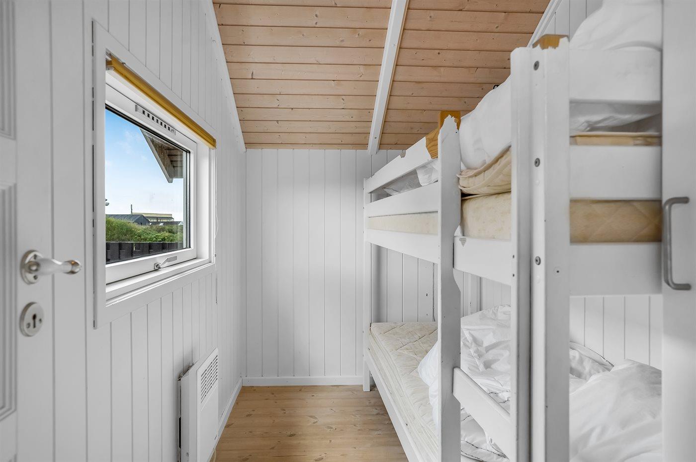 Der er i alt 4 soveværelser. Sovepladserne fordeler sig på: 4 sovepladser i dobbeltsenge. 2 sovepladser i enkeltsenge. 2 sovepladser i køjeseng. Derudover er der 1 stk. barneseng.