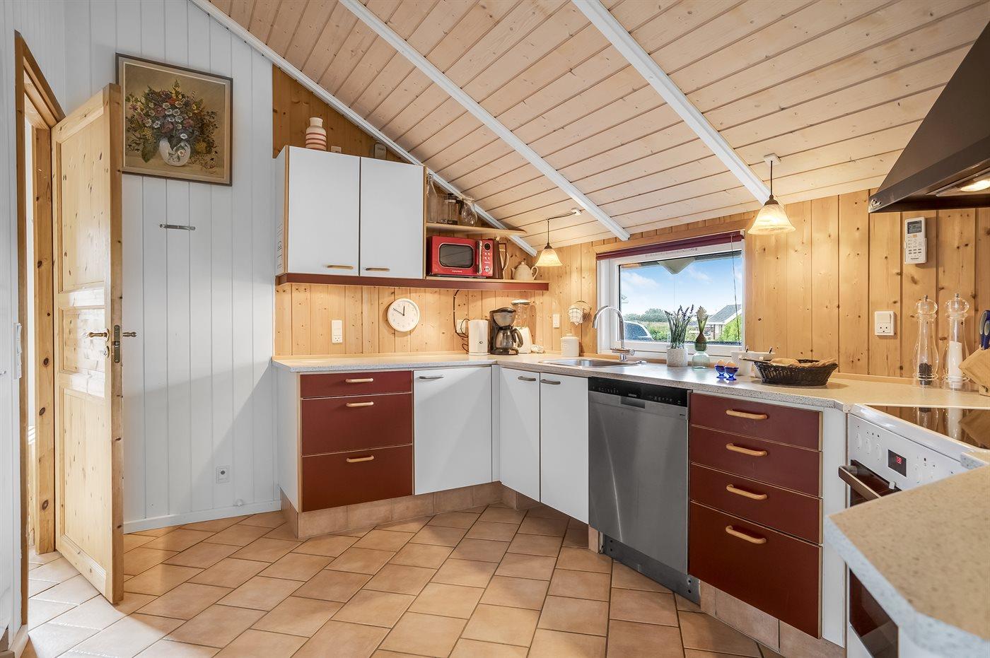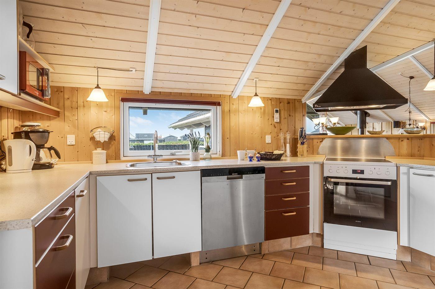 Køkkenet er udstyret med 1 køleskab. Der er 4 keramiske kogeplader, varmluftovn, mikrobølgeovn samt opvaskemaskine.
