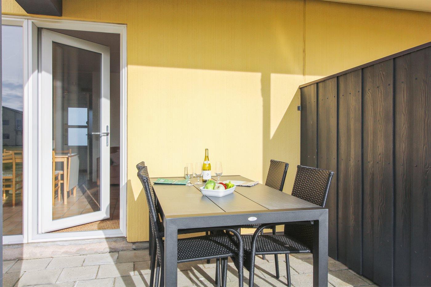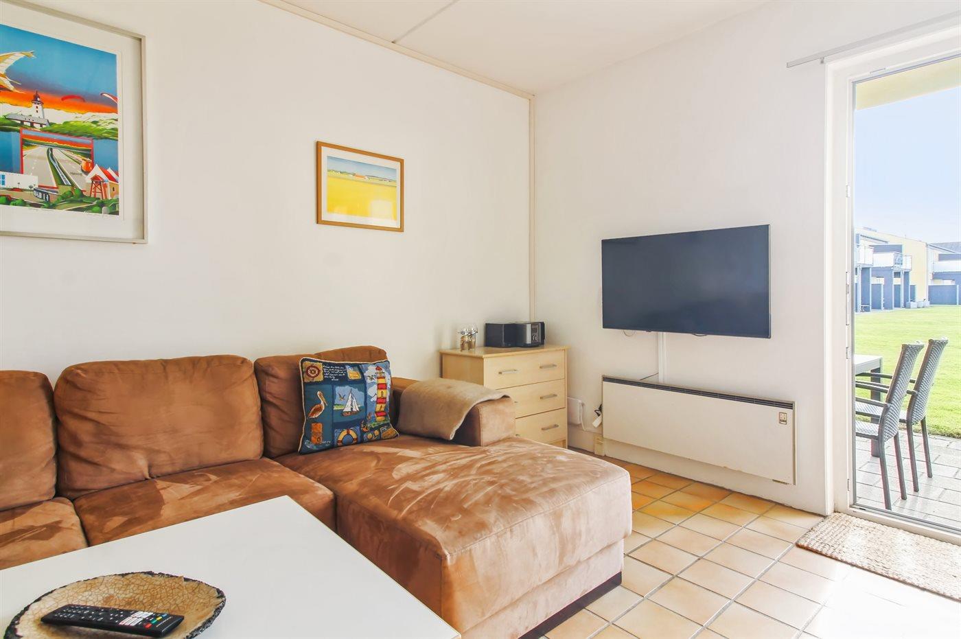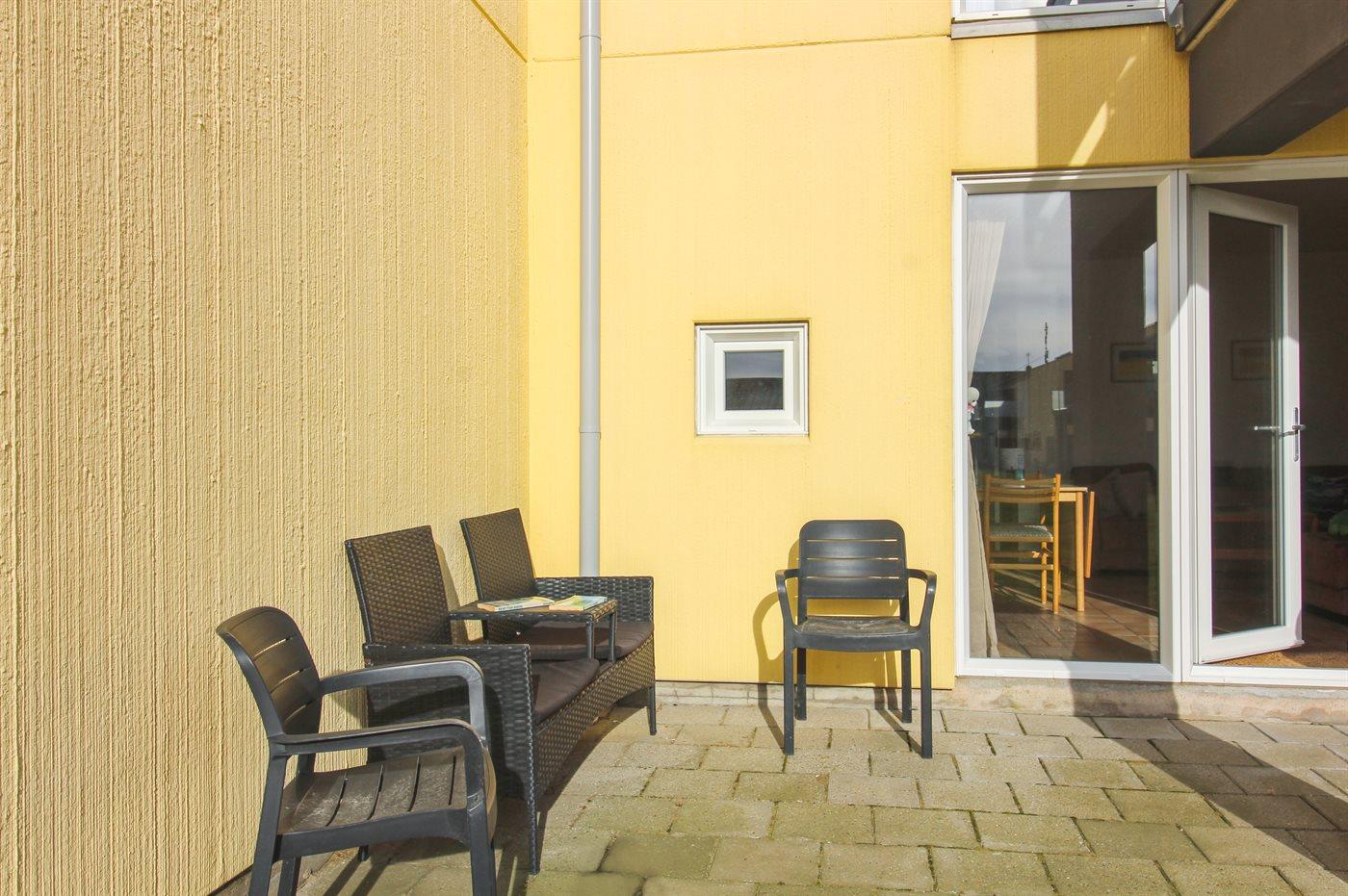 Lejligheden ligger i stueplan og har en skøn terrasse, som er delvist overdækket. Herfra kan man nyde udsigten over vandet og kysten. Lejligheden står flot og indbydende, og her er alle muligheder for en god og afslappende ferie - på alle tider af året.