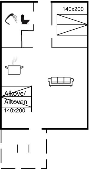 Der er i alt 1 soveværelse. Sovepladserne fordeler sig på: 2 sovepladser i dobbeltseng. 2 sovepladser i alkove.