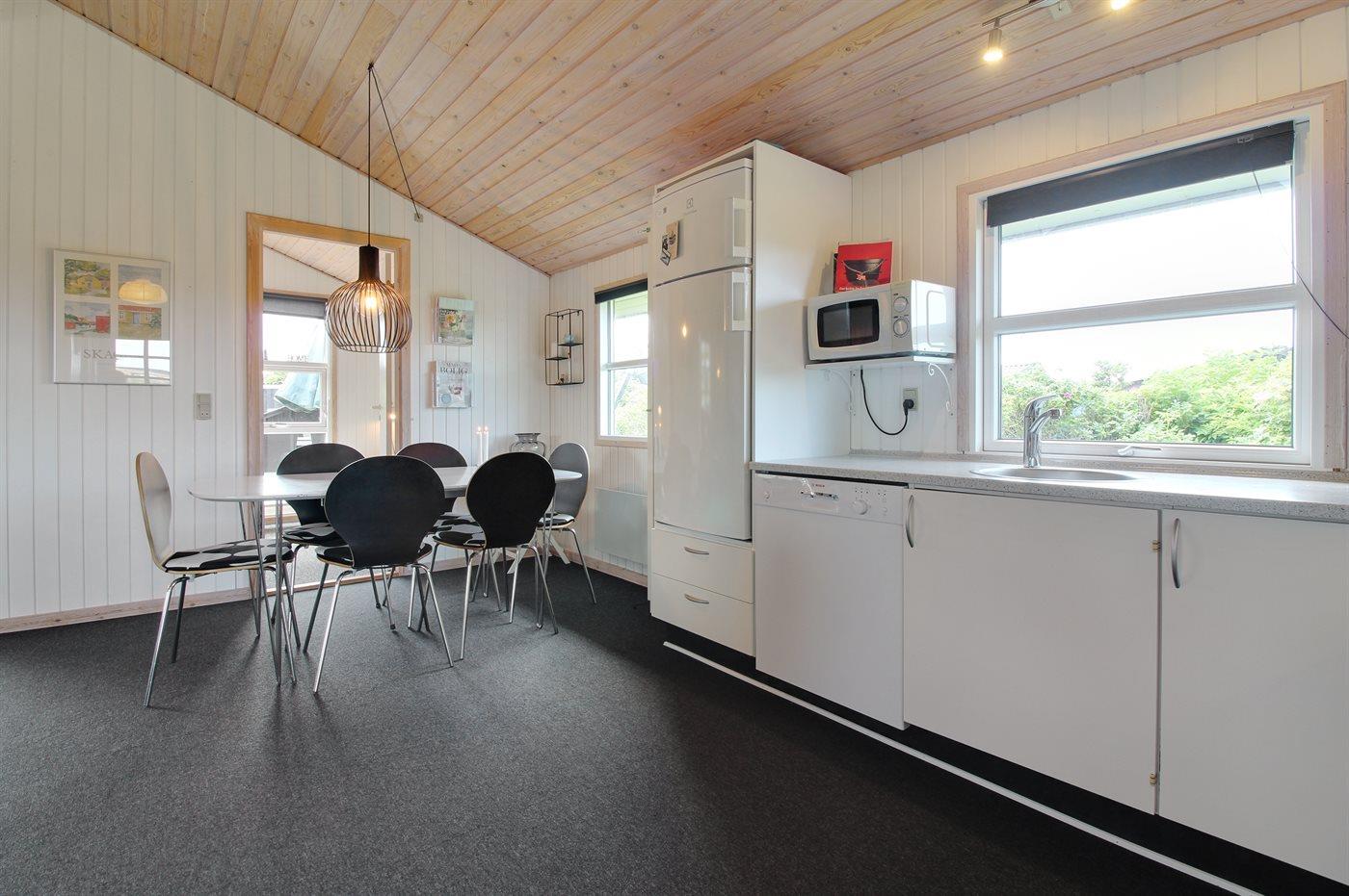 Køkkenet er udstyret med 1 køleskab. Der er 4 keramiske kogeplader, varmluftovn, mikrobølgeovn samt opvaskemaskine.
