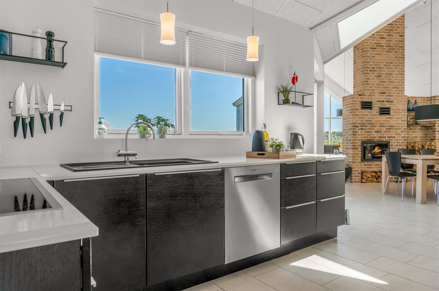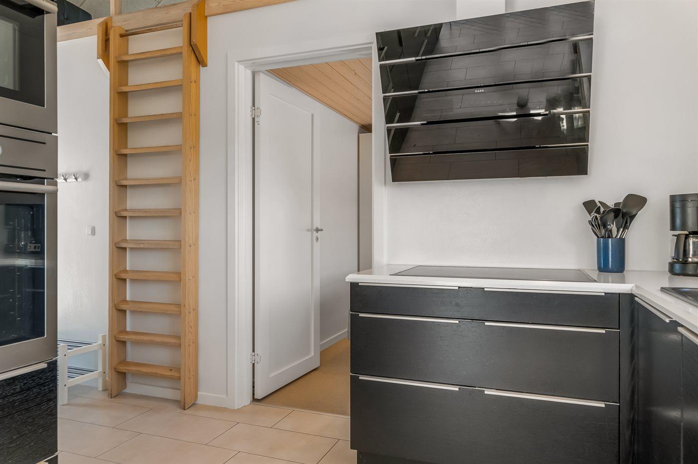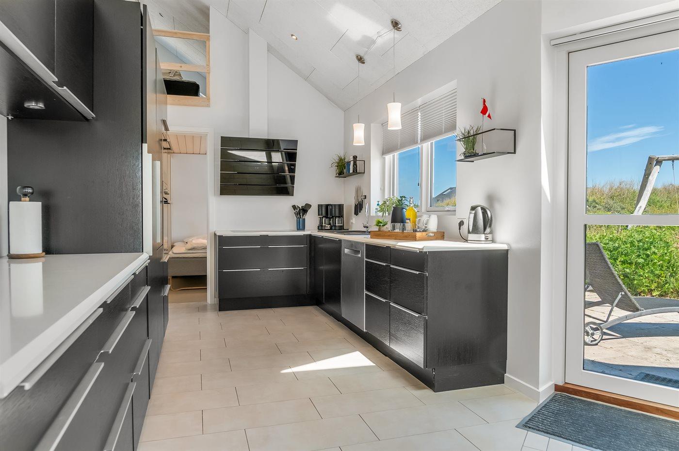 Køkkenet er udstyret med 1 køleskab. Der er 4 keramiske kogeplader, bageovn, varmluftovn, mikrobølgeovn samt opvaskemaskine.